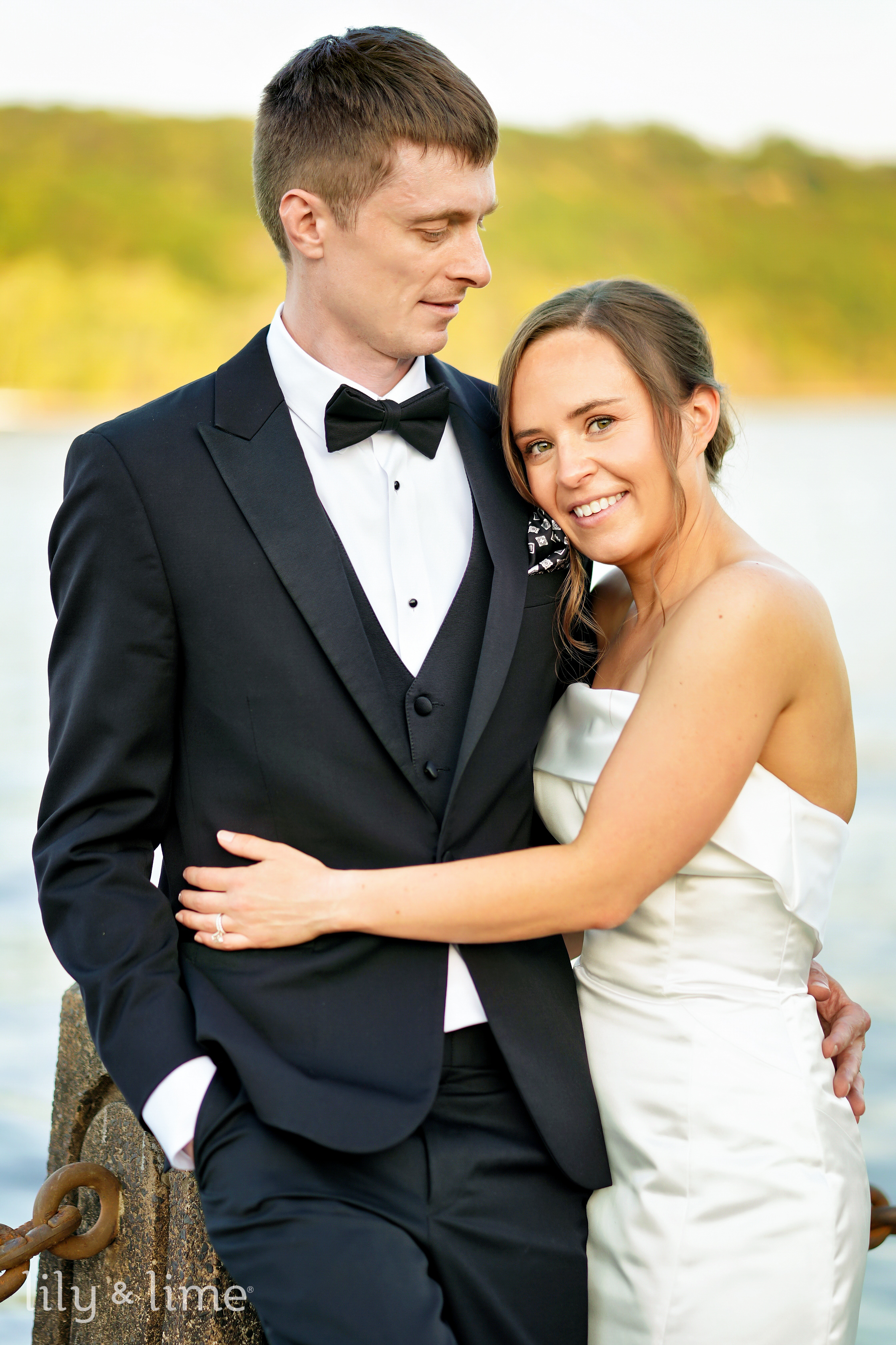 Meanwhile, Andrew exuded classic charm as he got ready in his two-piece black wedding suit. Paired with a crisp white formal shirt, shiny black shoes, a black silk bowtie, and a patterned pocket square, his ensemble was the epitome of dapper sophistication. The morning also included beautiful detail shots of Kelly’s bridal earrings, elegant invitations, chic wedding shoes, and their stunning wedding rings, setting the tone for the day’s elegance.