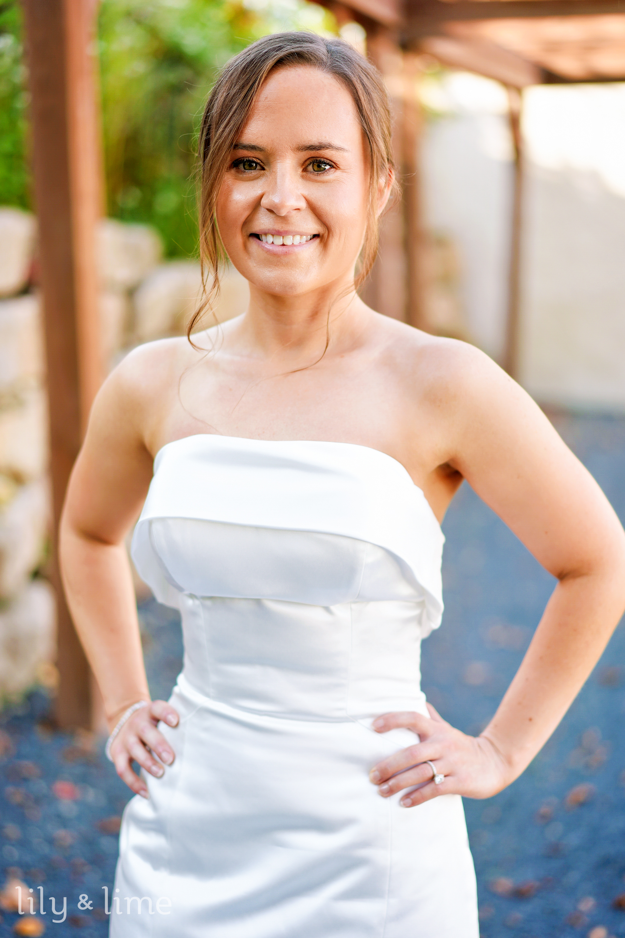 The day began with Andrew and Kelly getting-ready photos in their respective suites, surrounded by their closest friends and family. Kelly’s suite was filled with excitement and joy as she prepared for her big day. Her chic strapless wedding dress, featuring a long train and a buttoned-down back, was a vision of timeless elegance. She opted for a sophisticated bridal bun hairstyle, a no-jewelry look that highlighted her natural beauty, and a stunning blue wedding bouquet. Her neutral bridal makeup added a soft and radiant touch, perfectly complementing her overall look.