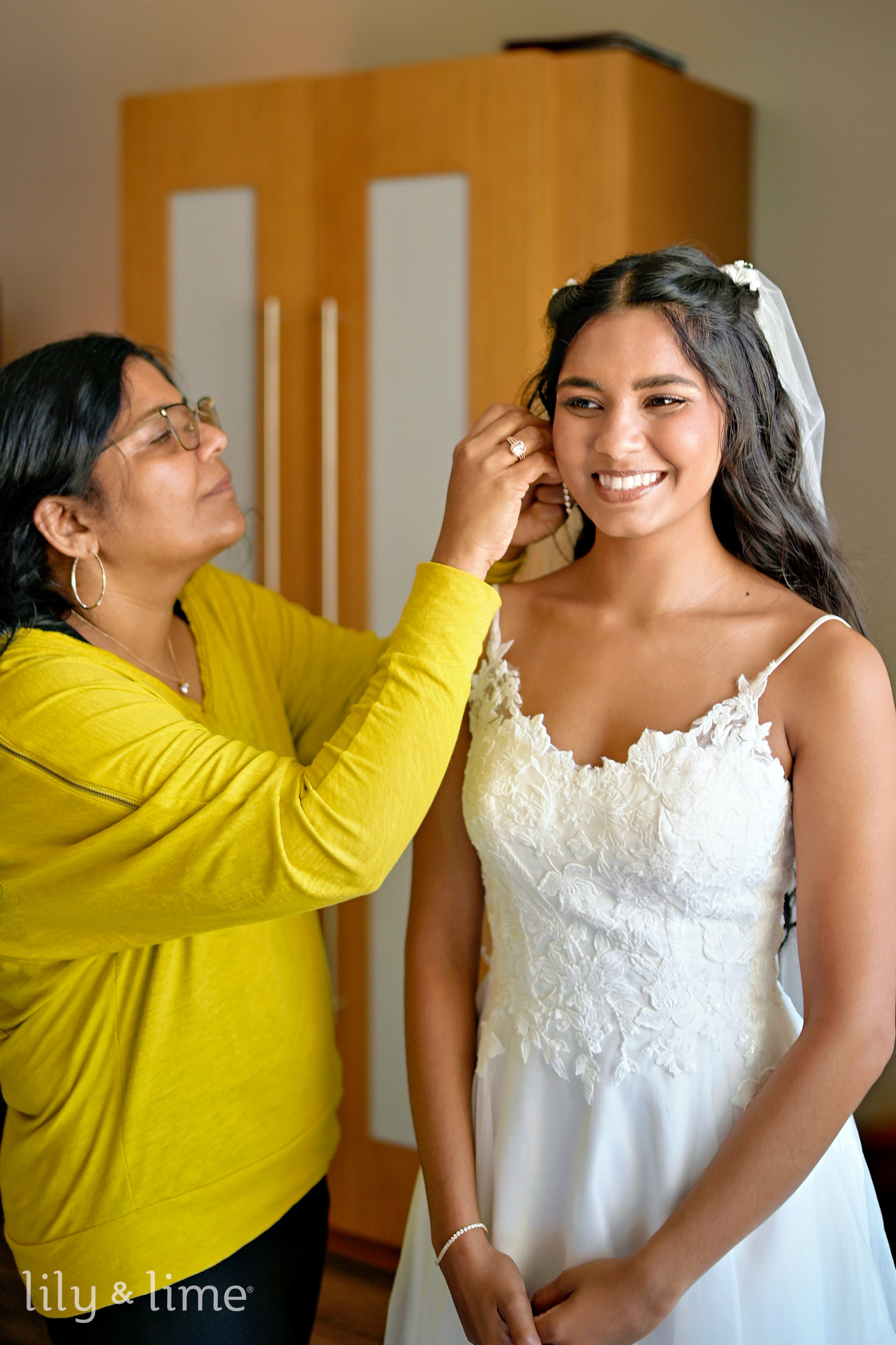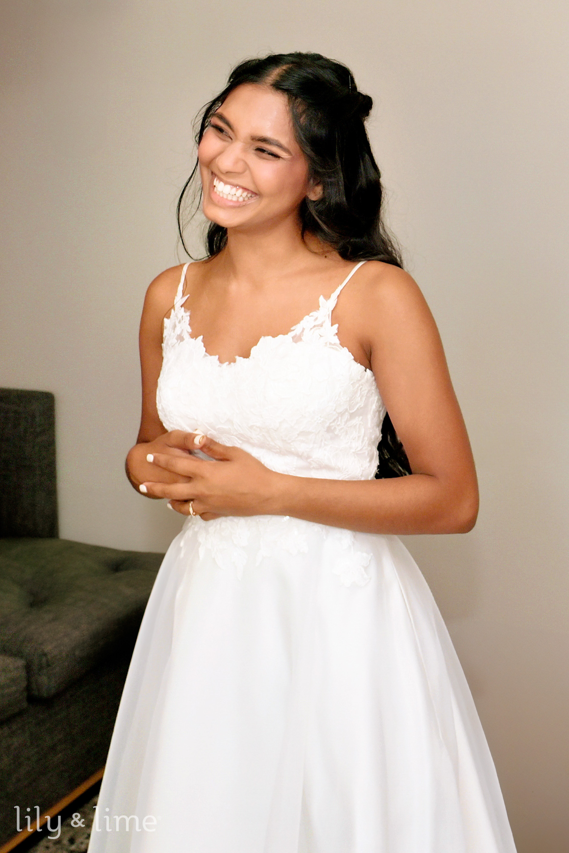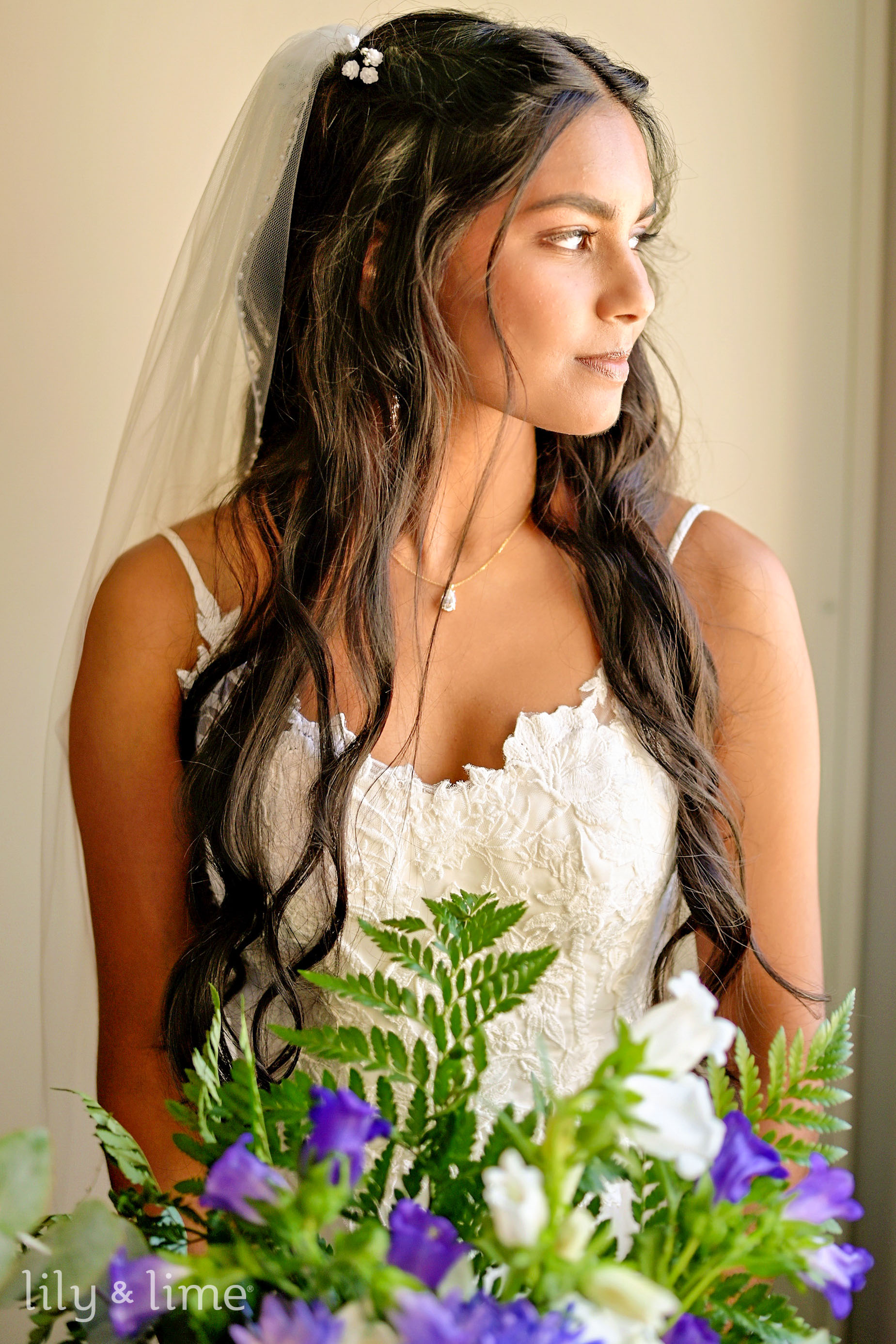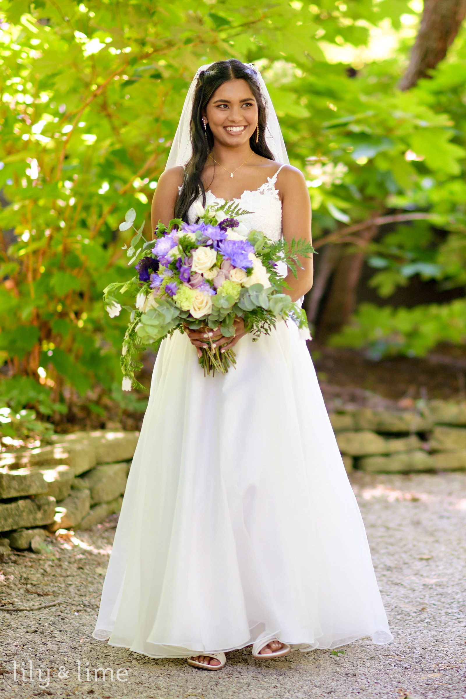 Throughout, the details told the story of their big day. The bridal bouquet—a stunning blend of purple, white, and green—sat alongside beautifully designed invitation suites and sparkling bridal jewelry, each photograph capturing the care Ruth had poured into her wedding. Dressed in her A-line wedding dress with a lace neckline, swooping V-back, and intricate embroidery, Ruth looked radiant. Her hairstylist had woven white floral accessories into soft waves, a cathedral-length veil flowing behind her. Neutral makeup completed the look, and the moments shared during her bridesmaid first look brought tears and smiles all around.