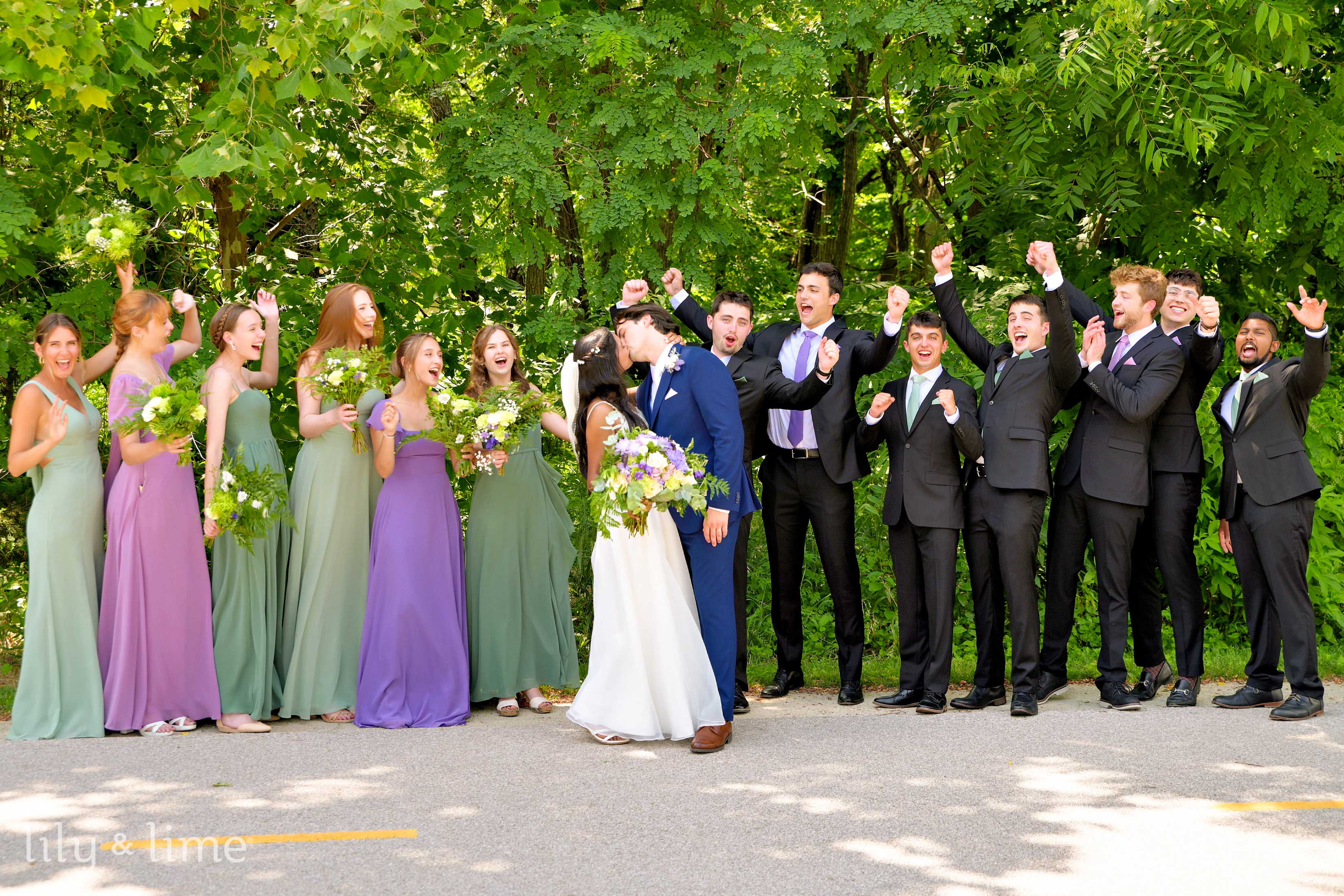 Jack mirrored her elegance in a three-piece blue wedding suit adorned with a crisp white shirt, a matching boutonniere, and polished brown shoes. His groomsmen, dressed in sleek black suits with lavender and green ties, added to the striking visual harmony.