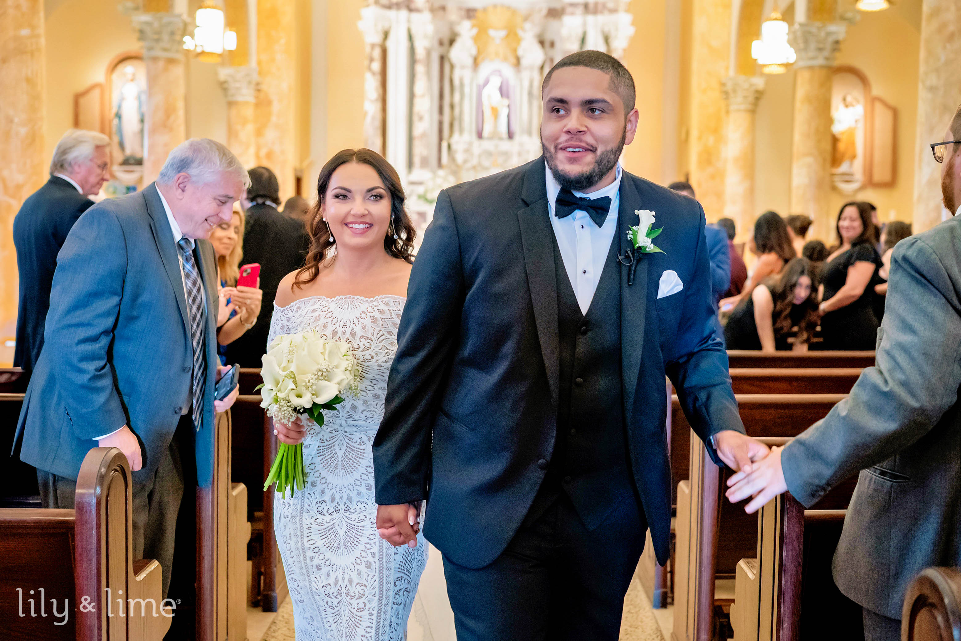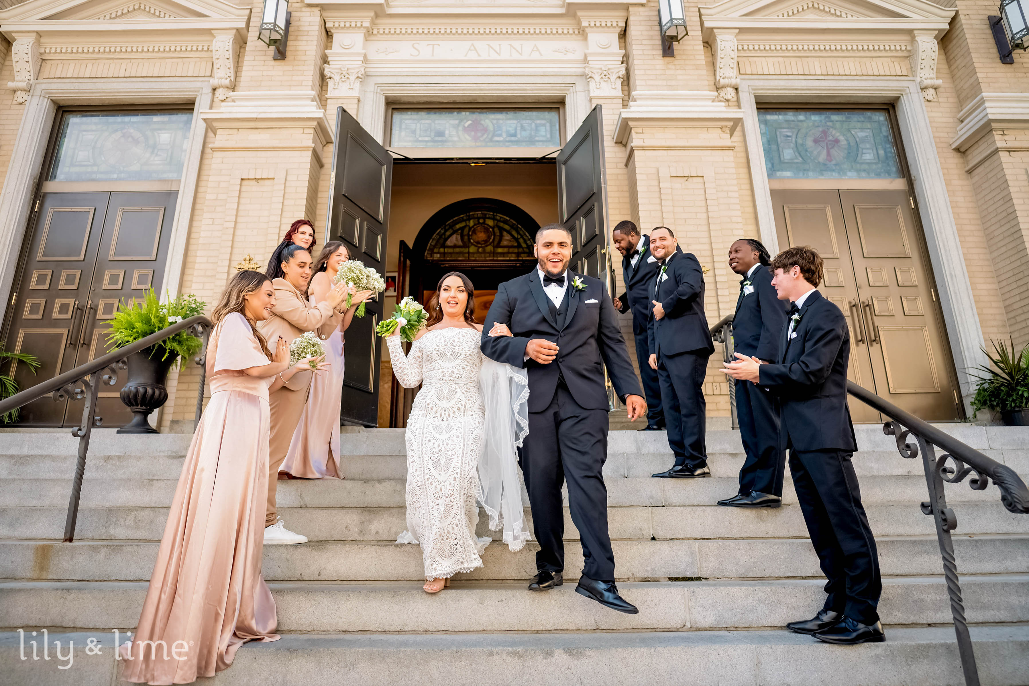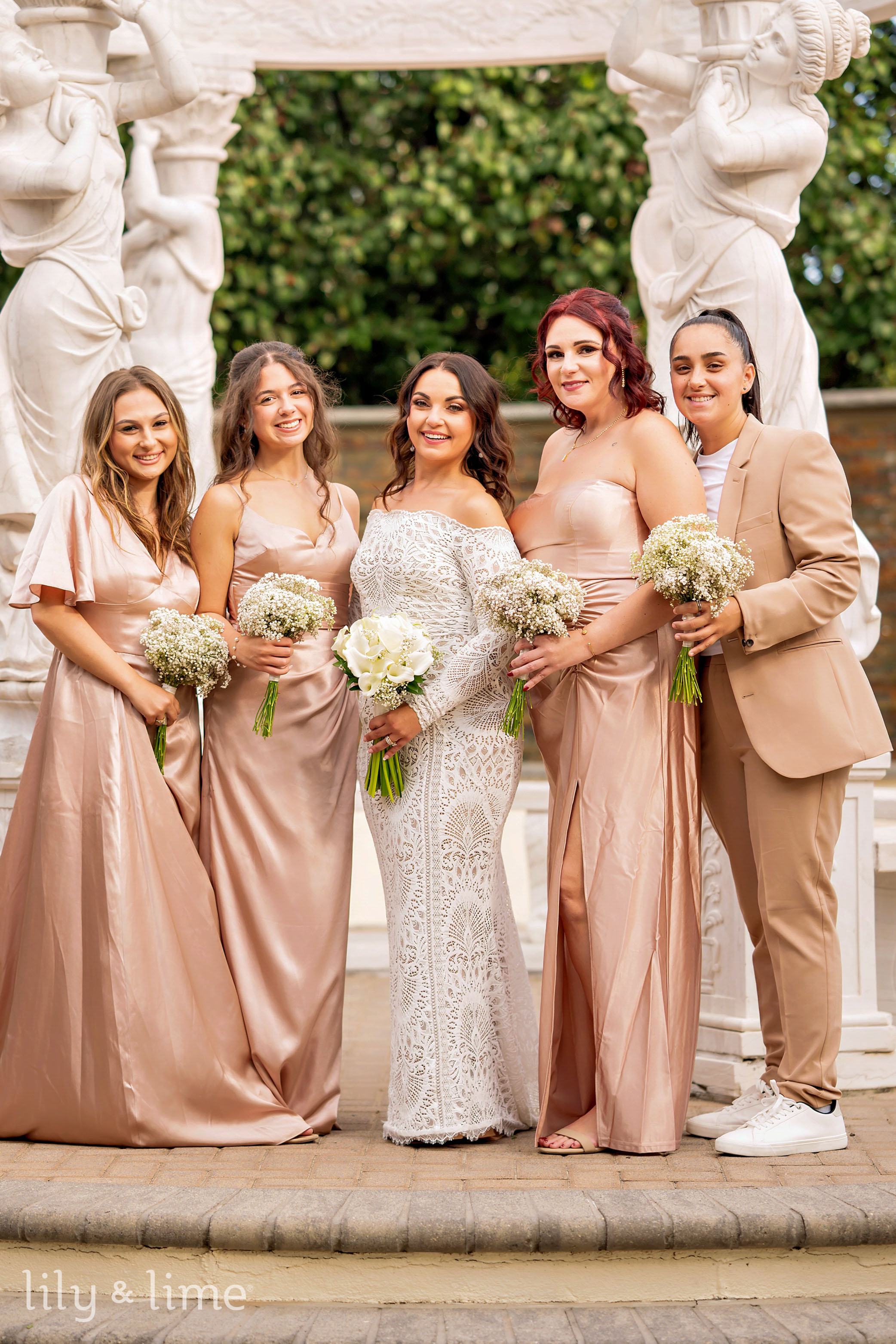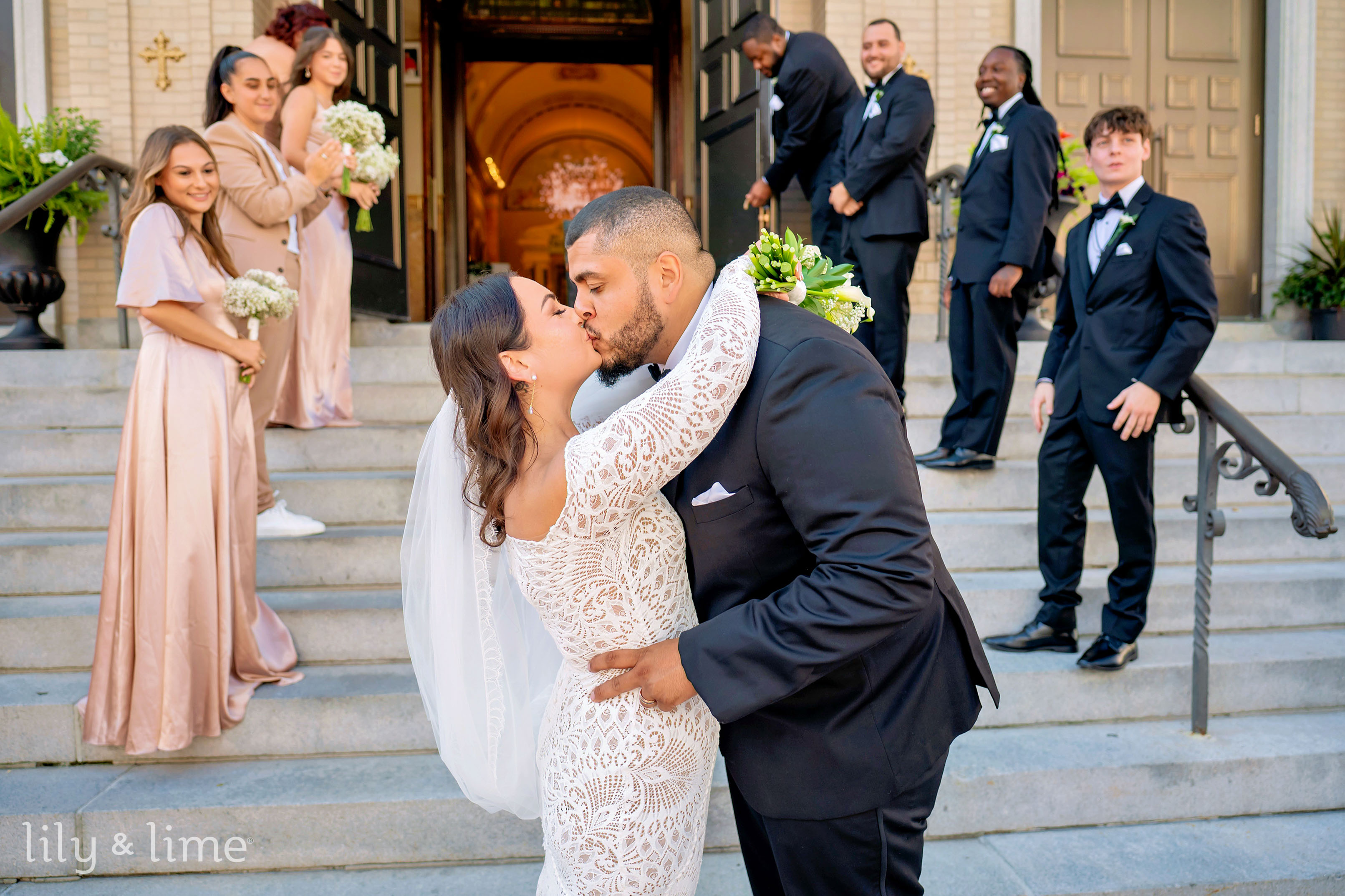 The getting-ready details were nothing short of exquisite. Samantha’s chic lace wedding dress, with its long sleeves, off-the-shoulder design, and fit-and-flare silhouette, was the centerpiece of the bridal suite. Her ensemble featured thoughtful touches like delicate bridal jewelry, a cascading cathedral-length veil, and an all-white bouquet for just the right hint of sophistication. Her neutral yet polished makeup and effortlessly styled open hair added a timeless allure to her look. On the groom’s side, Daniel embodied classic elegance in a tailored three-piece black suit, complete with a crisp white shirt, black silk bowtie, shiny formal shoes, and a white floral boutonniere. The bridesmaids complemented the couple perfectly in pale pink satin dresses paired with matching white bouquets, while the groomsmen were equally dashing in stylish black suits.