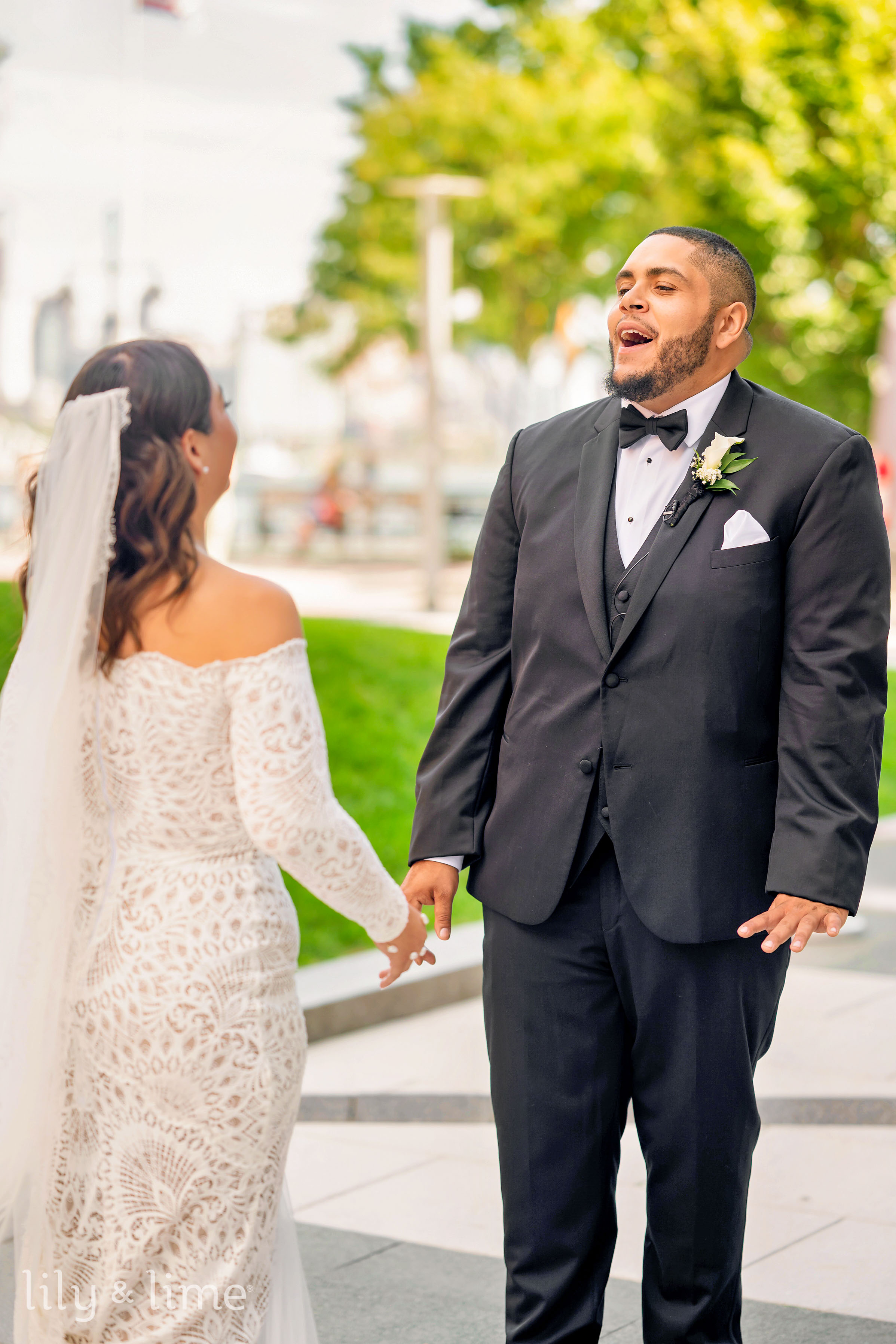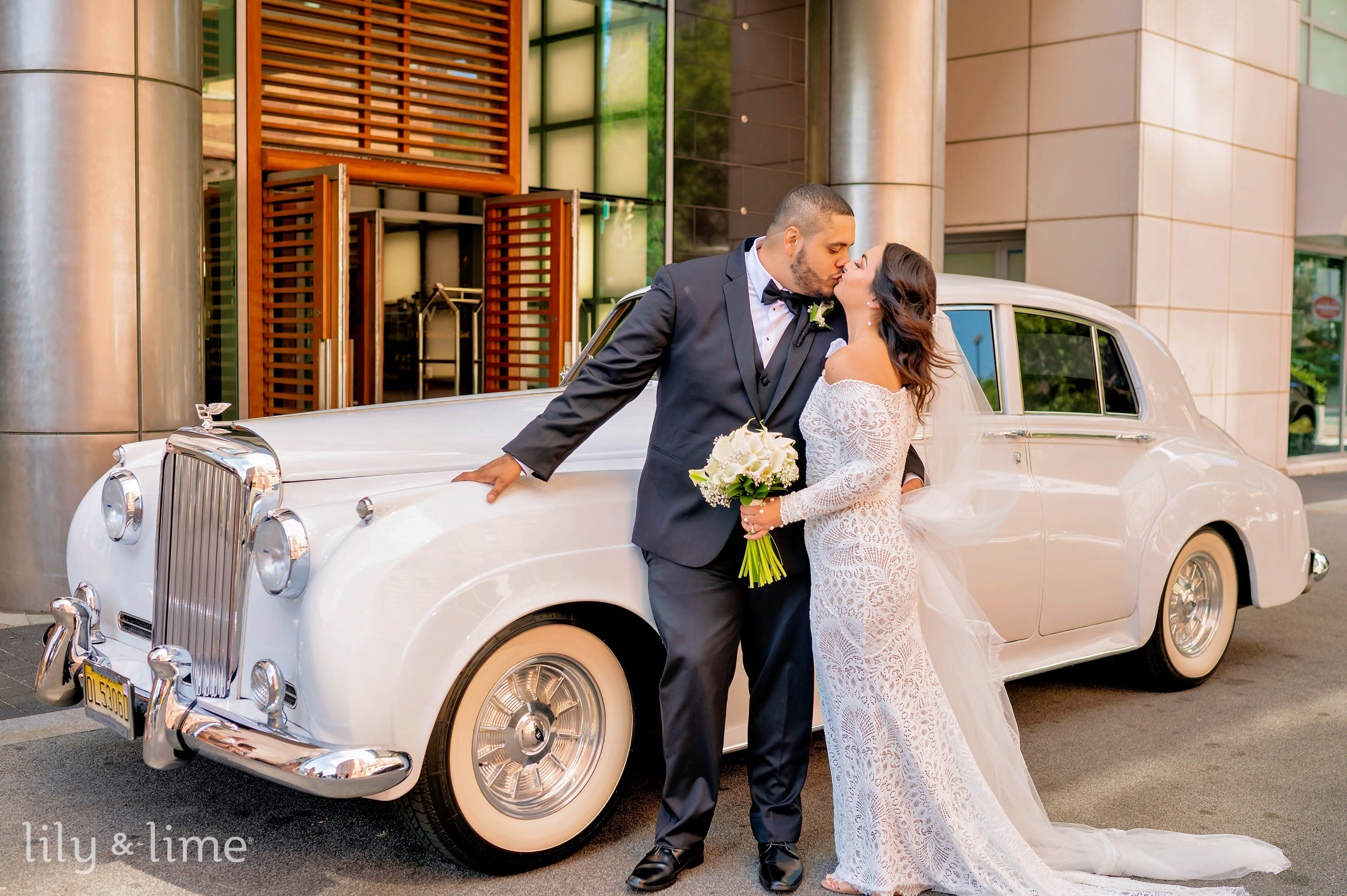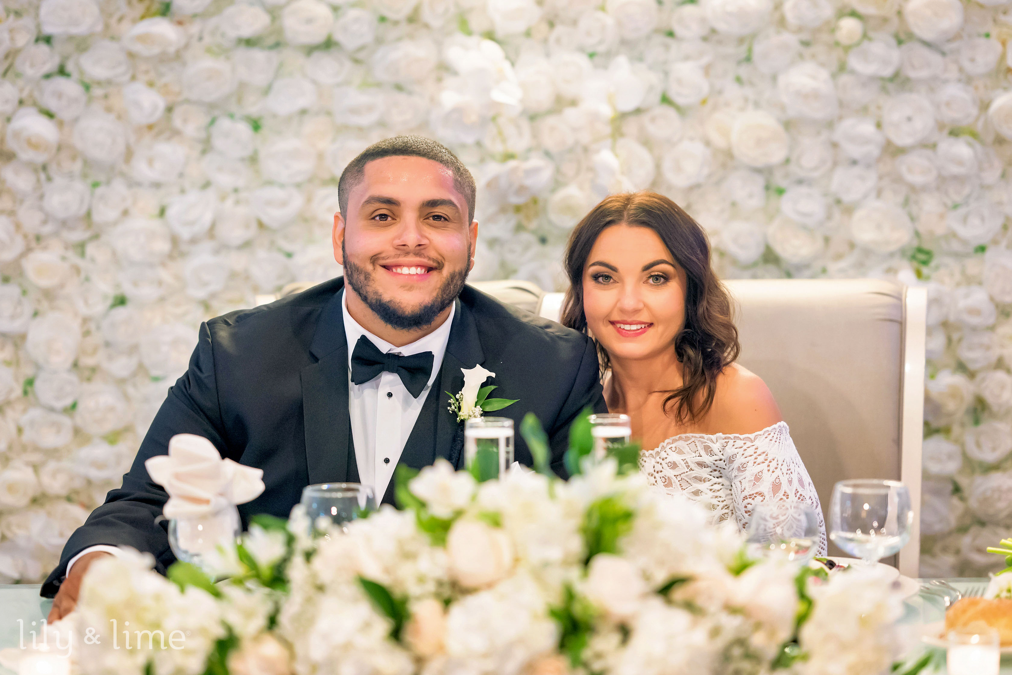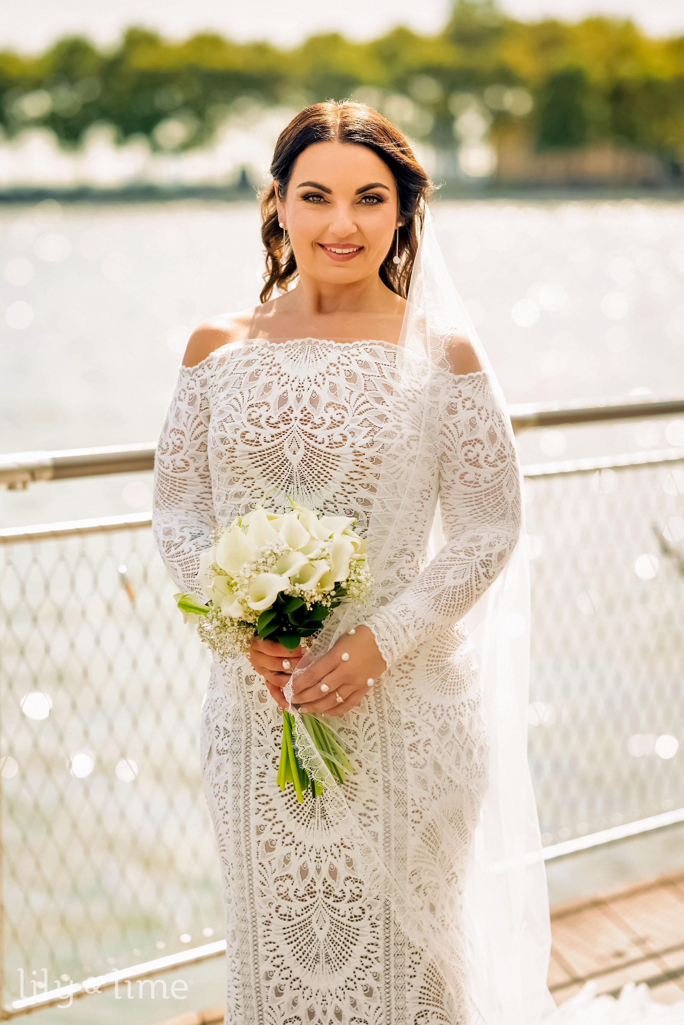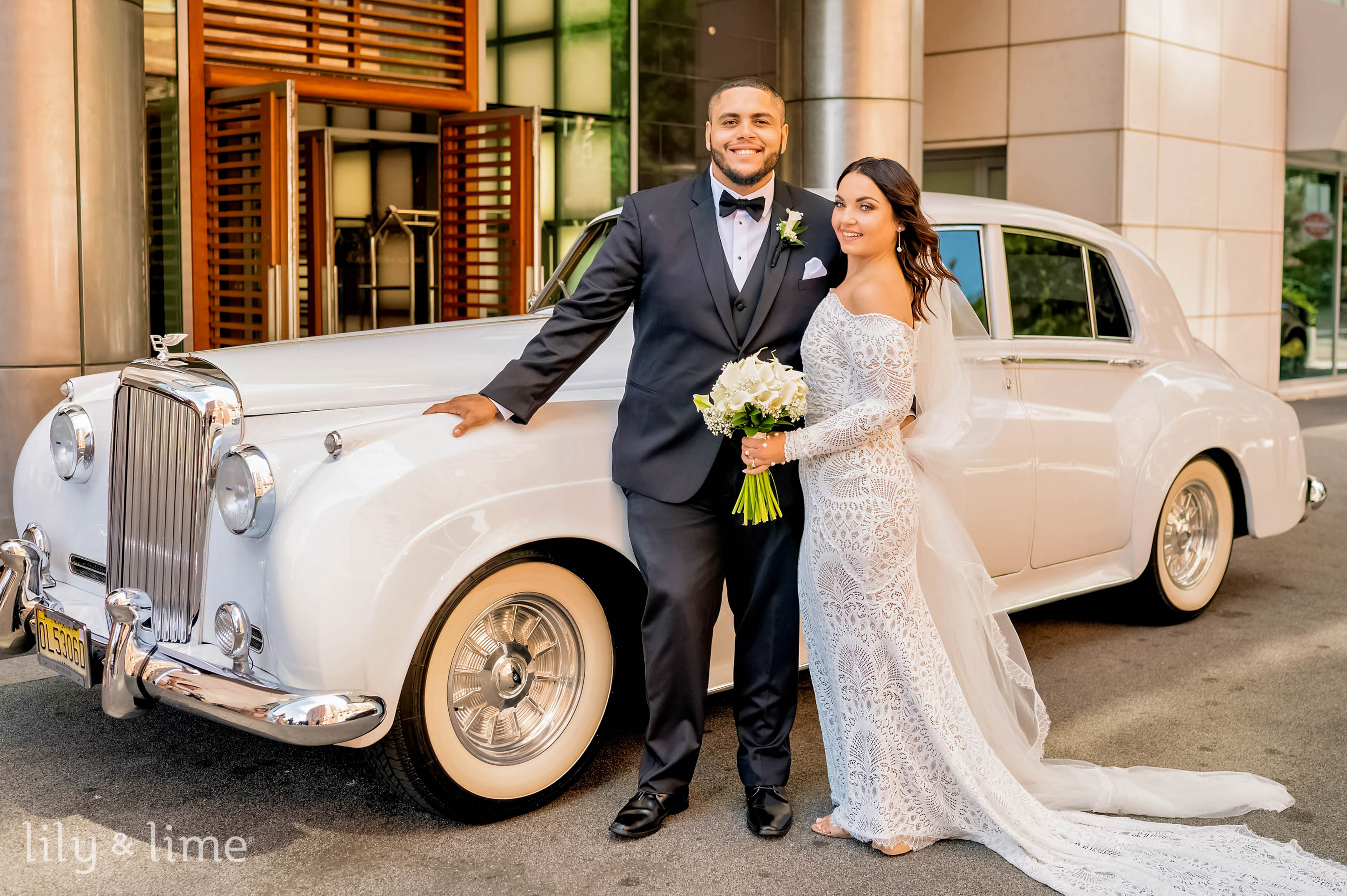 The getting-ready details were nothing short of exquisite. Samantha’s chic lace wedding dress, with its long sleeves, off-the-shoulder design, and fit-and-flare silhouette, was the centerpiece of the bridal suite. Her ensemble featured thoughtful touches like delicate bridal jewelry, a cascading cathedral-length veil, and an all-white bouquet for just the right hint of sophistication. Her neutral yet polished makeup and effortlessly styled open hair added a timeless allure to her look. On the groom’s side, Daniel embodied classic elegance in a tailored three-piece black suit, complete with a crisp white shirt, black silk bowtie, shiny formal shoes, and a white floral boutonniere. The bridesmaids complemented the couple perfectly in pale pink satin dresses paired with matching white bouquets, while the groomsmen were equally dashing in stylish black suits.