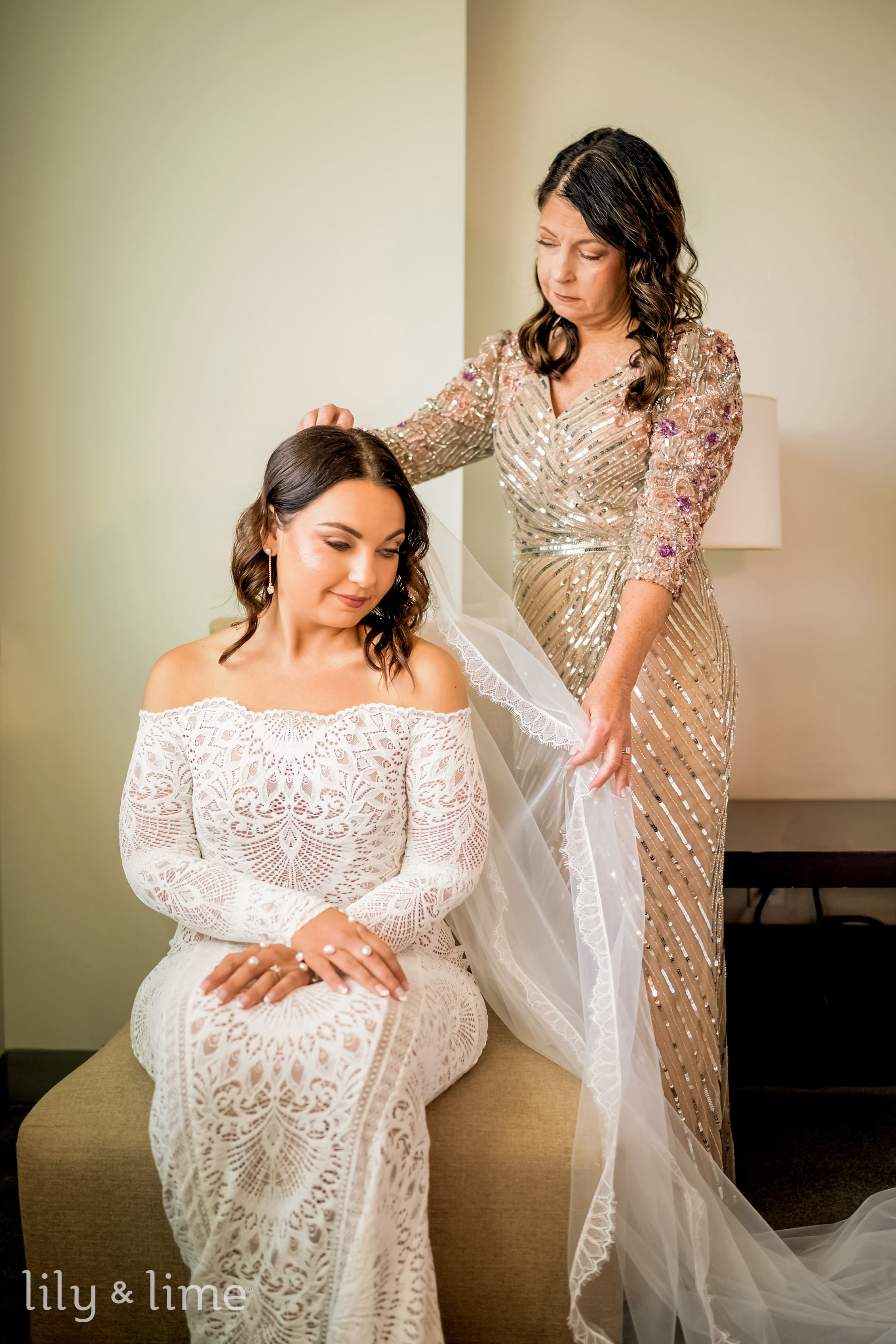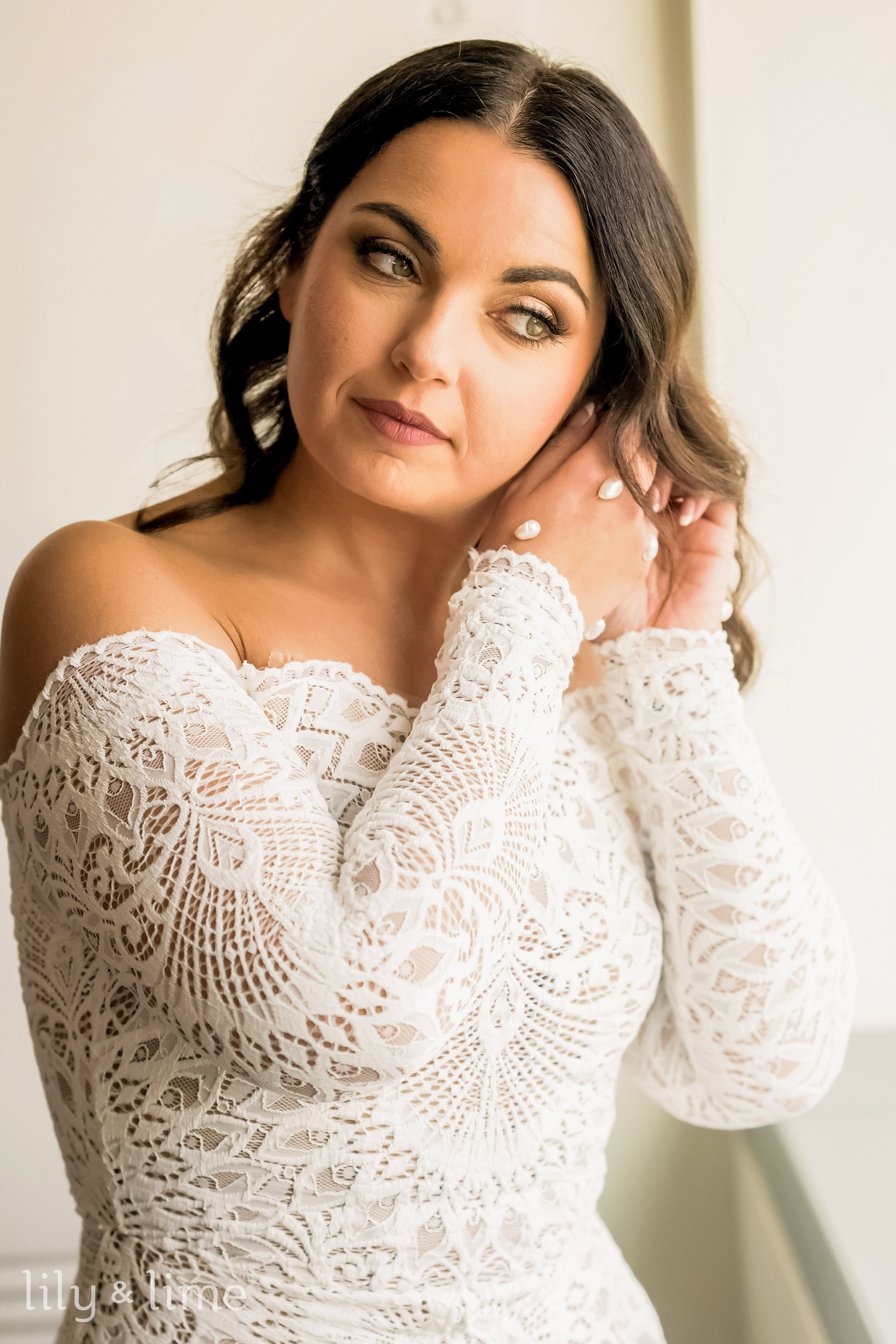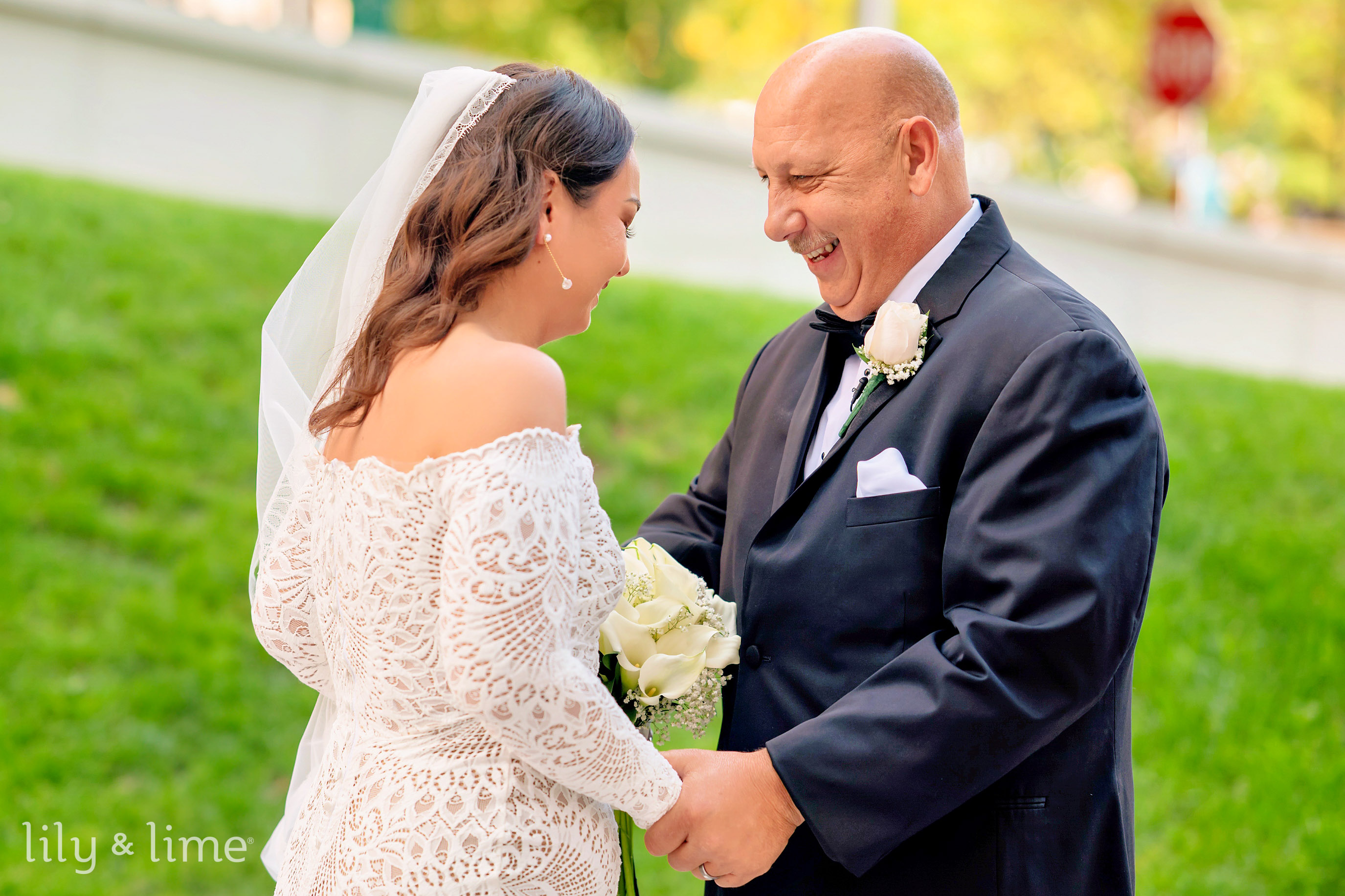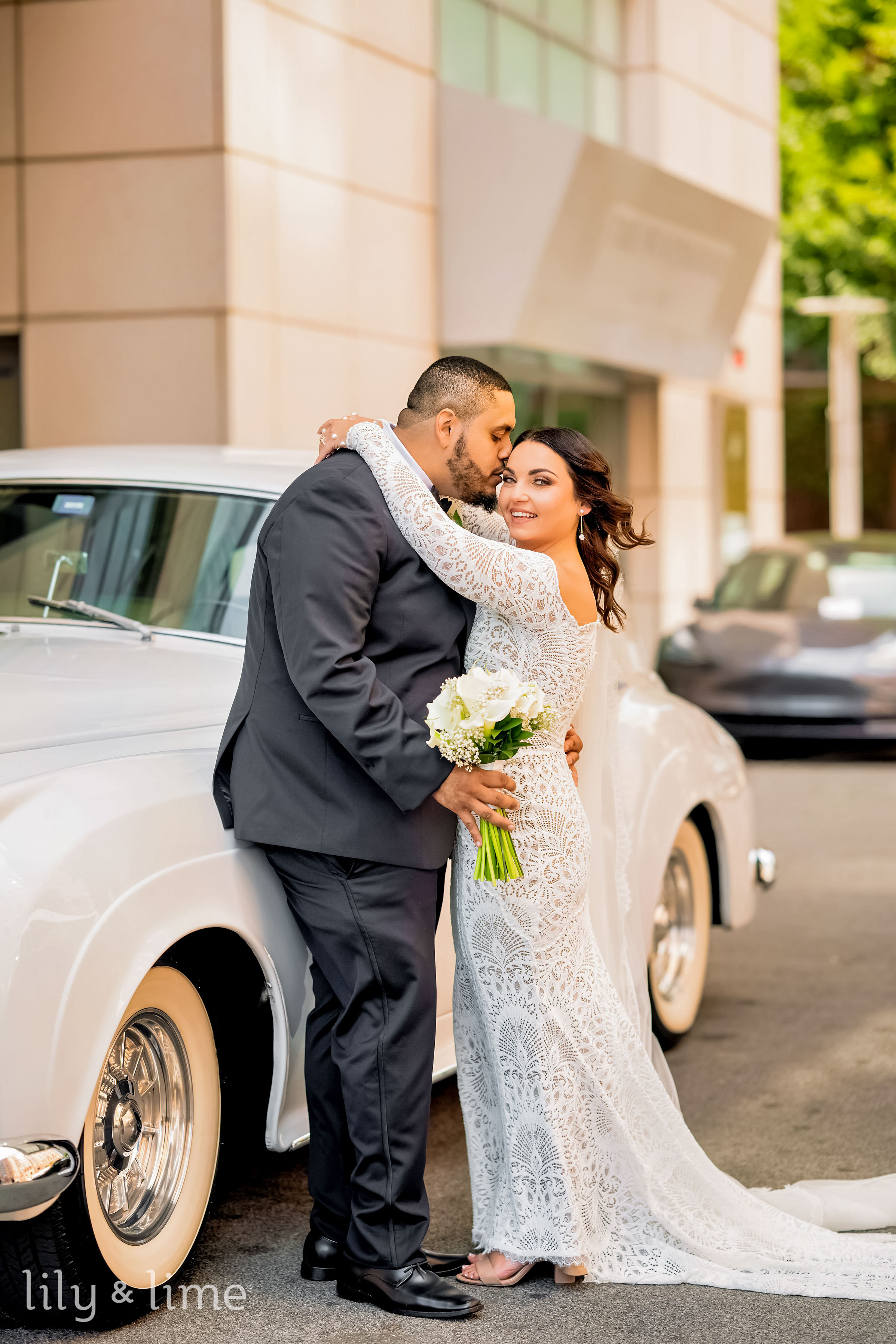 The getting-ready details were nothing short of exquisite. Samantha’s chic lace wedding dress, with its long sleeves, off-the-shoulder design, and fit-and-flare silhouette, was the centerpiece of the bridal suite. Her ensemble featured thoughtful touches like delicate bridal jewelry, a cascading cathedral-length veil, and an all-white bouquet for just the right hint of sophistication. Her neutral yet polished makeup and effortlessly styled open hair added a timeless allure to her look. On the groom’s side, Daniel embodied classic elegance in a tailored three-piece black suit, complete with a crisp white shirt, black silk bowtie, shiny formal shoes, and a white floral boutonniere. The bridesmaids complemented the couple perfectly in pale pink satin dresses paired with matching white bouquets, while the groomsmen were equally dashing in stylish black suits.