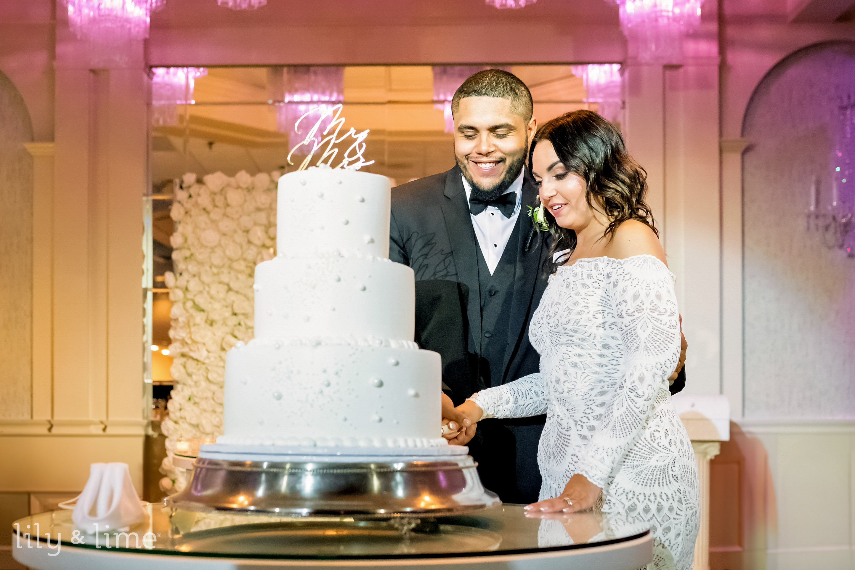 The celebration continued with an enchanting indoor reception, where every detail spoke of thoughtful sophistication. The sweetheart table stood out with its elegant floral backdrop, while gold-accented welcome tables and neon signage served as focal points, blending modernity with warmth. Guests were greeted by stunning tablescapes featuring white florals, greenery centerpieces, and elegant table numbers. Highlights included a fireworks and smoke display that added an ethereal touch to the festivities. The all-white wedding cake, topped with a gold “Mr & Mrs” topper, stood as a symbolic centerpiece to the celebration’s beauty.