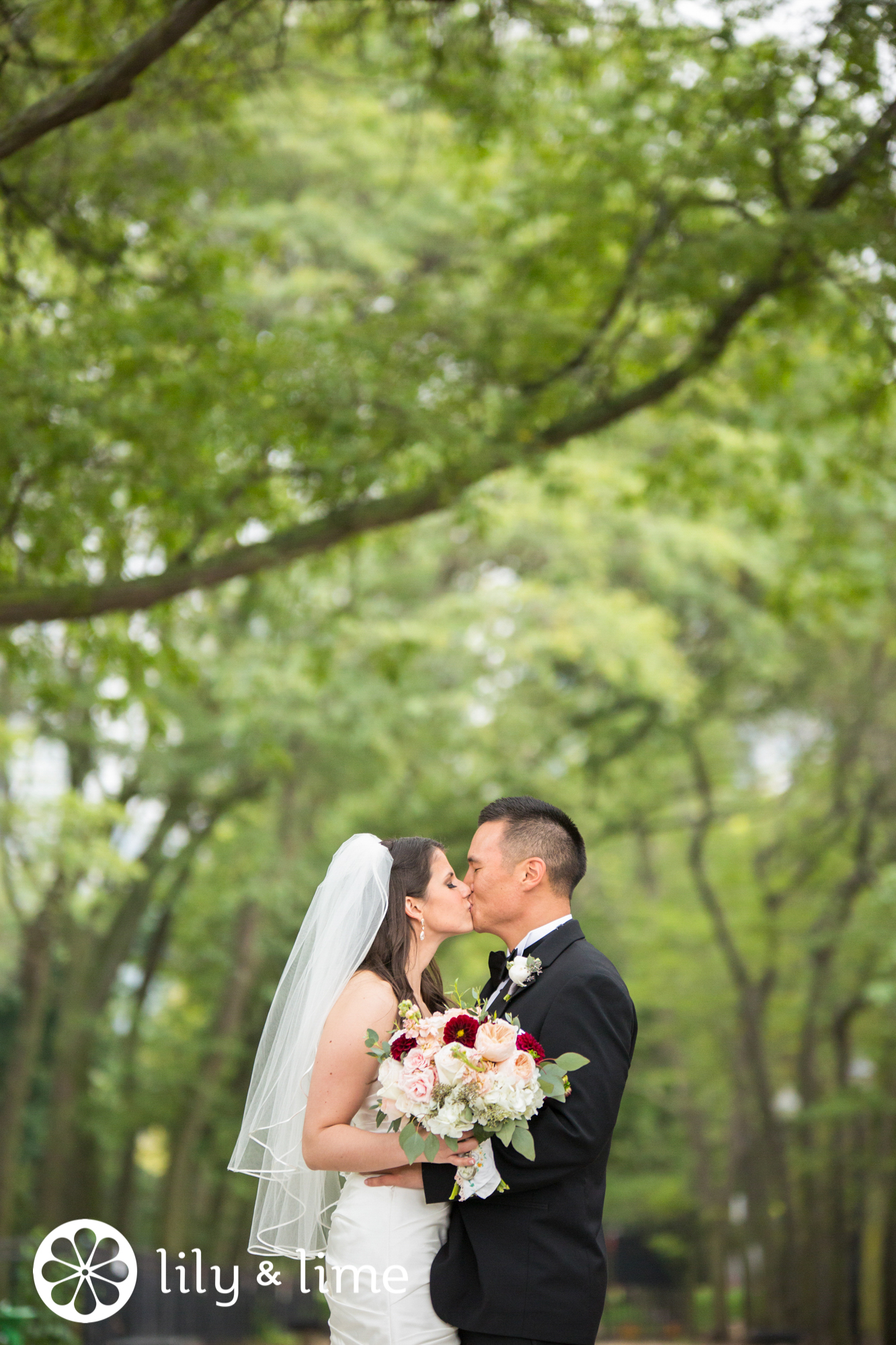 If the forecast begins to show rain in the days leading up to your wedding, consider getting an umbrella to use both for function and as a prop! Elizabeth and Chuck braved the drizzle to capture some beautiful shots with their wedding photographer. The umbrella added visual interest while staying within the couple’s classic theme and wedding colors!