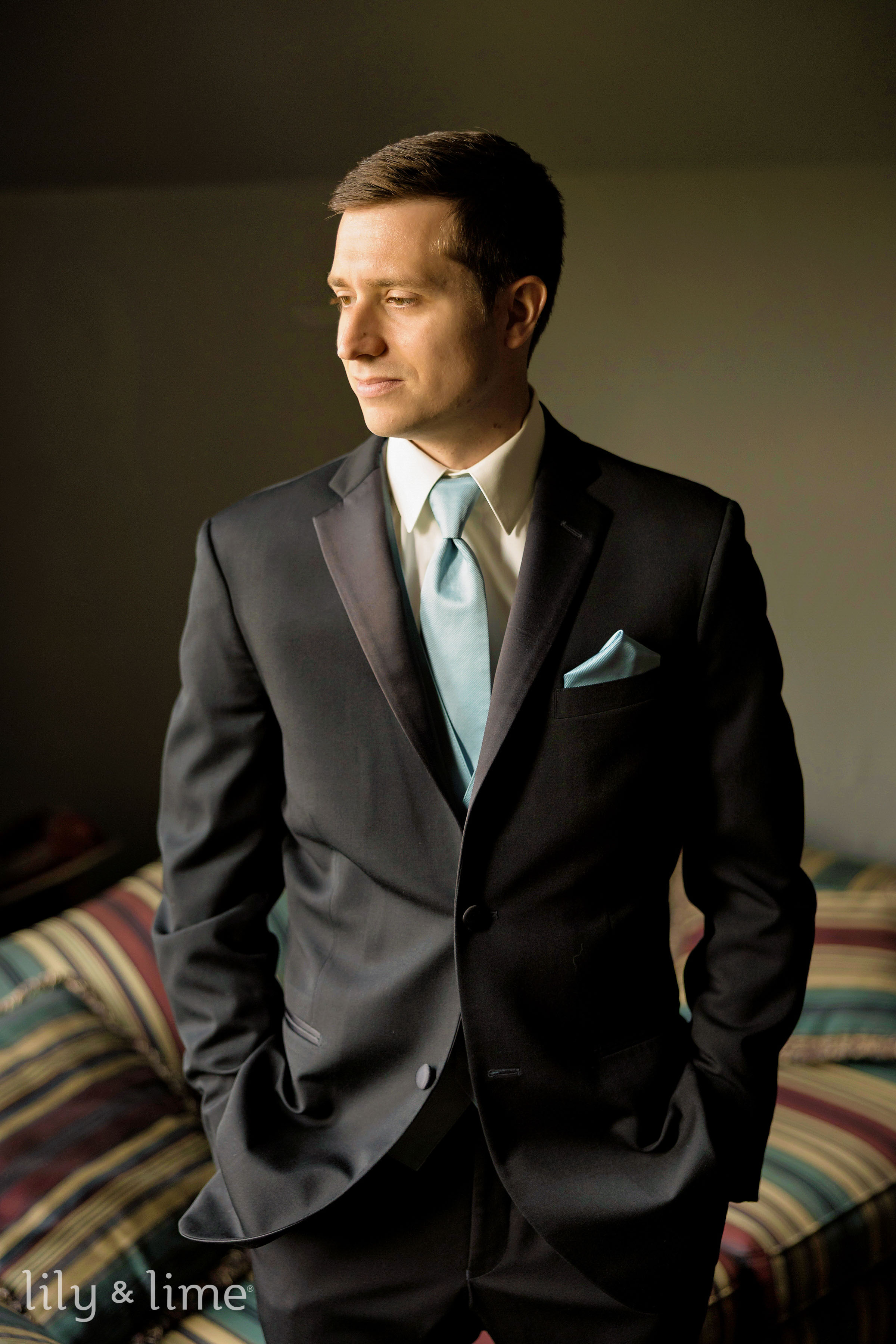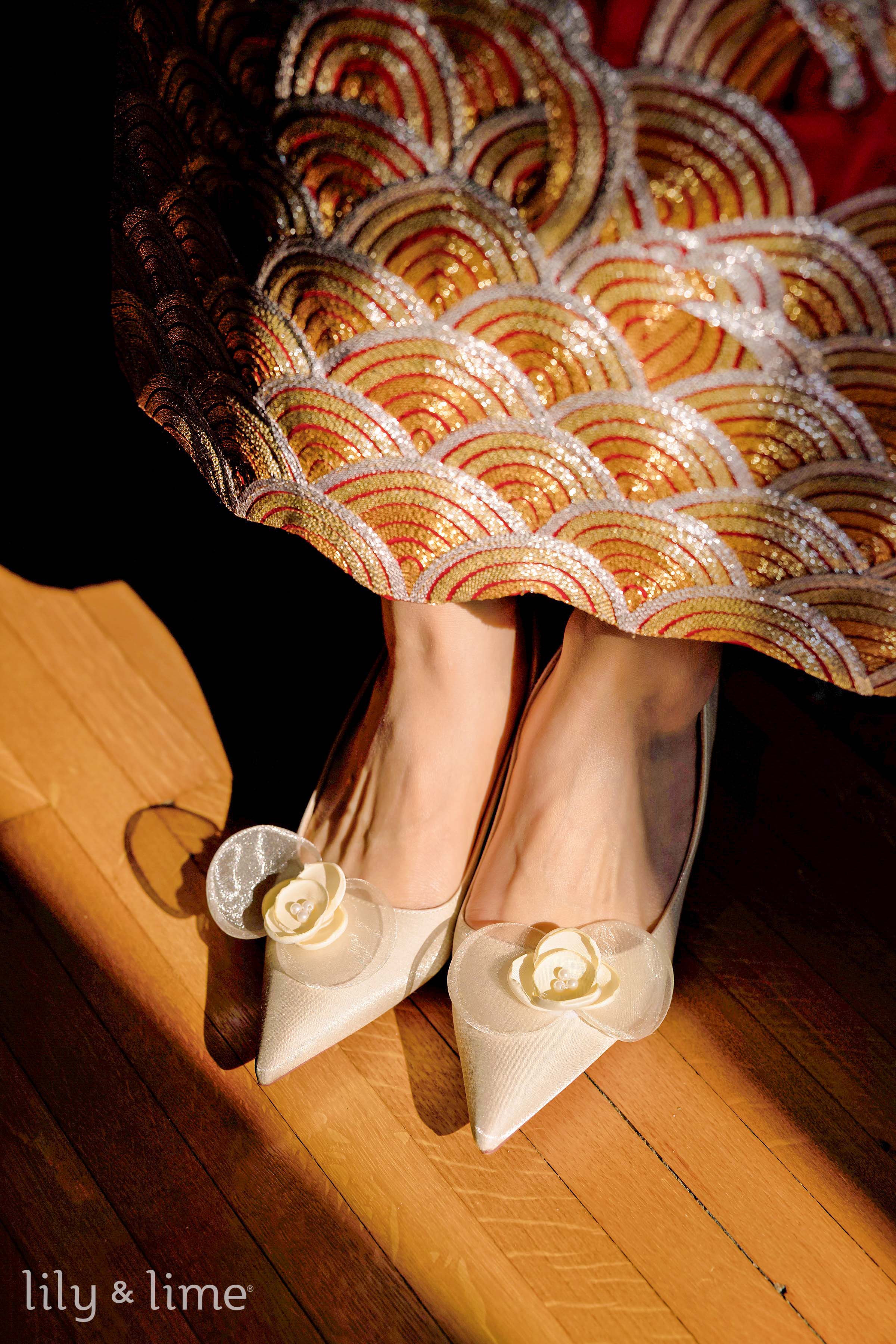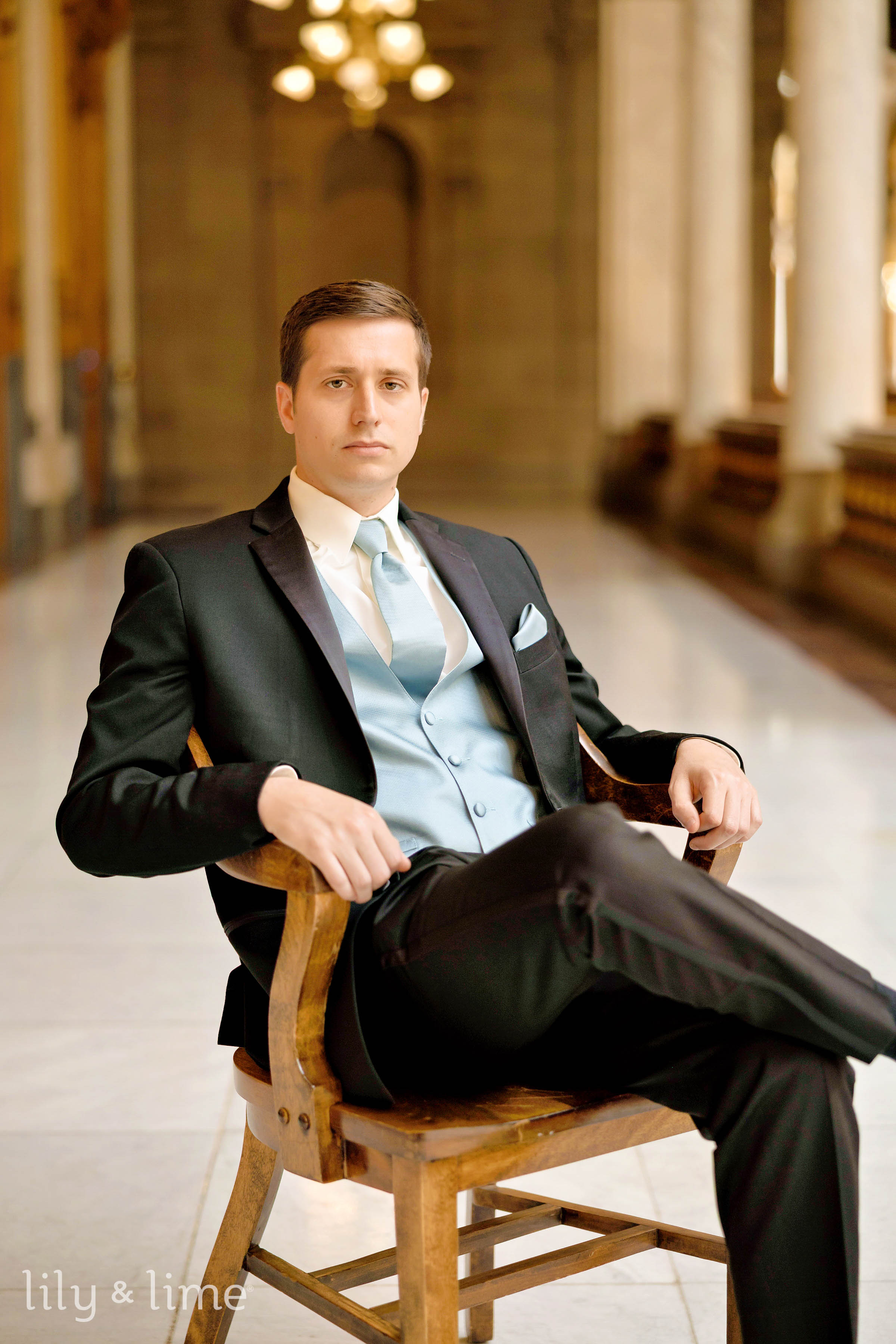After the tea ceremony, Siqi and Sam transitioned into their formal wedding attire for the main ceremony. Siqi was a vision of chic elegance in her halter-neck wedding dress, which featured delicate floral embroidery, a dramatic long train, and a buttoned-down back. Her bridal bun, fingertip veil, and neutral makeup further enhanced her sophisticated look. Siqi’s eco-friendly bouquet, made of faux flowers, not only added a meaningful green touch to her ensemble but also highlighted her thoughtful approach to wedding planning. Sam was equally stunned in his dapper two-piece black suit, complete with a crisp white shirt, polished black shoes, a powder blue tie, and a meticulously folded matching pocket square. Together, they struck a picture-perfect image of timeless groom style.