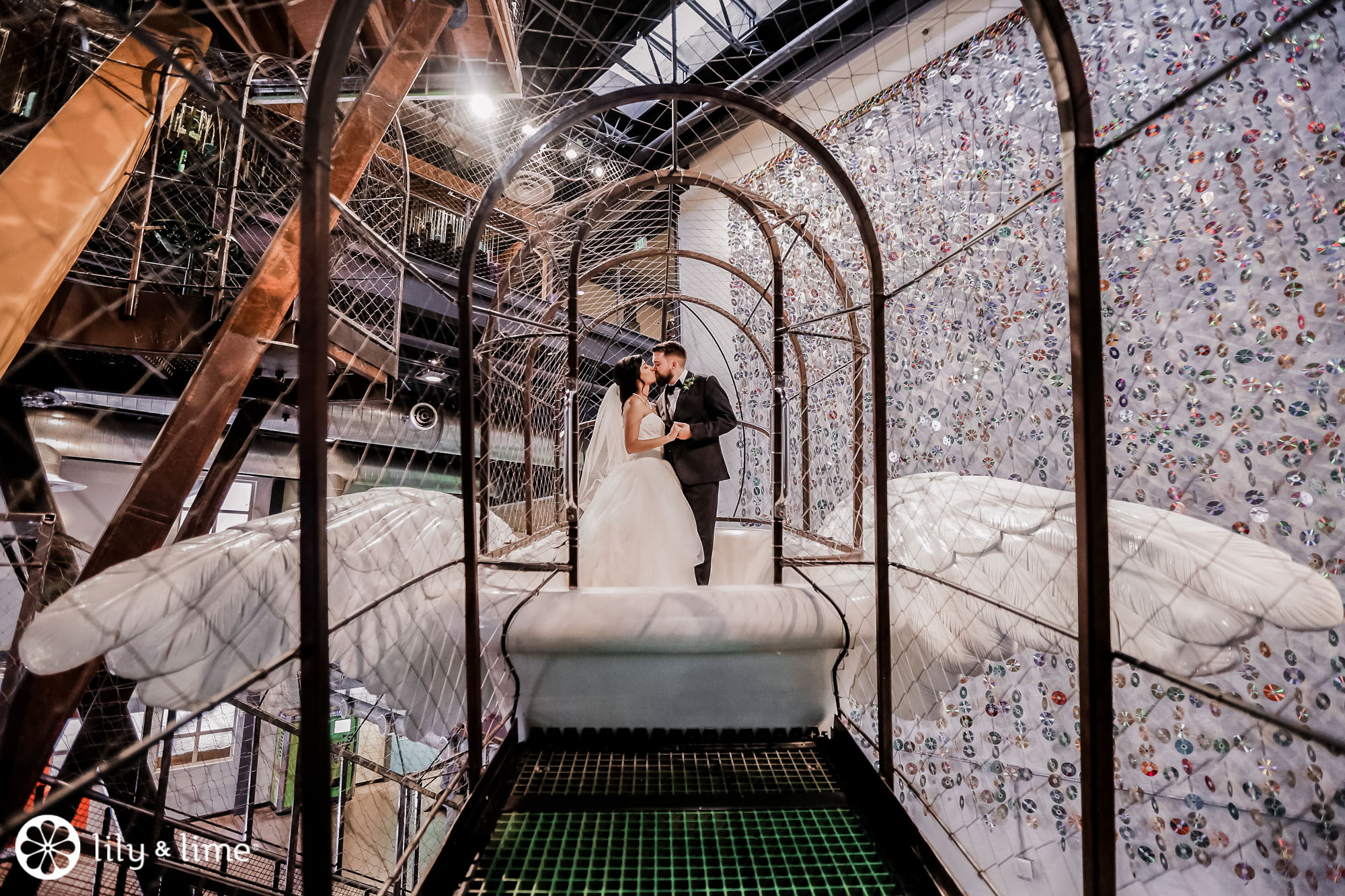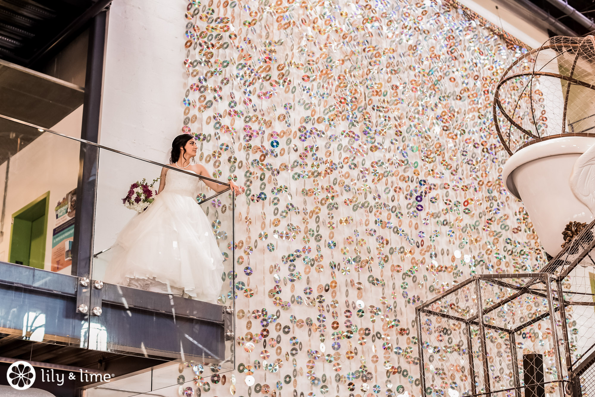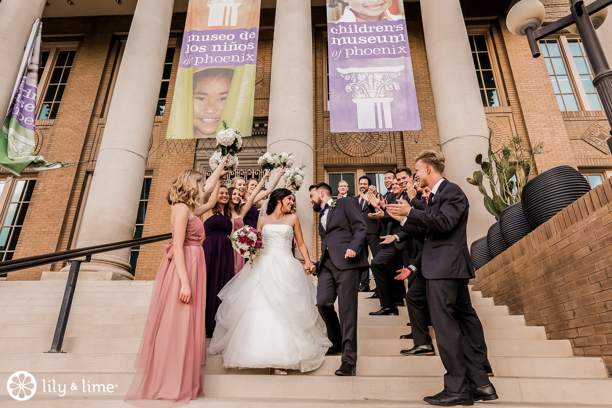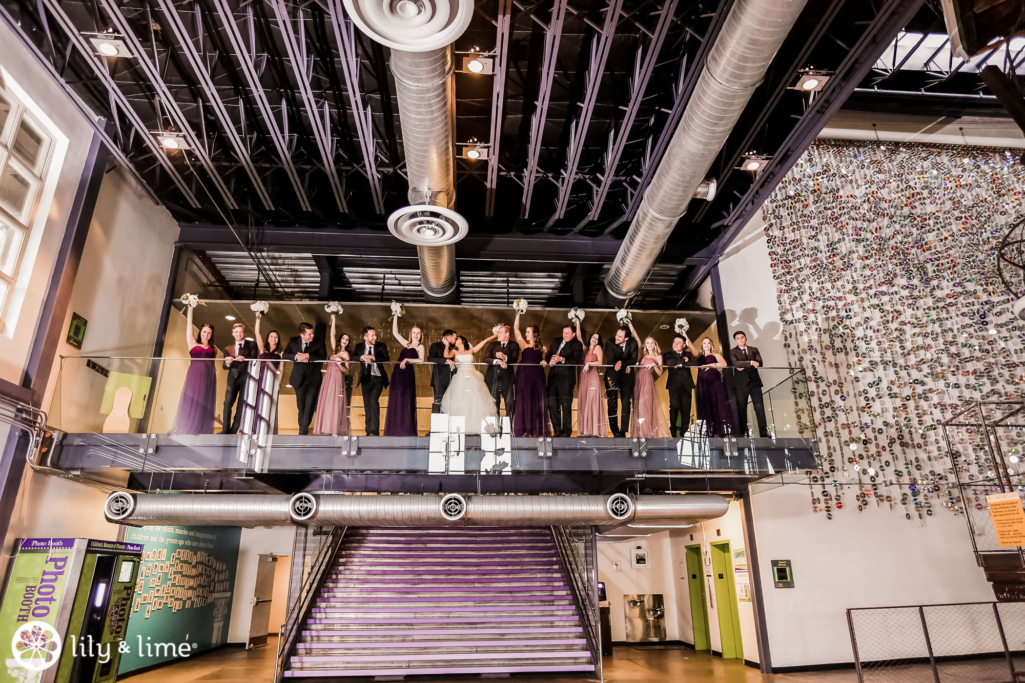 Every corner of the museum had an installation or an interesting feature that added so much to their wedding photos. The couple's Phoenix wedding photographer knew their way around the museum and was able to guide Katie and Justin to the prime photo spots. They made good use of the staircases. The indoor staircase had a modern, industrial feel for portrait, while the traditional stone staircase outside had a grand feeling that made it just right for post-ceremony pics. We especially love the shots of Katie on the balcony with a curtain of CDs in the background providing a modern rainbow of colors.