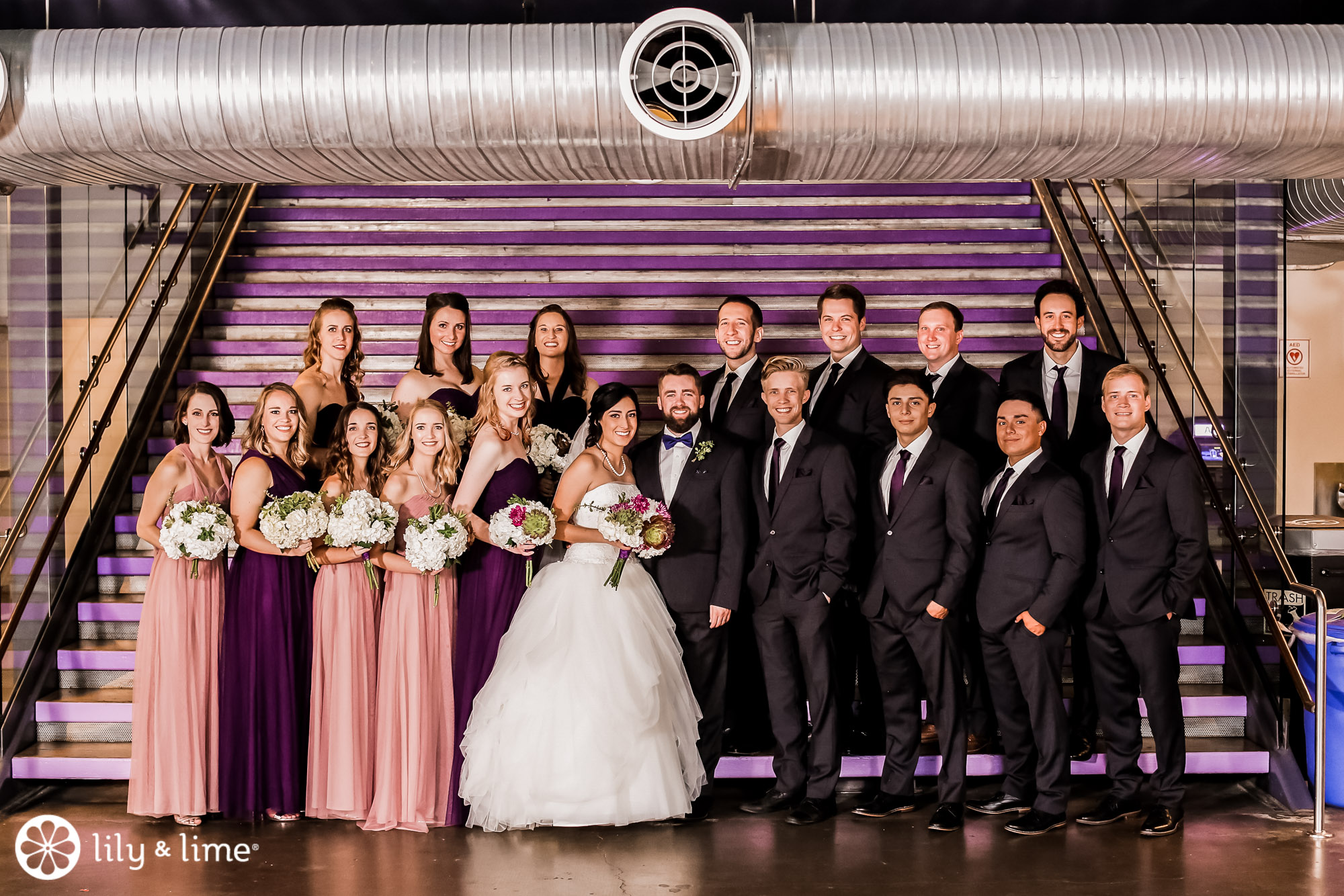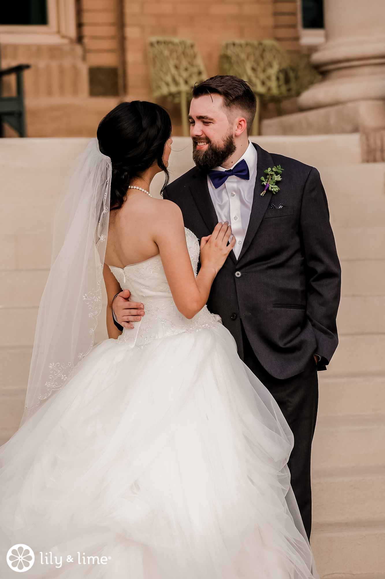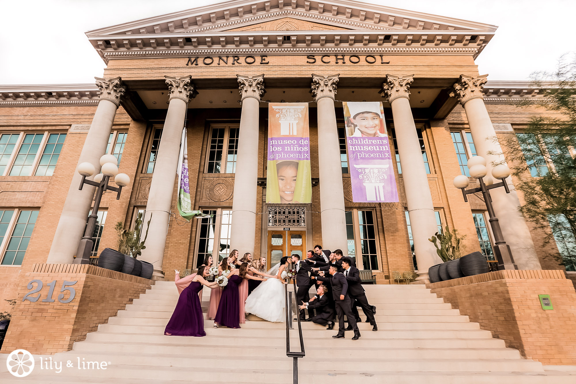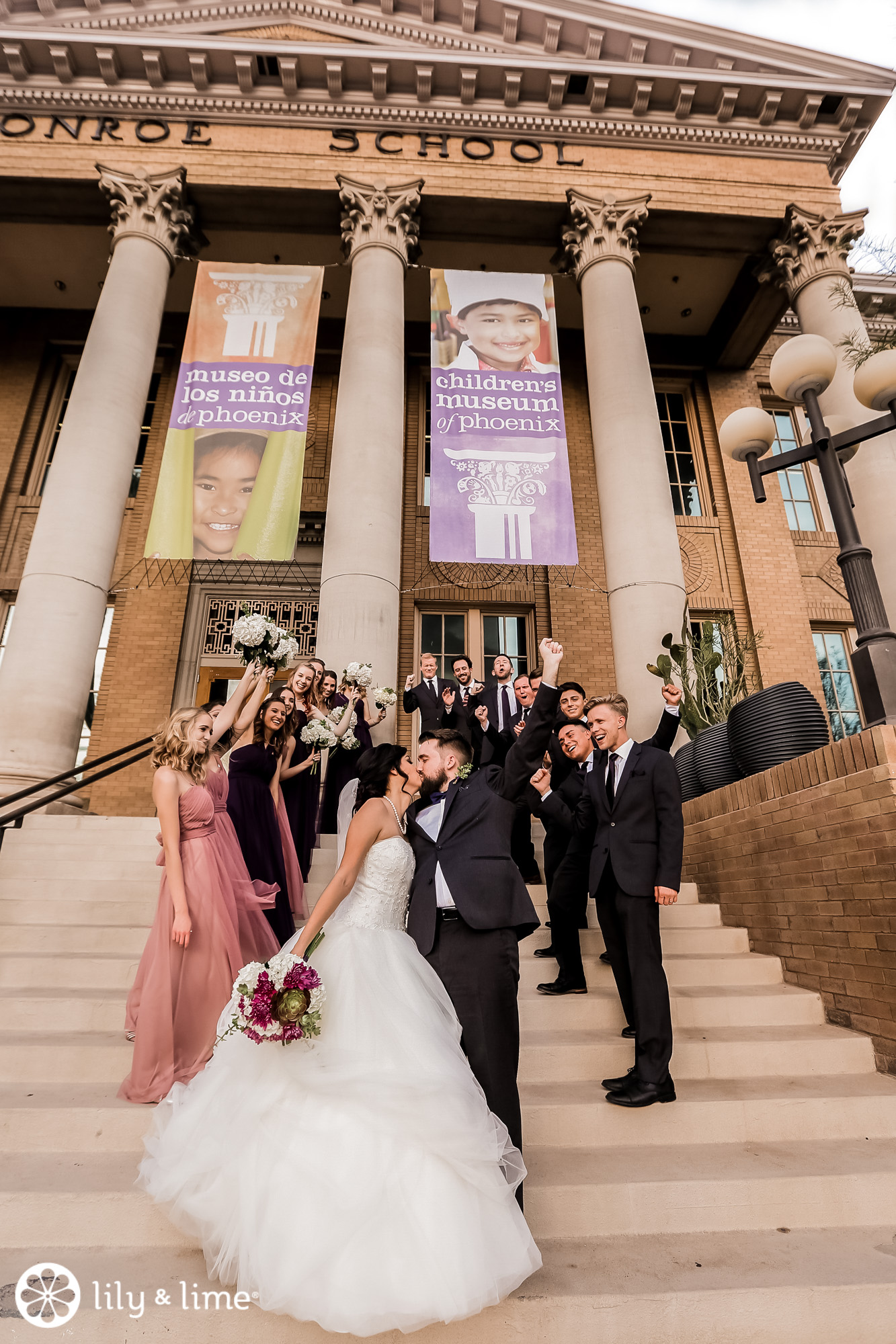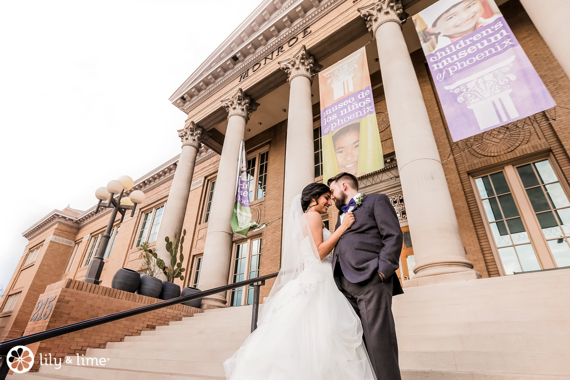 Every corner of the museum had an installation or an interesting feature that added so much to their wedding photos. The couple's Phoenix wedding photographer knew their way around the museum and was able to guide Katie and Justin to the prime photo spots. They made good use of the staircases. The indoor staircase had a modern, industrial feel for portrait, while the traditional stone staircase outside had a grand feeling that made it just right for post-ceremony pics. We especially love the shots of Katie on the balcony with a curtain of CDs in the background providing a modern rainbow of colors.