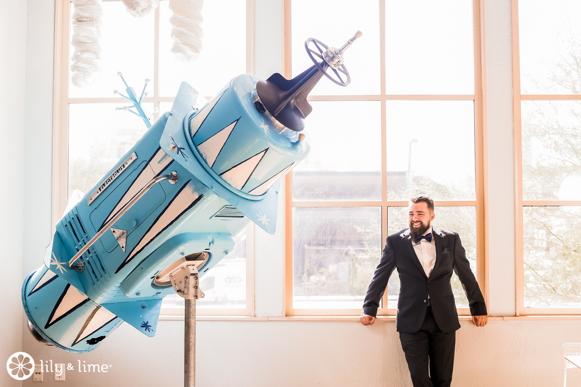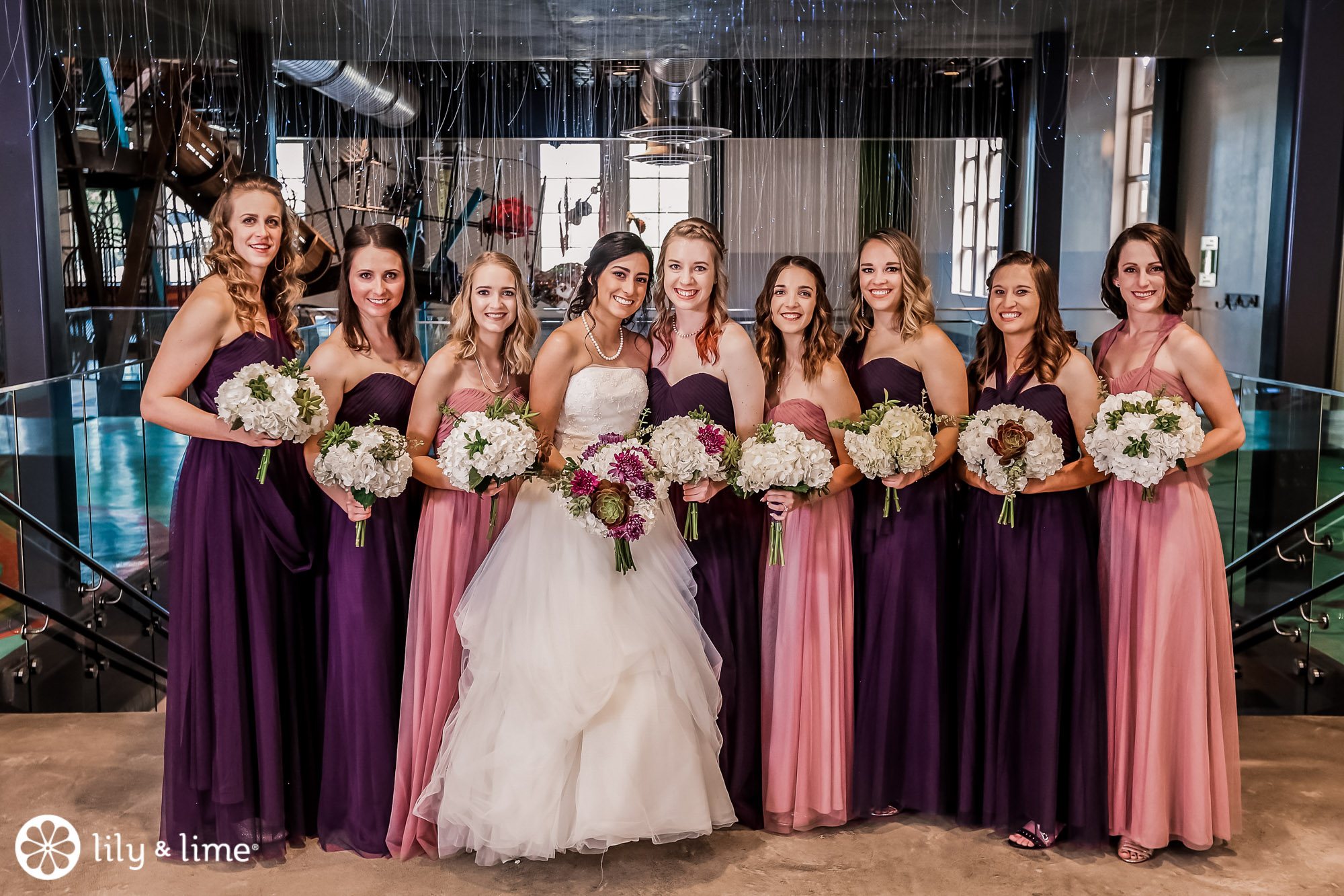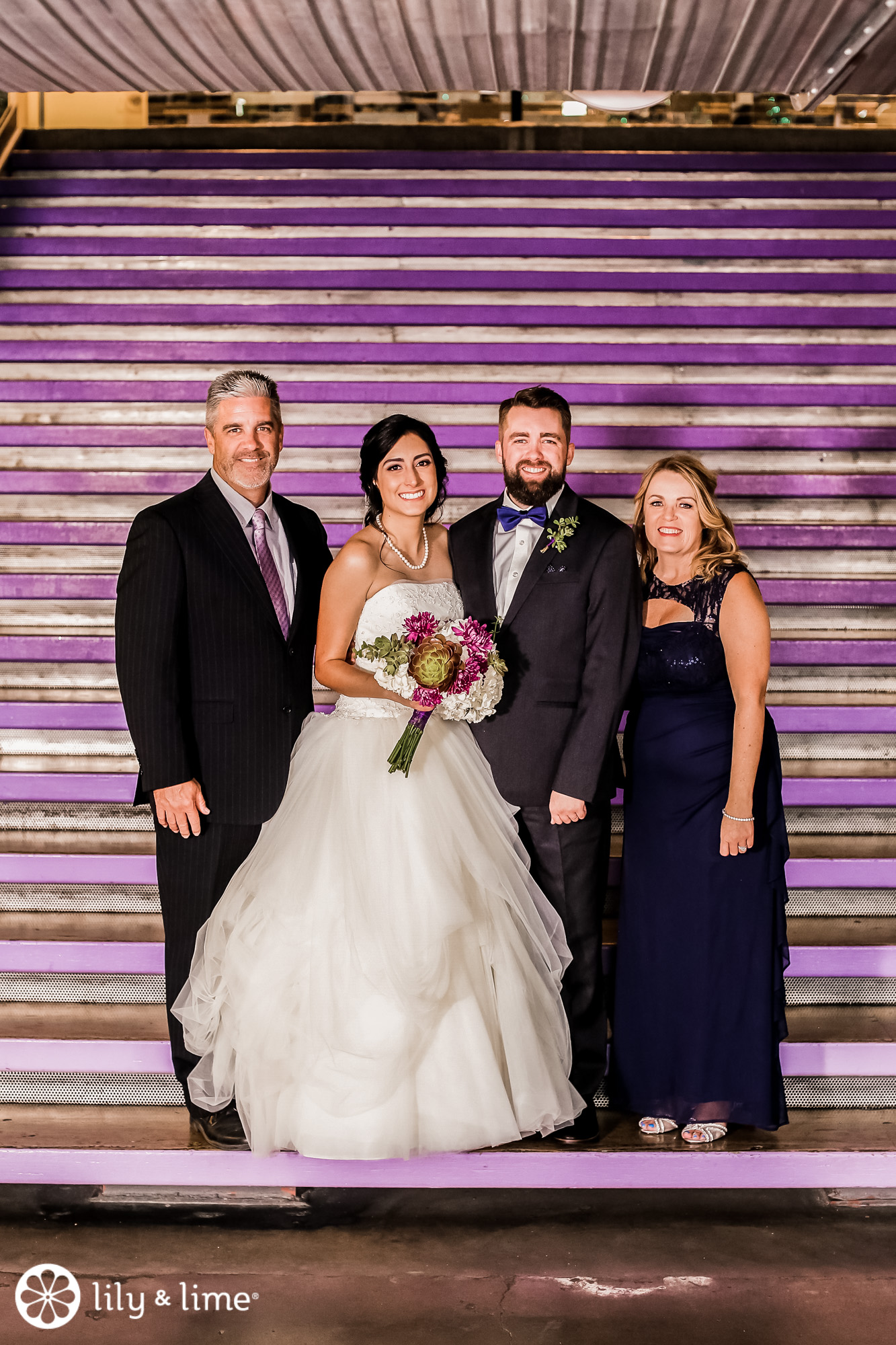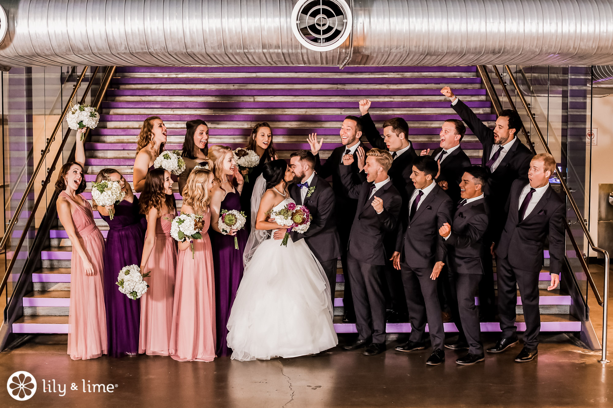 Every corner of the museum had an installation or an interesting feature that added so much to their wedding photos. The couple's Phoenix wedding photographer knew their way around the museum and was able to guide Katie and Justin to the prime photo spots. They made good use of the staircases. The indoor staircase had a modern, industrial feel for portrait, while the traditional stone staircase outside had a grand feeling that made it just right for post-ceremony pics. We especially love the shots of Katie on the balcony with a curtain of CDs in the background providing a modern rainbow of colors.