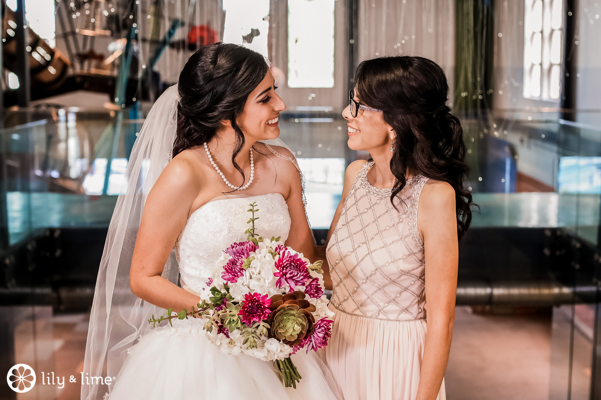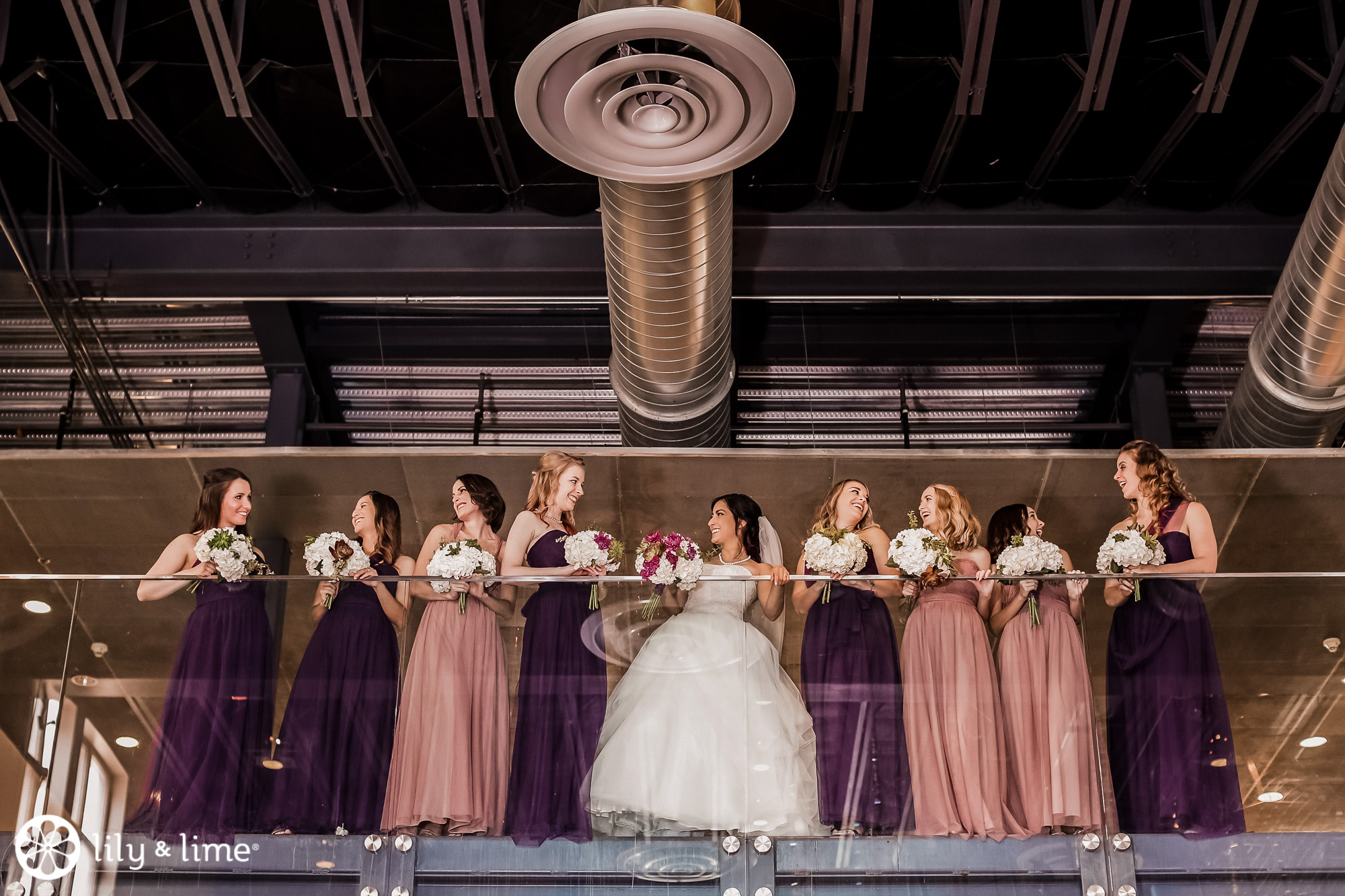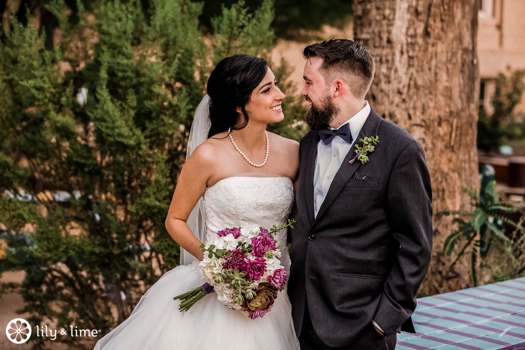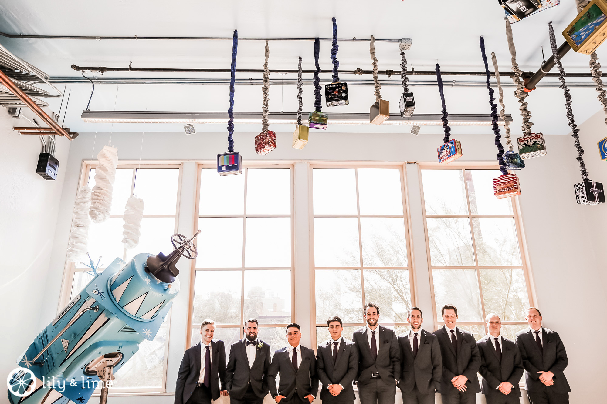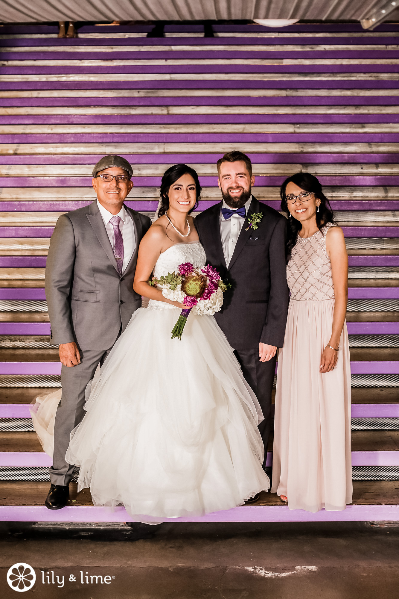 Every corner of the museum had an installation or an interesting feature that added so much to their wedding photos. The couple's Phoenix wedding photographer knew their way around the museum and was able to guide Katie and Justin to the prime photo spots. They made good use of the staircases. The indoor staircase had a modern, industrial feel for portrait, while the traditional stone staircase outside had a grand feeling that made it just right for post-ceremony pics. We especially love the shots of Katie on the balcony with a curtain of CDs in the background providing a modern rainbow of colors.