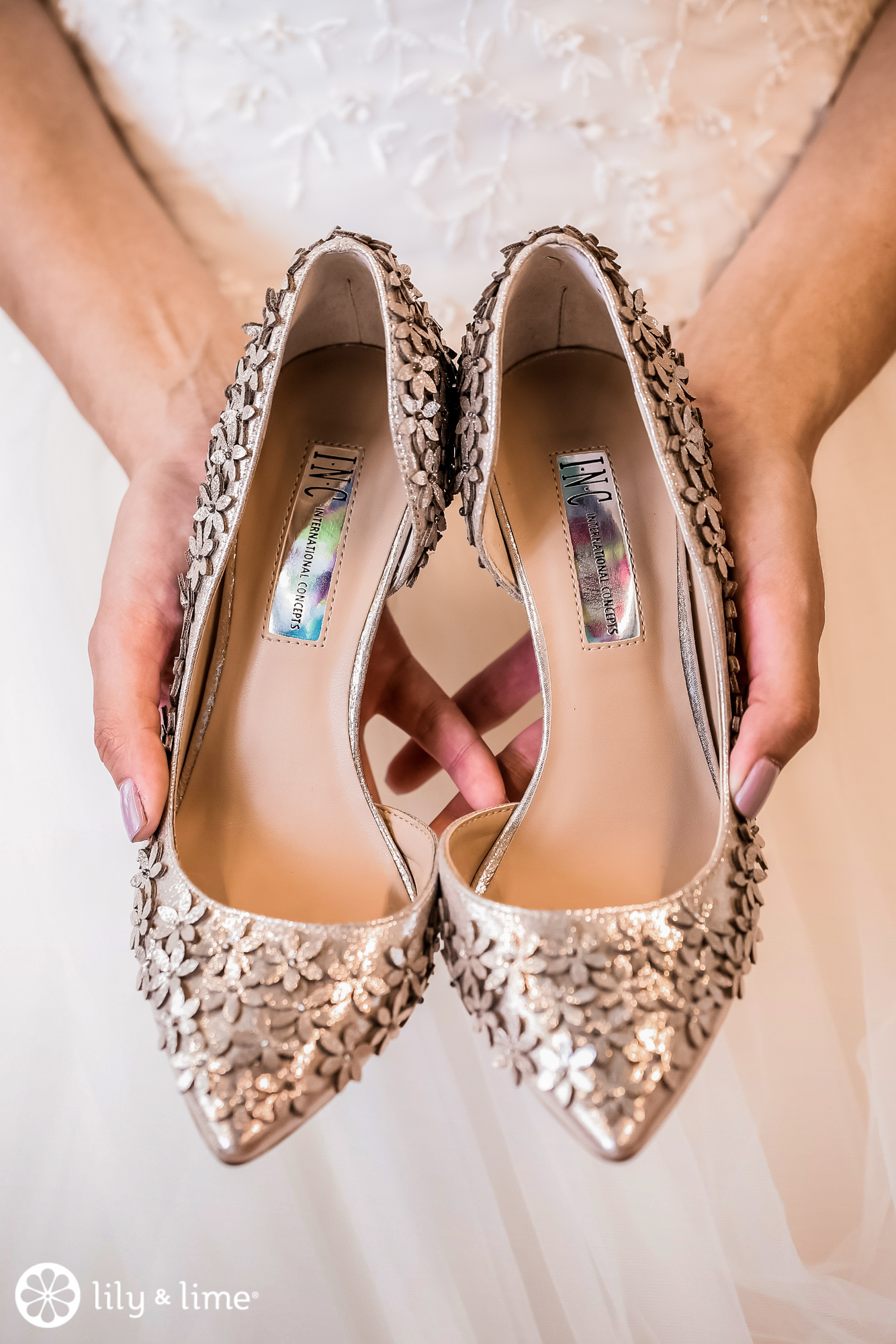 Katie began the day by getting ready with her bridesmaids. Her strapless, drop-waisted gown was full and airy. Her shoes were gold and glittered with floral appliques. Her bridesmaids wore a mix of rose and plum-colored dresses. We love the mix and match bridesmaid dresses because of the way they can perfectly balance individual personality and visual cohesion in the bridal party.