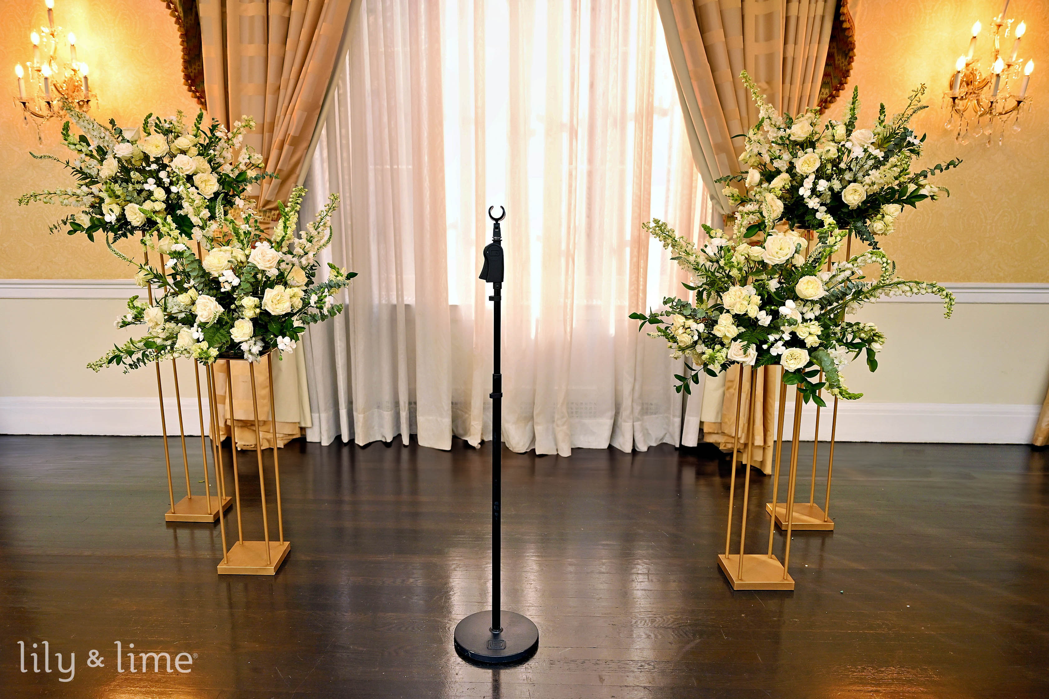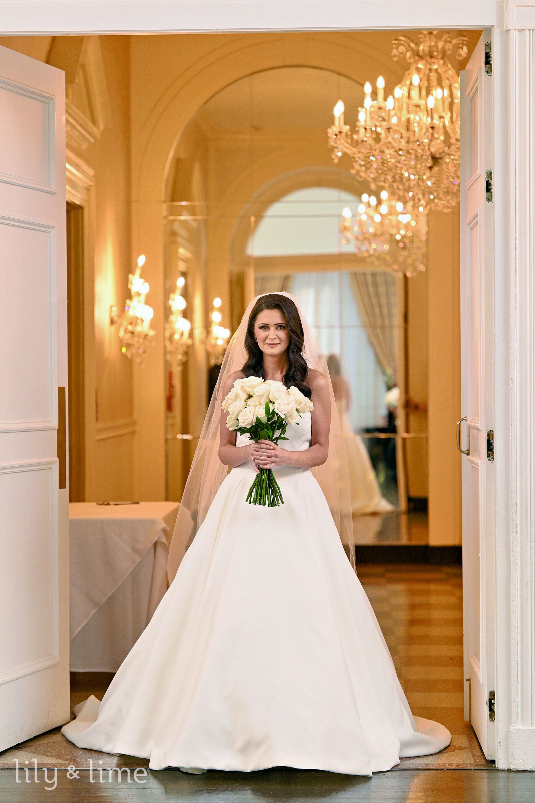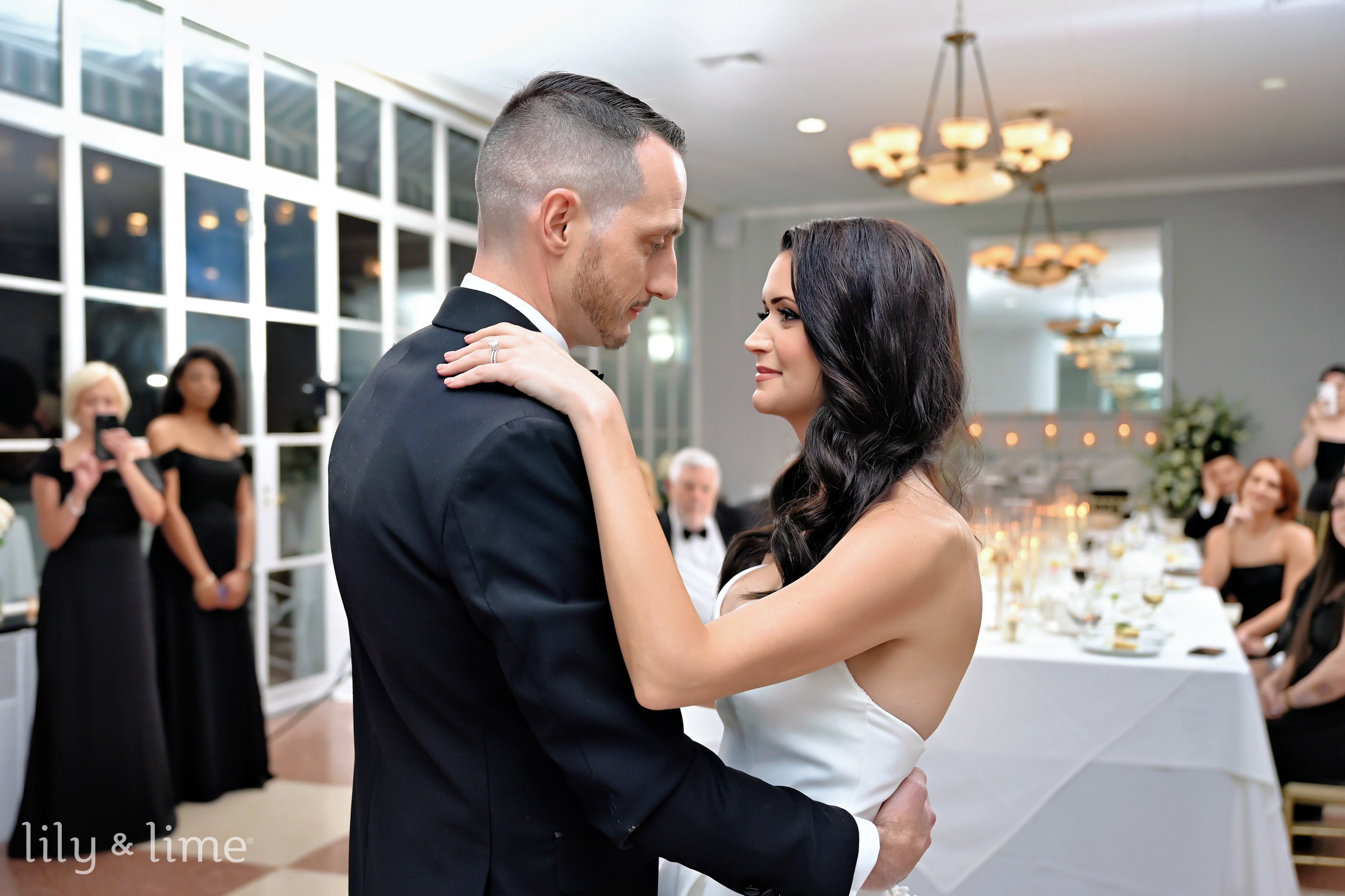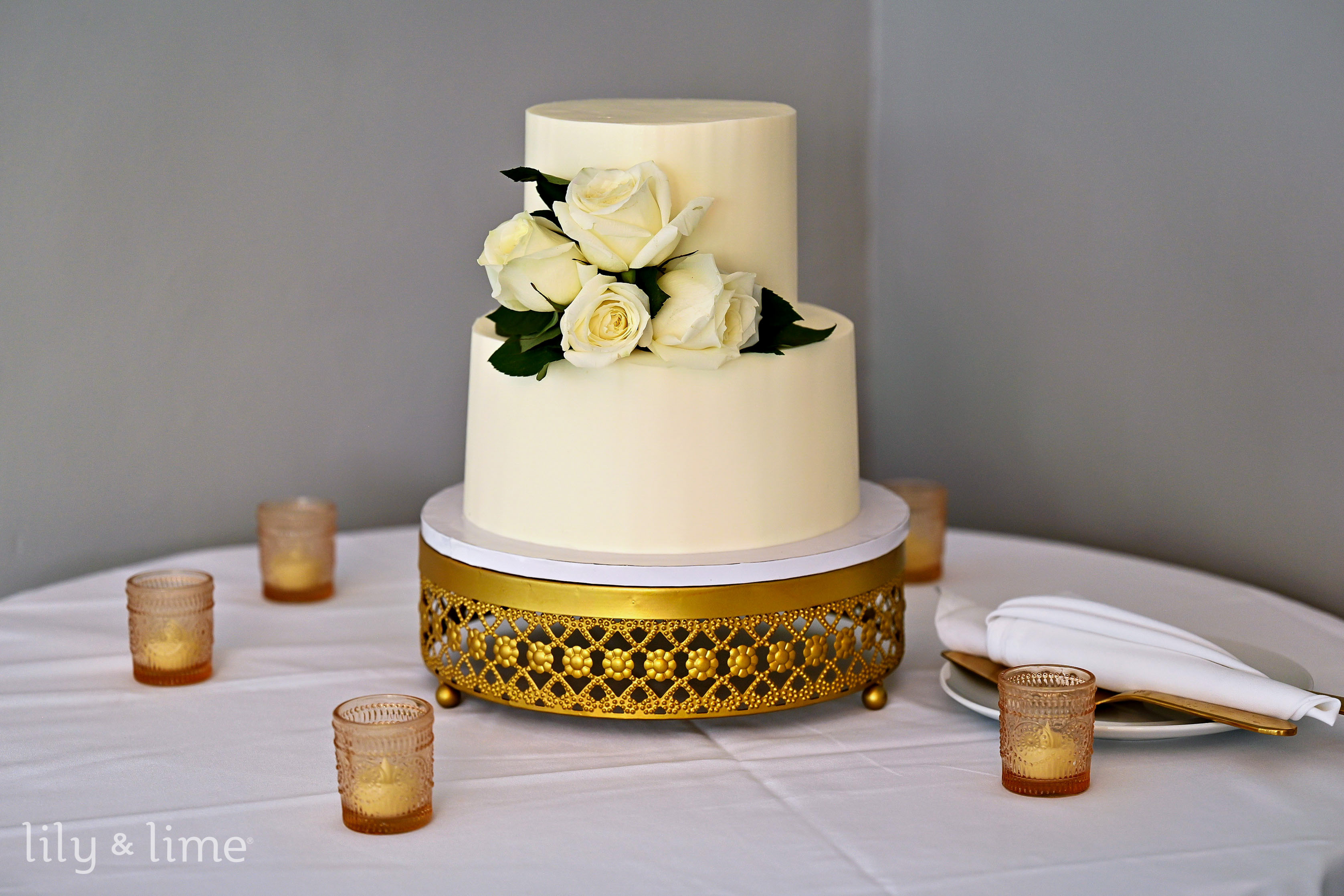 The afternoon reception was held in an elegant ballroom, where black-tie wedding details set the stage for a sophisticated celebration. Chic wedding signs, monochromatic decor, and candlelit tables created a warm and inviting atmosphere. The elegant glassware and serveware added a touch of refinement, while the minimal decor allowed the love and joy of the day to shine. The all-white wedding cake, adorned with delicate white roses, was a centerpiece that perfectly captured the day’s aesthetic.