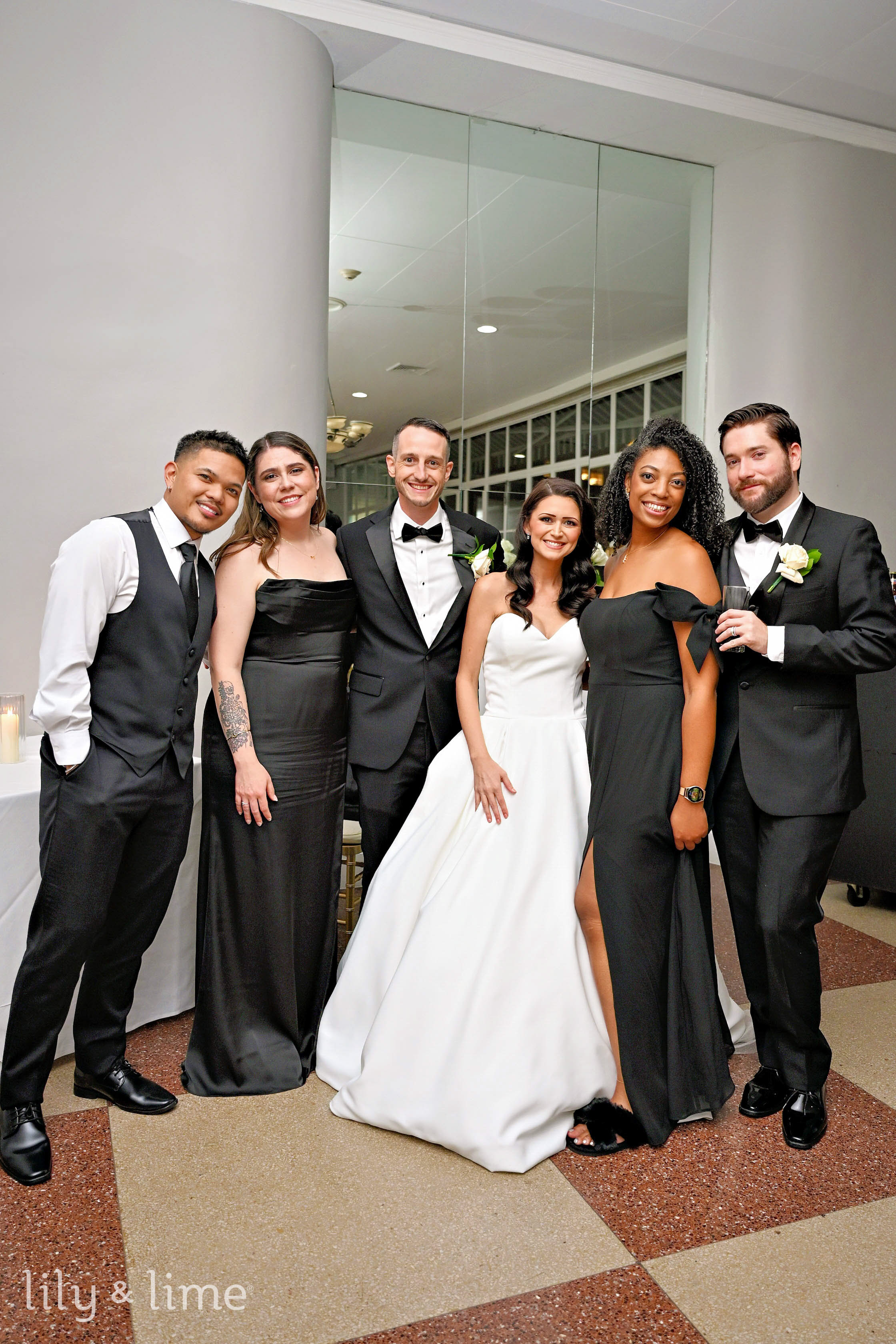 The wedding party’s attire perfectly complemented the couple’s style. The bridesmaids dazzled in black bridesmaid dresses, each carrying a white bouquet, while the groomsmen mirrored Alex’s polished look in their black suits. The group exuded sophistication, setting the tone for the day.