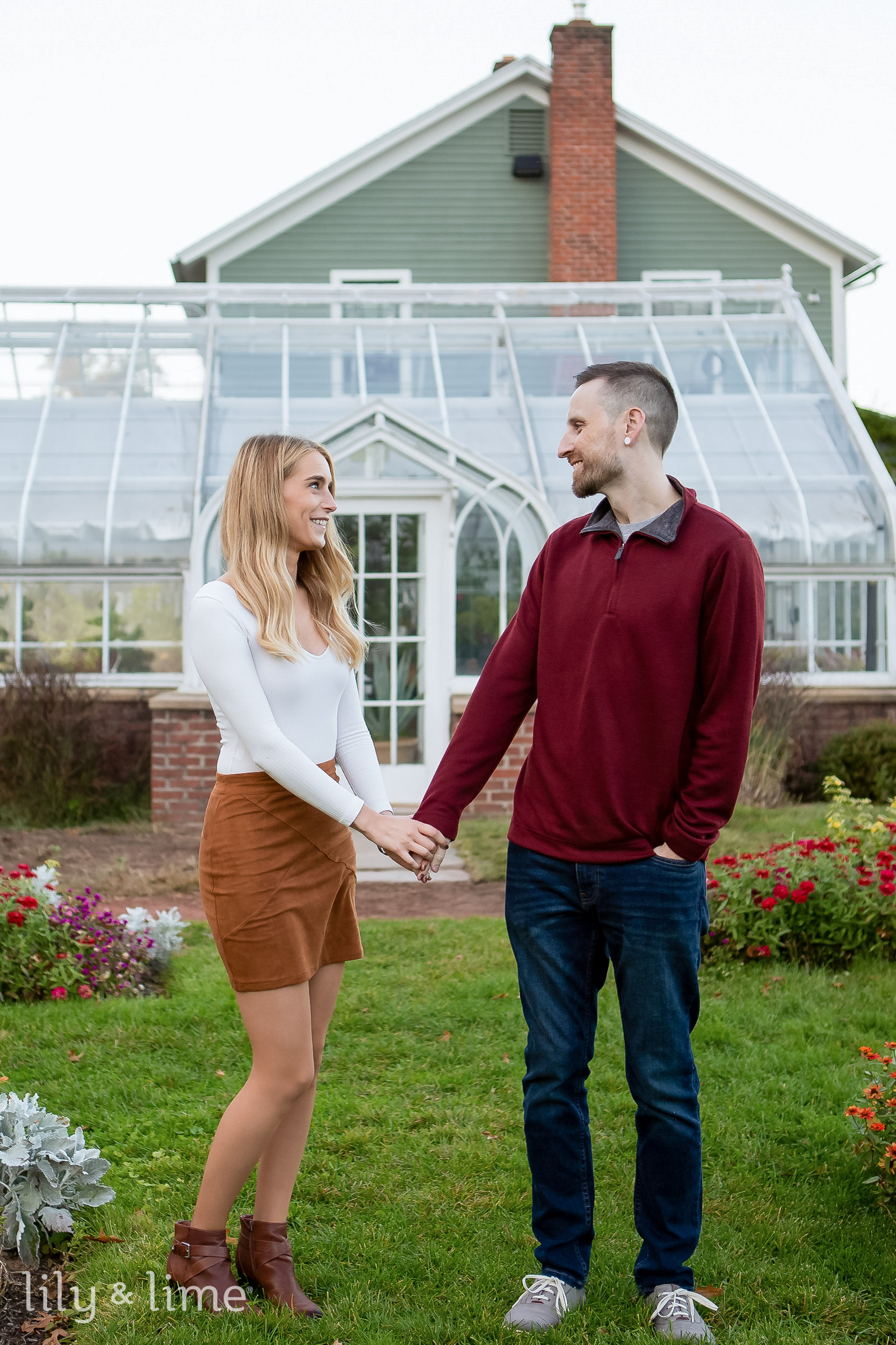 Our photographer was happy with the choice of the photo session location since it was the perfect time! During this outdoor fall photo session, our photographer knew that the warm hues, the flowering plants here, the blooms, and the creeper-covered gazebos were the perfect backdrop for beautiful photos. To make the most of their outdoor photo shoot our couple decided to dress up in beautiful fall-inspired outfits. Their engagement photo session outfits were casual and fit the season perfectly. For the day, Lindsay decided to put on a rusty orange skirt and paired it with a lovely ribbed white sweater. To finish her outfit, she put on tan boots. For her day’s look, she kept her makeup for the day natural and soft. Her hairstyle for the day was naturally swept. To match the beautiful fall aesthetic for his finances, Timothy put on a maroon sweater, and blue shirt with a blue pair of jeans. He paired his outfit with a stylish pair of gray shoes. For the beautiful engagement photo session, our couple for the day was dressed in stylish fall-inspired outfits and our Hartford engagement photographer was excited to get the day started. The stunning surroundings, colored with yellows, oranges, and greens were just right for the photo session for the day!
