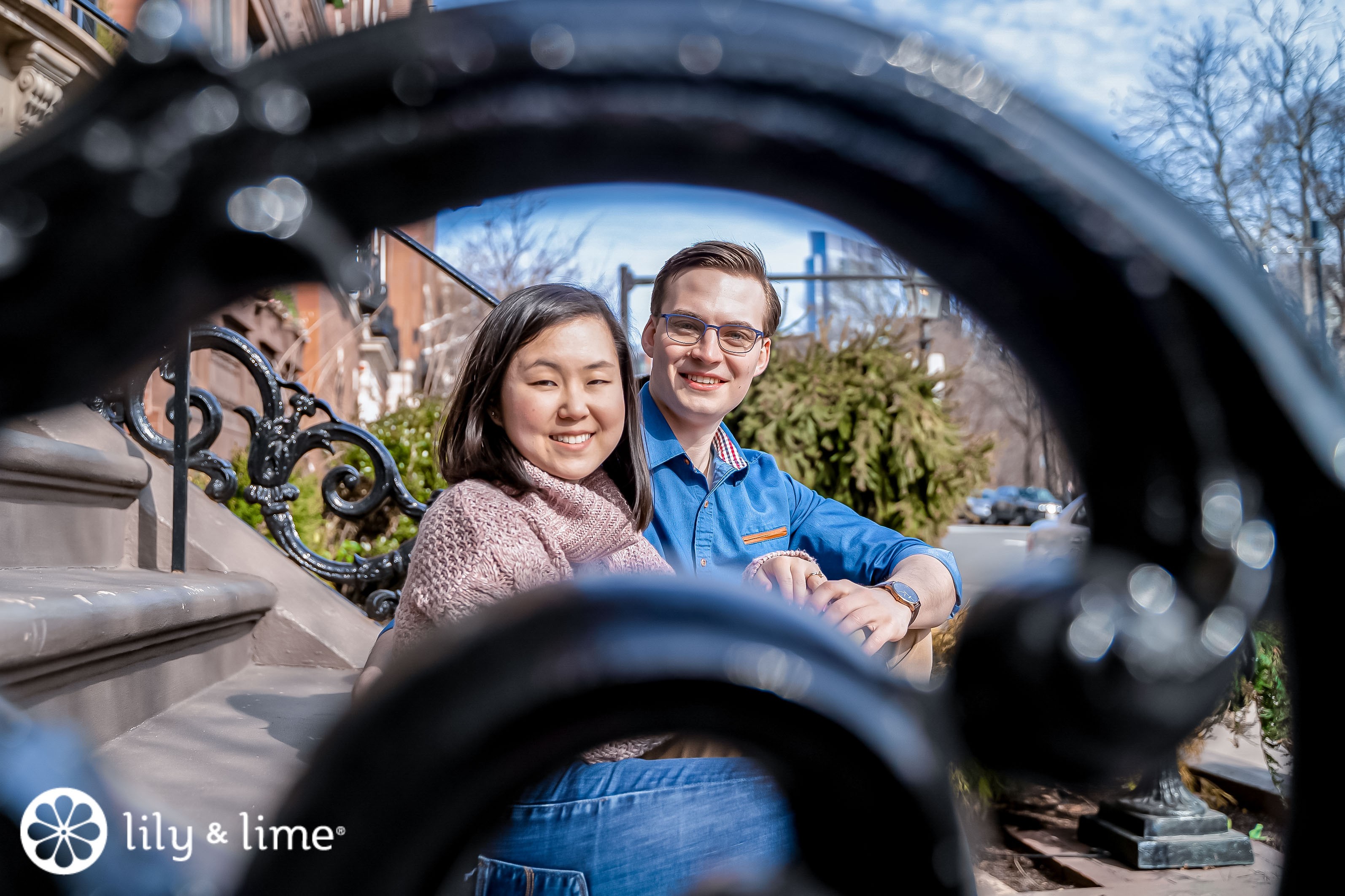 On the day of their engagement shoot, the couple got ready for a photoshoot in a tasteful manner, ensuring they fit into the backdrop with just the most adorable pop of colors. Elizabeth wore a chunky pale pink cable-knit turtleneck sweater with a pair of dark blue jeans and a pair of tan boots. She matched her nails to her outfit by painting them a bright and poppy pink color, something that we appreciate as she extends her hands to the camera to show off her engagement ring! She also had a black coat with her to keep the chill away between shots. Her shoulder-length hair was left free and straight and her makeup looks natural and light. Jeffrey looked charming in his dark blue shirt with orange button details and a pair of tan trousers. A smartwatch, a pair of tan formal shoes, and a pair of glasses completed his look with great flair. Together, the couple looked phenomenal together, with the perfect balance of pink and blue. We love how the outfits compliment each other, like the blues in Elizabeth’s jeans and Jeffrey’s shirt tie in together, while the pastel pink and the tan are on the lighter side of the palette, bringing in balance to the set.