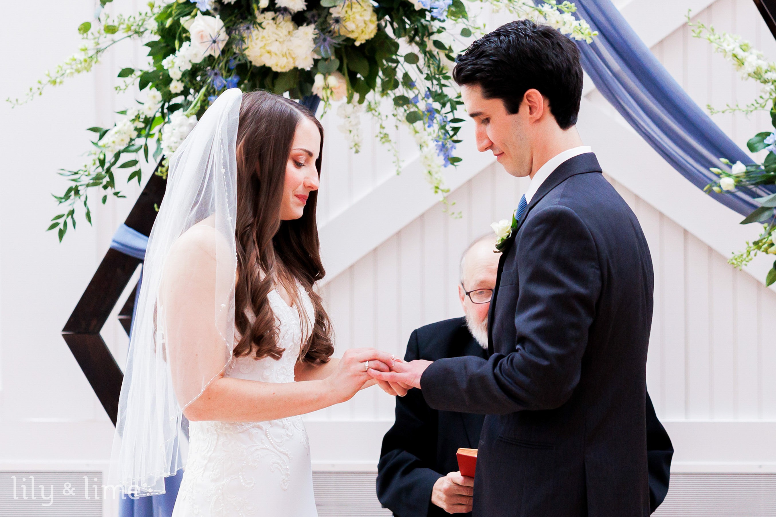 The wedding photography in DC also captured the serene indoor ceremony space, featuring an elegant setting with a hexagon ceremony backdrop with blooming flowers. The rustic beauty of the ceremony space with a blend of elegance resembled scenes from a fairy tale. The bride getting ready portraits showcased Maria and her group of bridesmaids preparing for the momentous occasion. The bridesmaids wore matching dusty blue bridesmaid dresses in different silhouettes and necklines, creating a spectacular mismatched bridesmaid look. They carried white wedding bouquets with pops of blue that beautifully brought dusty blue wedding ideas to life without going overboard. Similarly, the groomsmen in black equally stole the show. The groomsmen's attire was themed in black as they wore matching black wedding suits with crisp white shirts, navy blue ties, shiny black shoes, and single-stem white flower boutonnieres. The couple and their wedding party looked seamlessly spectacular in all the portraits!