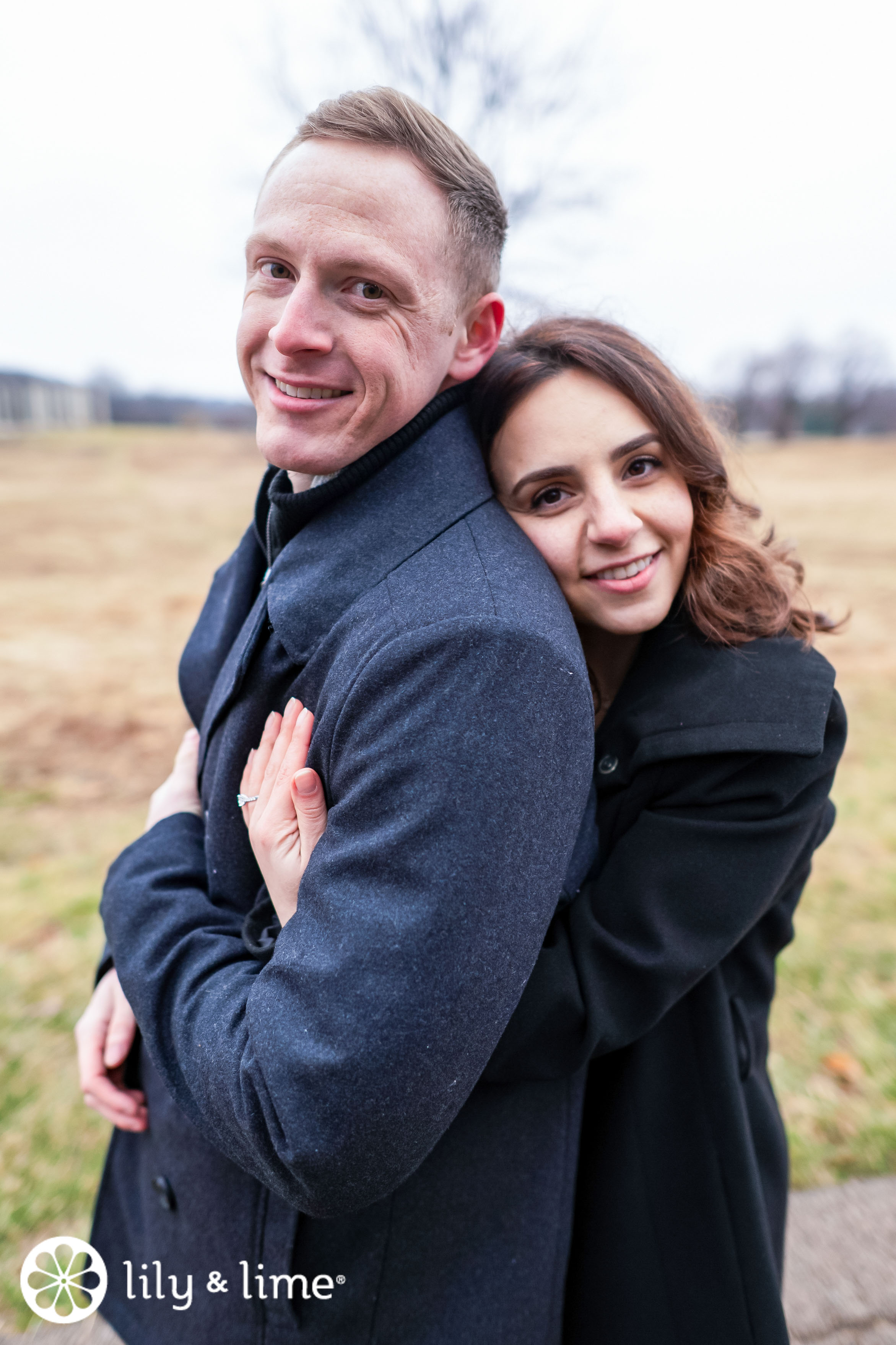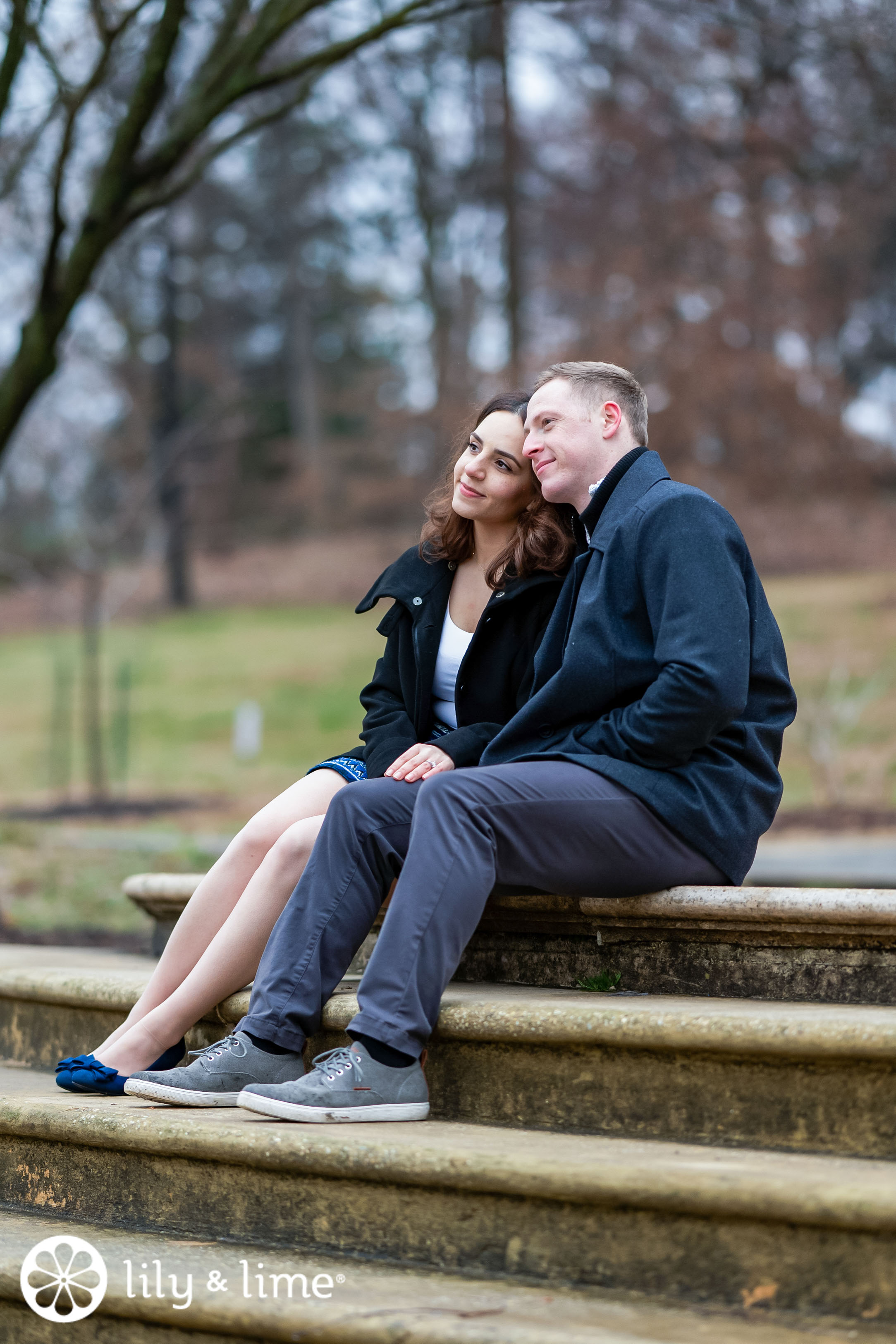The air was fragrant with nothing but pure love, and nature sprinkled its confetti in the form of bucolic beauty, giving us reasons to celebrate the festive spirit of this late winter season. Alisa and Cameron's glamorous engagement attire made them ideal for our DC professional photographers to capture their couple portraits. Celebrating the vibe of a fun engagement celebration and photography session came to life as the breezy air, relaxing weather, and abundance of winter foliage added a touch of romance and whimsy. The to-be bride's inspirational engagement outfit made our hidden aesthetician happy, as she wore a semi-formal engagement dress code featuring a long black coat with a hood, a crisp white top, a tribal printed short skirt, a pair of navy blue wedge pumps, and let her gorgeous flowing hair speak for her airy spirit.