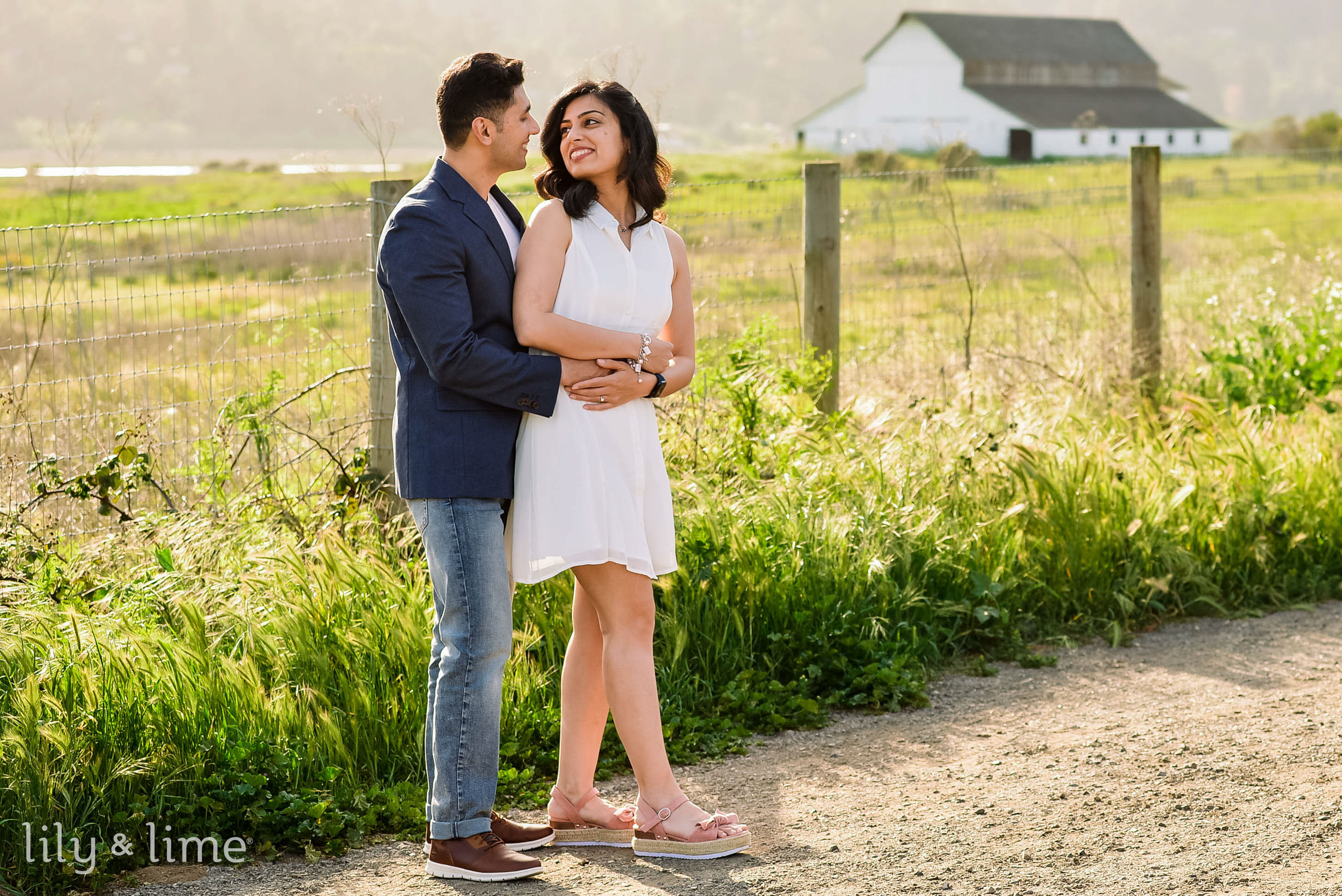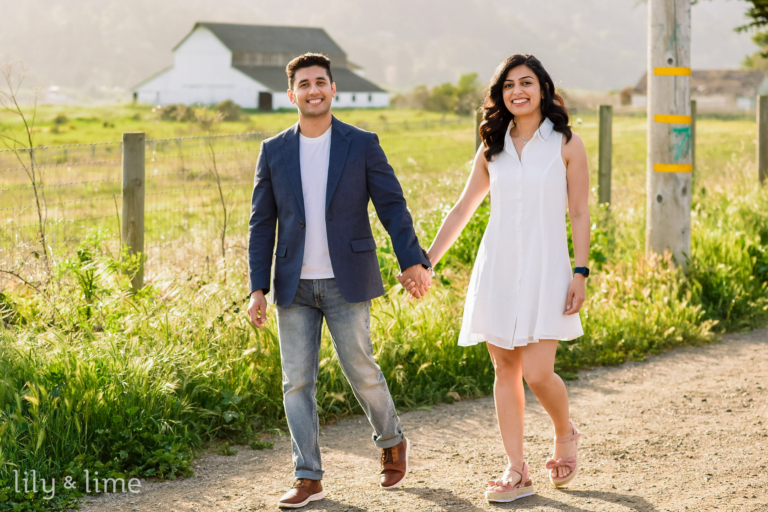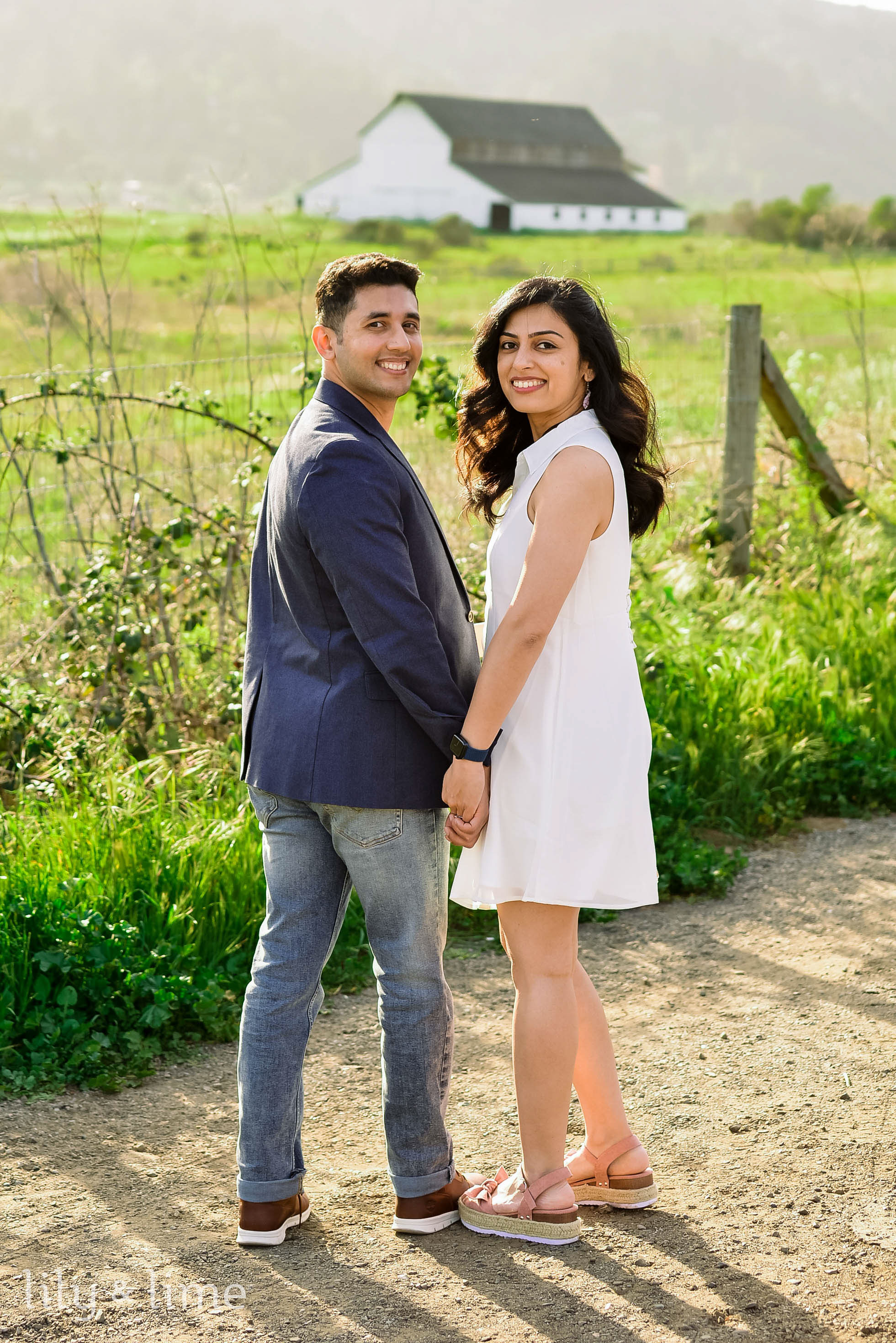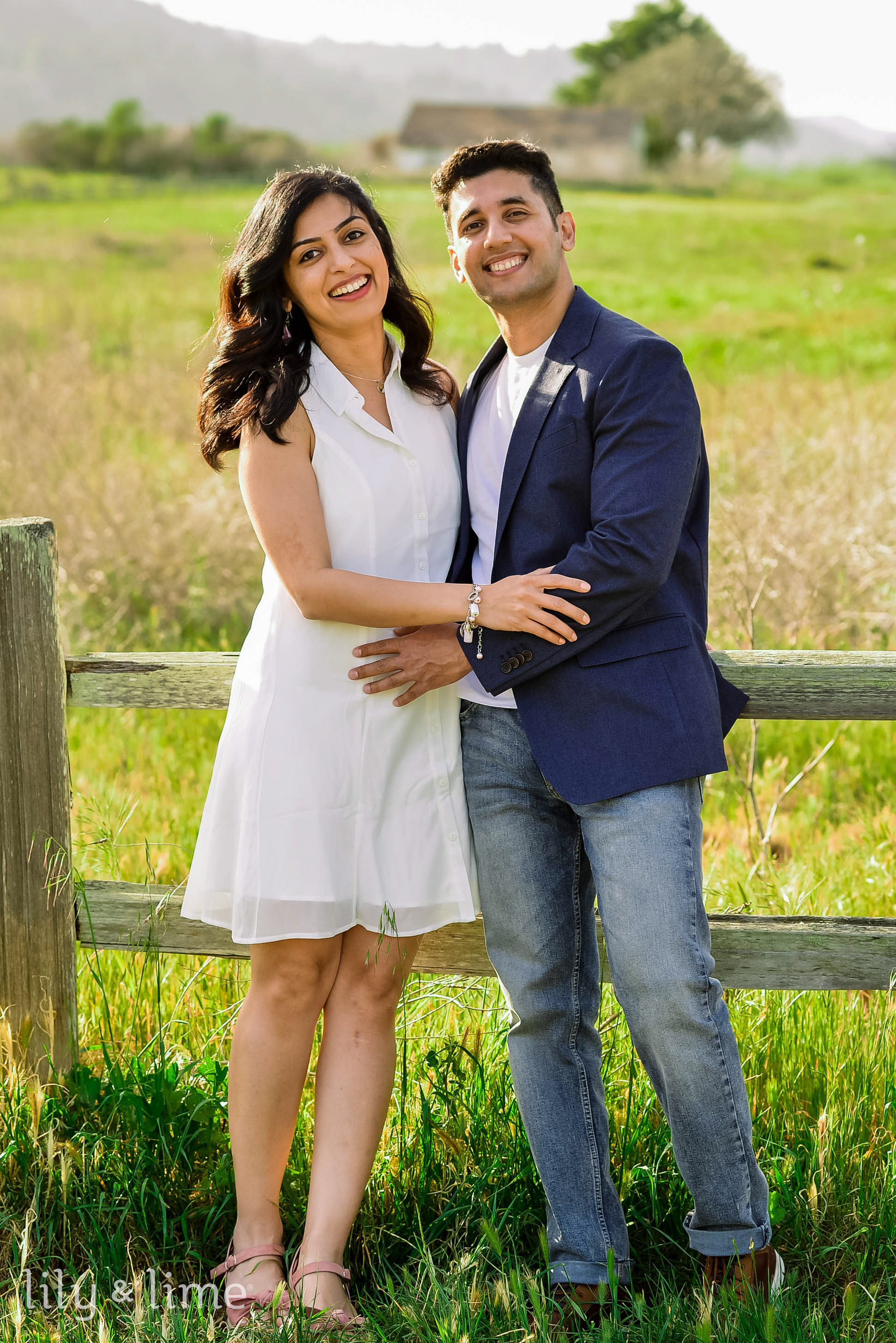 For the engagement session, Neha wore a white, flowing shirt dress with a pair of beautiful, neutral platform heels. Her breezy engagement attire stole our hearts! Our dashing groom Anirban also brought his playfulness by wearing a pair of bleach-washed denim and a round-neck white t-shirt along with a navy blue casual blazer. He completed his breezy spring engagement look with a pair of brown casual shoes. The lovely couple orchestrated some gorgeous couple poses in front of a huge brown backdrop and went on to the surrounding lush green areas to capture some more couple portraits. As they went through the beautiful country roads flanked by last greenery and trees, our hearts melted like wax!