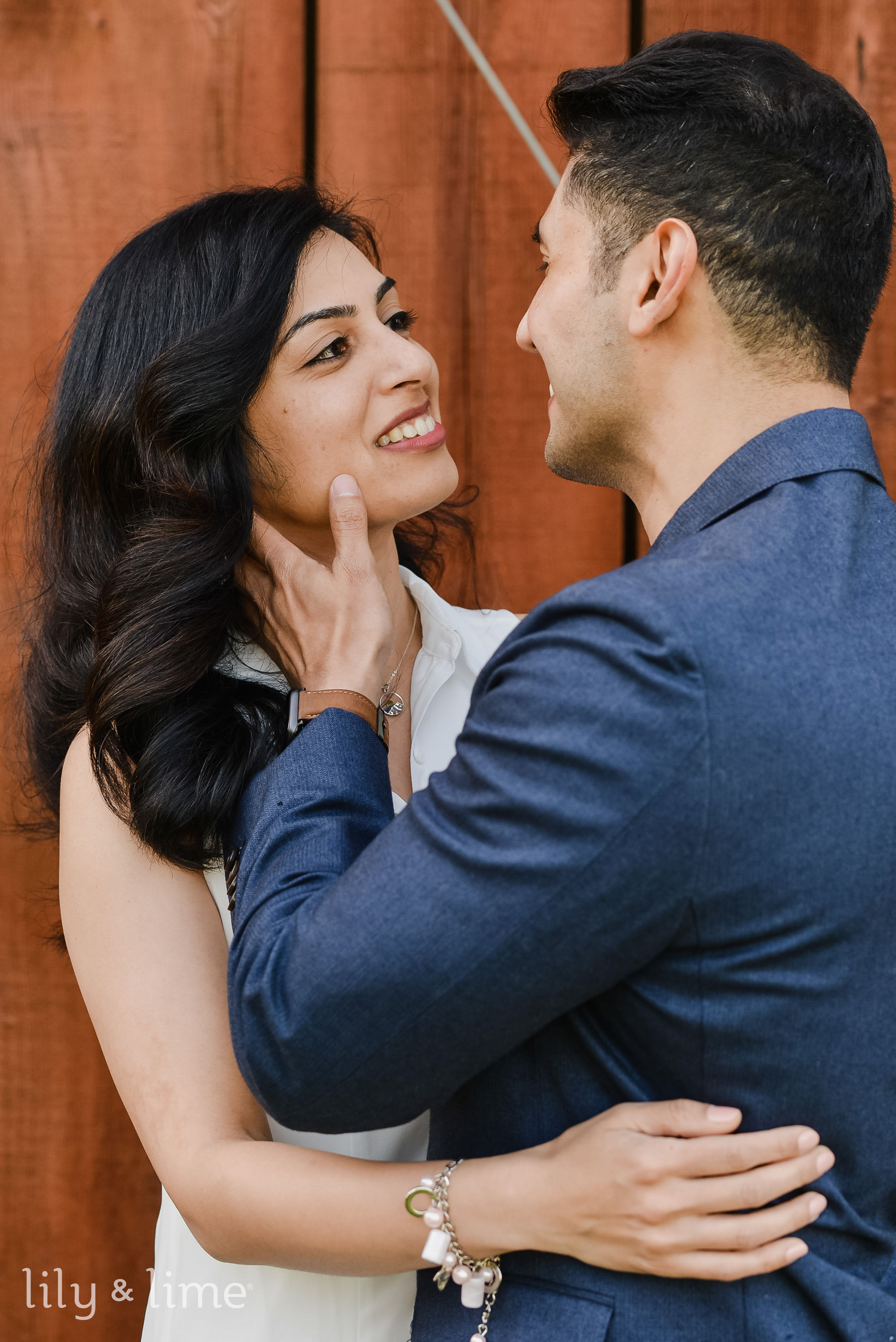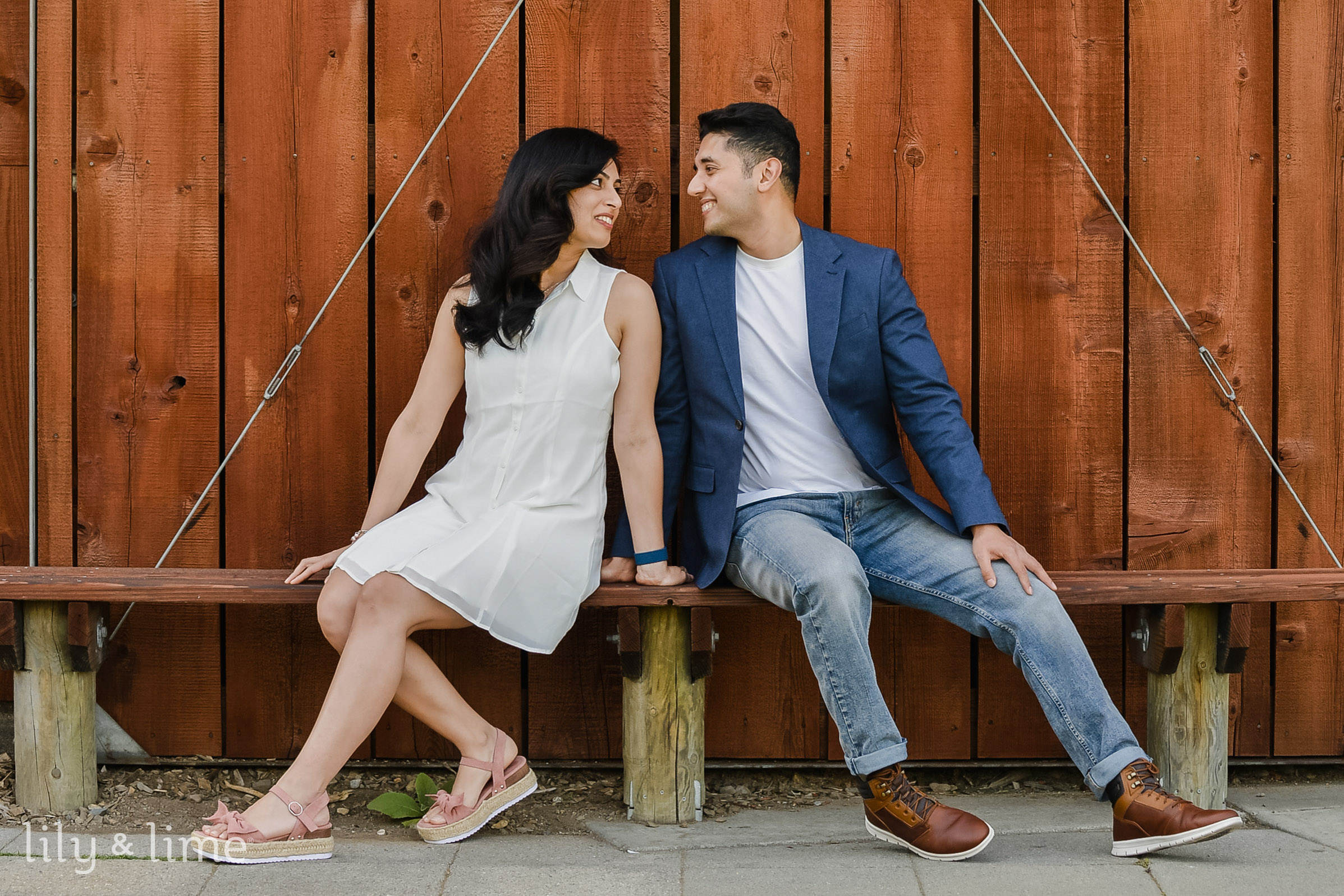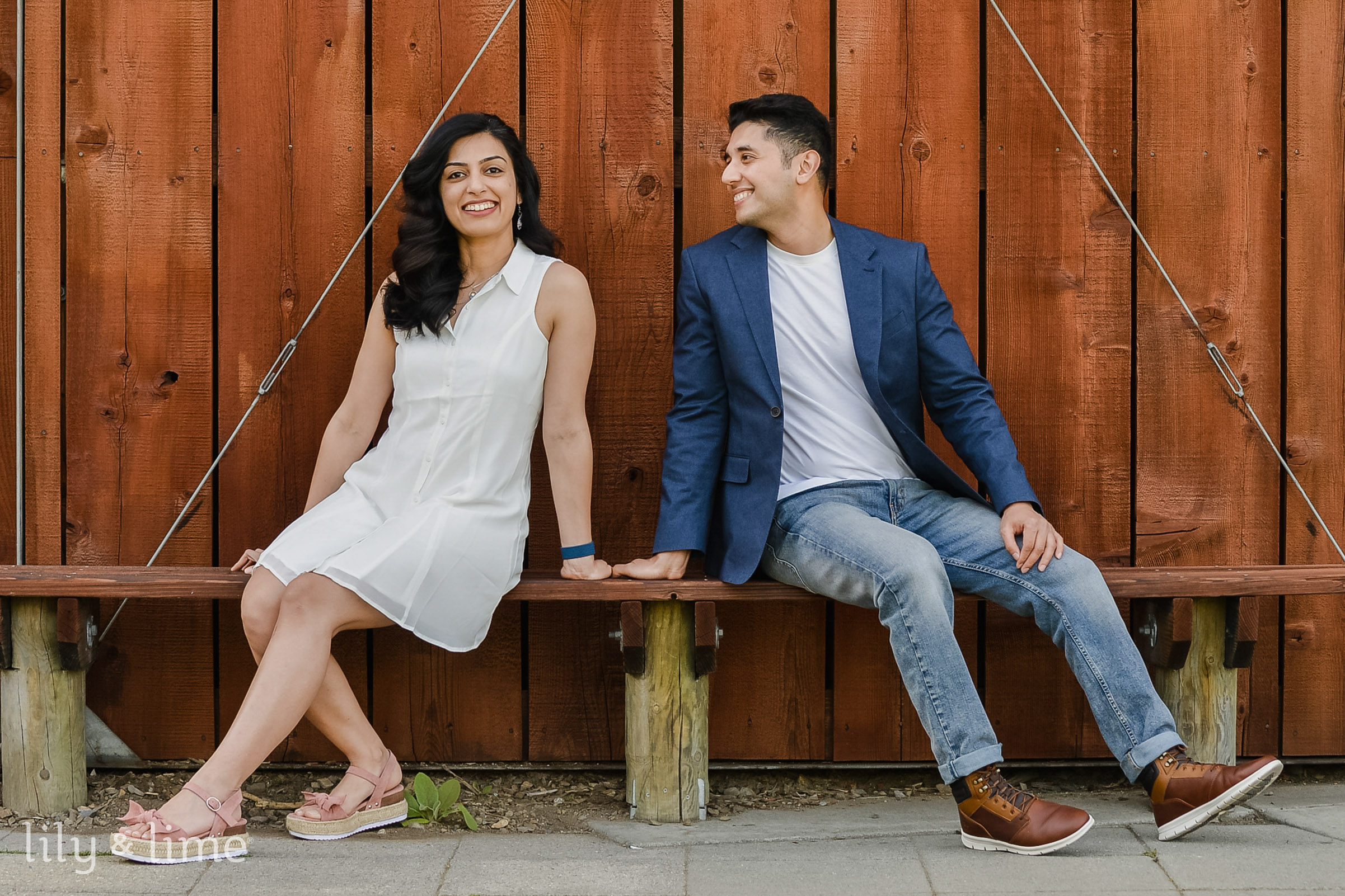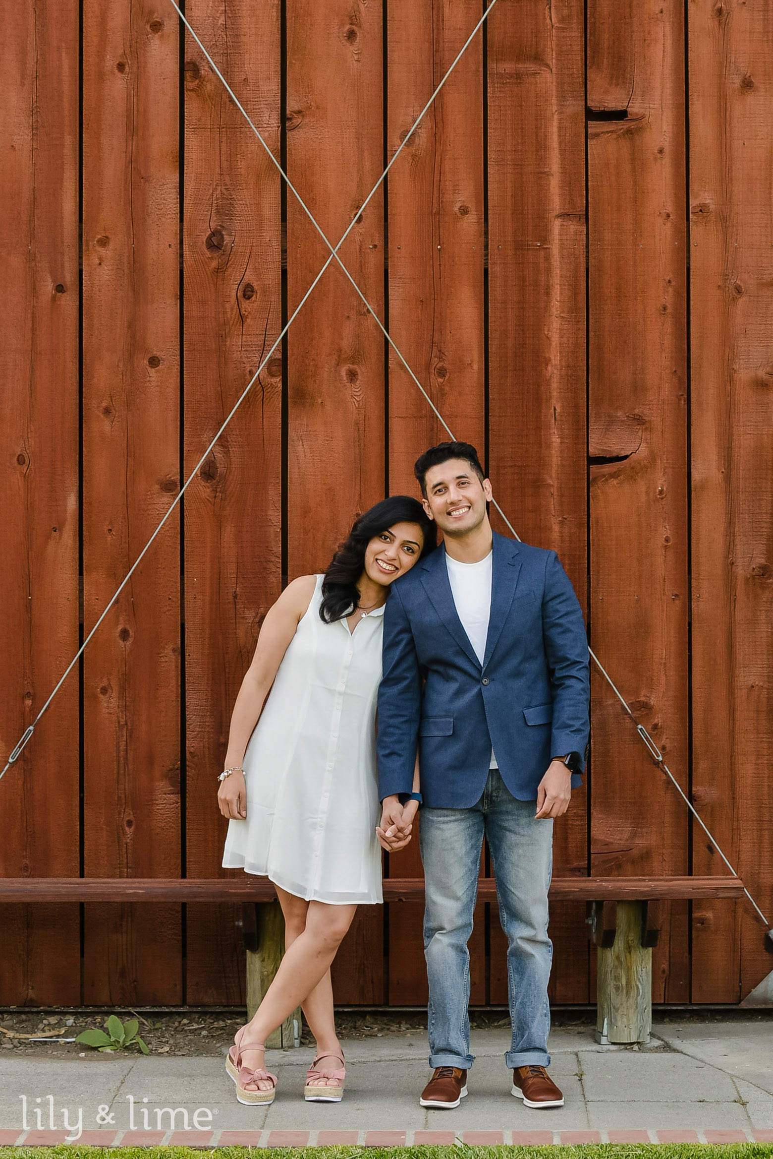 For the engagement session, Neha wore a white, flowing shirt dress with a pair of beautiful, neutral platform heels. Her breezy engagement attire stole our hearts! Our dashing groom Anirban also brought his playfulness by wearing a pair of bleach-washed denim and a round-neck white t-shirt along with a navy blue casual blazer. He completed his breezy spring engagement look with a pair of brown casual shoes. The lovely couple orchestrated some gorgeous couple poses in front of a huge brown backdrop and went on to the surrounding lush green areas to capture some more couple portraits. As they went through the beautiful country roads flanked by last greenery and trees, our hearts melted like wax!