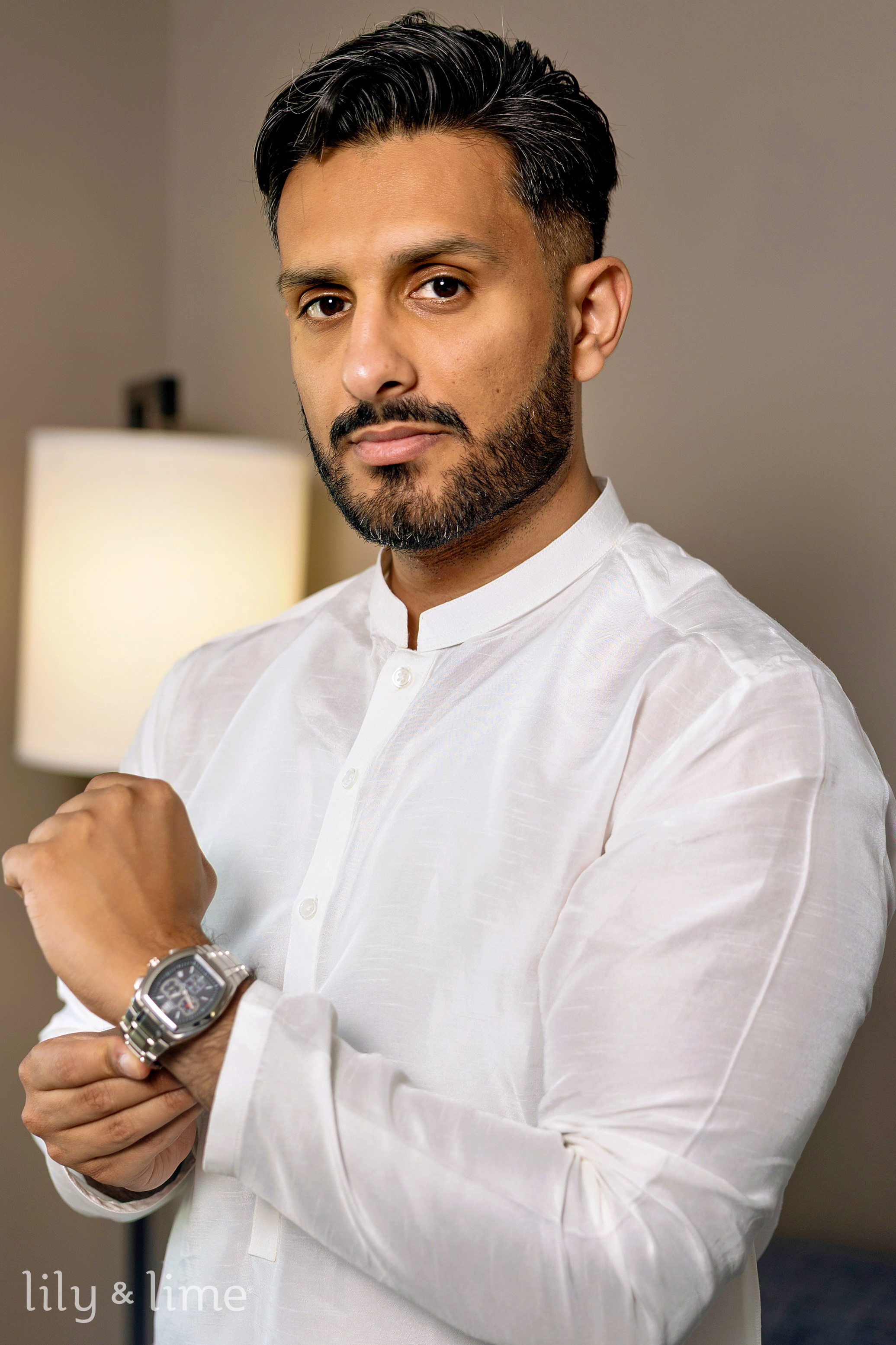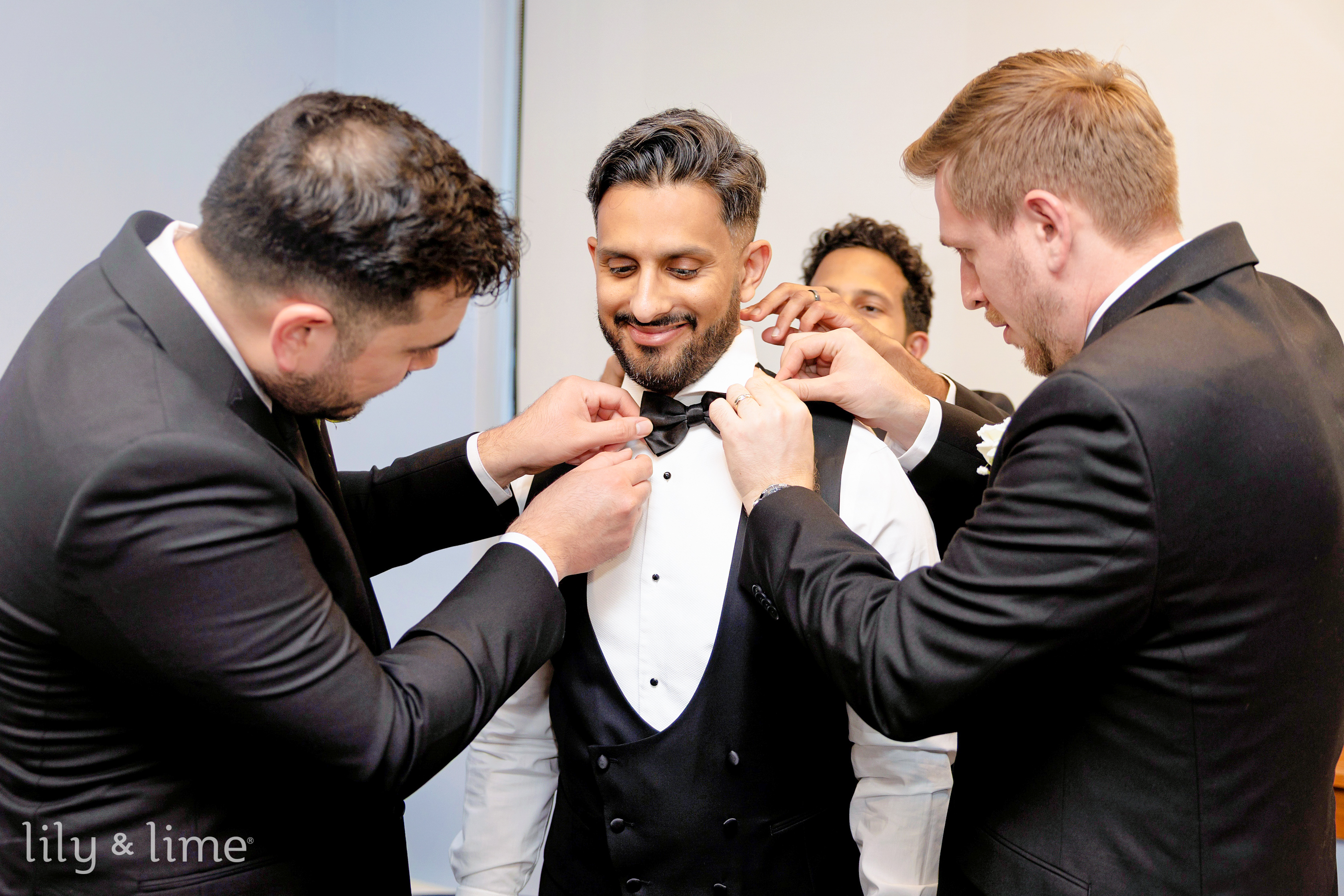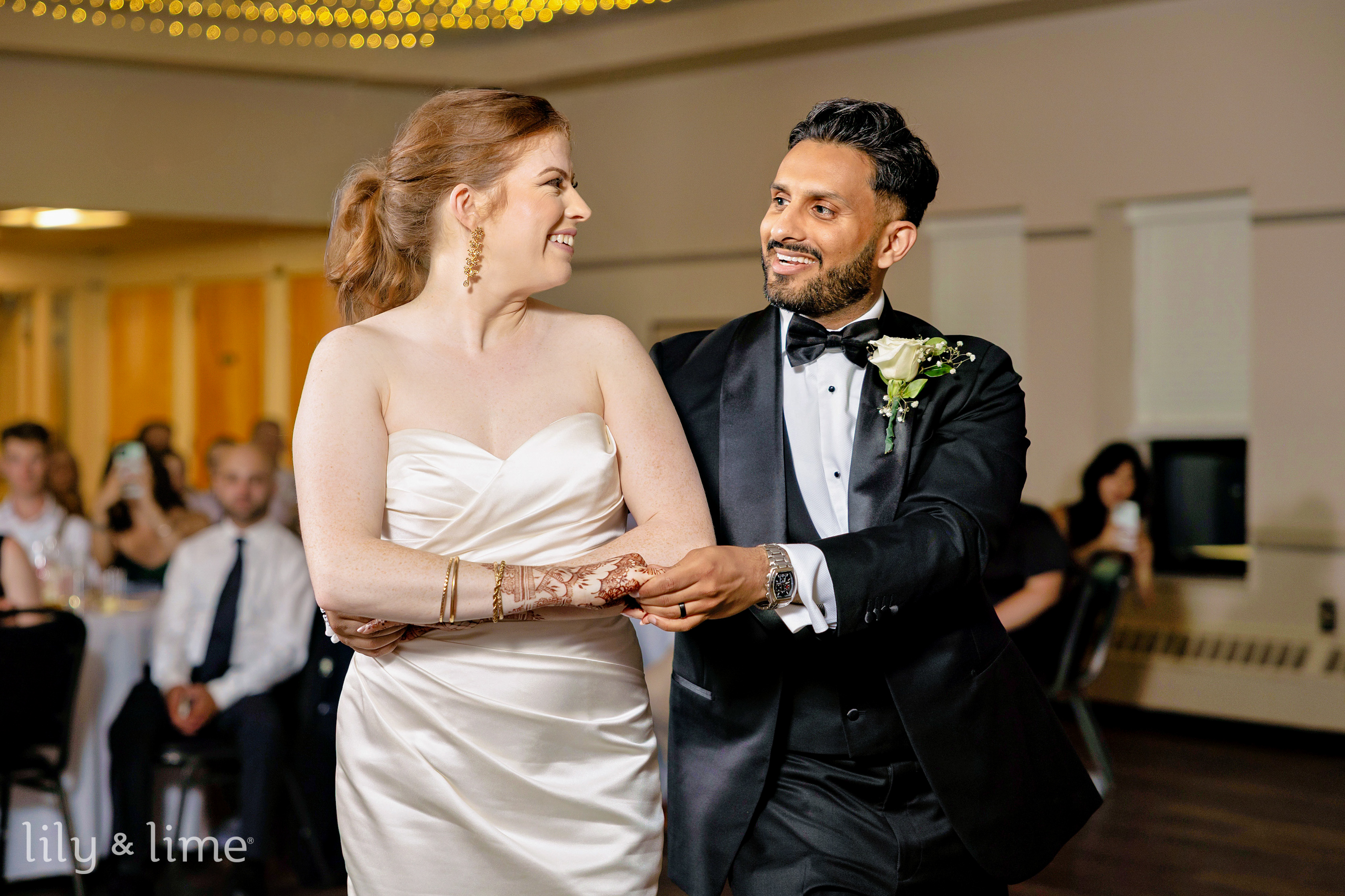 In her bridal suite, Tierney exuded grace as she prepared for her big moment, joined by her bridesmaids dressed in chic black dresses. For the reception, she transformed her look, donning a strapless silk wedding gown with off-the-shoulder sleeves and a timeless silhouette. Her look was completed with a soft, neutral makeup palette, a pastel peach bouquet, and a graceful ponytail. Bilal and his groomsmen, equally dashing in black suits, shared moments of camaraderie and laughter, creating memorable groomsmen portraits filled with energy and fun.
