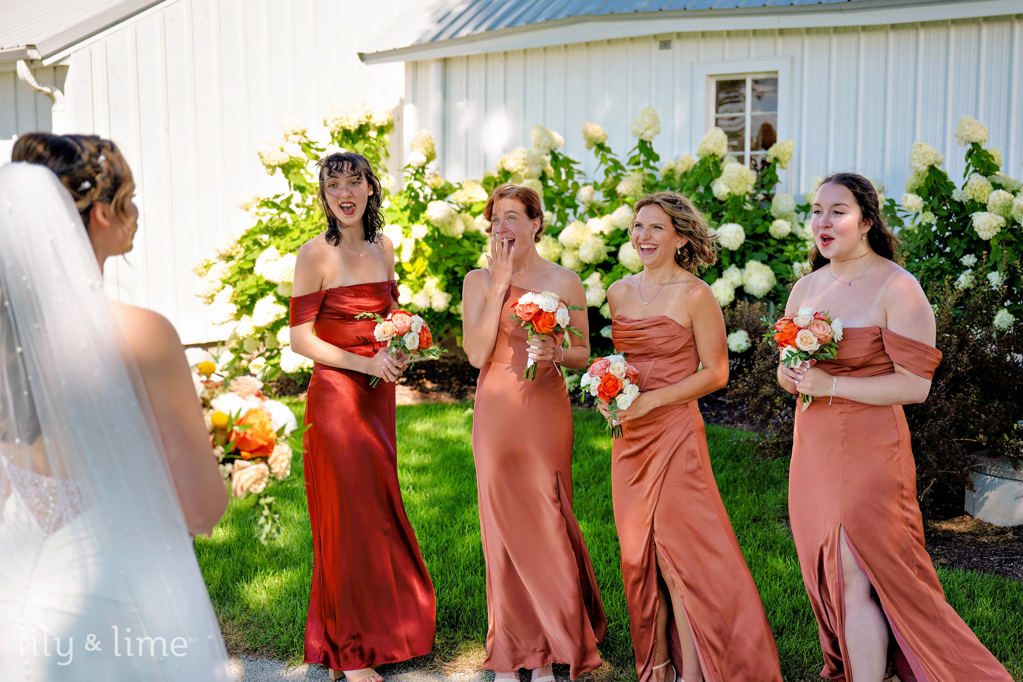 Meanwhile, Tim and his groomsmen were a picture of camaraderie and fun. Their portraits captured the infectious energy and strong bonds as they prepared for the main event. Tim was the definition of dapper in a dark green two-piece wedding suit, perfectly accented with a crisp white shirt, black silk necktie, and a silver tie pin. Eliana was a vision of modern romance in a chic strapless fit-and-flare wedding dress with delicate draped details. Her look was flawlessly completed with a sweeping cathedral-length veil, soft neutral makeup, and a gorgeous peach and cream bouquet. The wedding party was styled to perfection, with bridesmaids in elegant terracotta dresses and groomsmen in classic black suits.