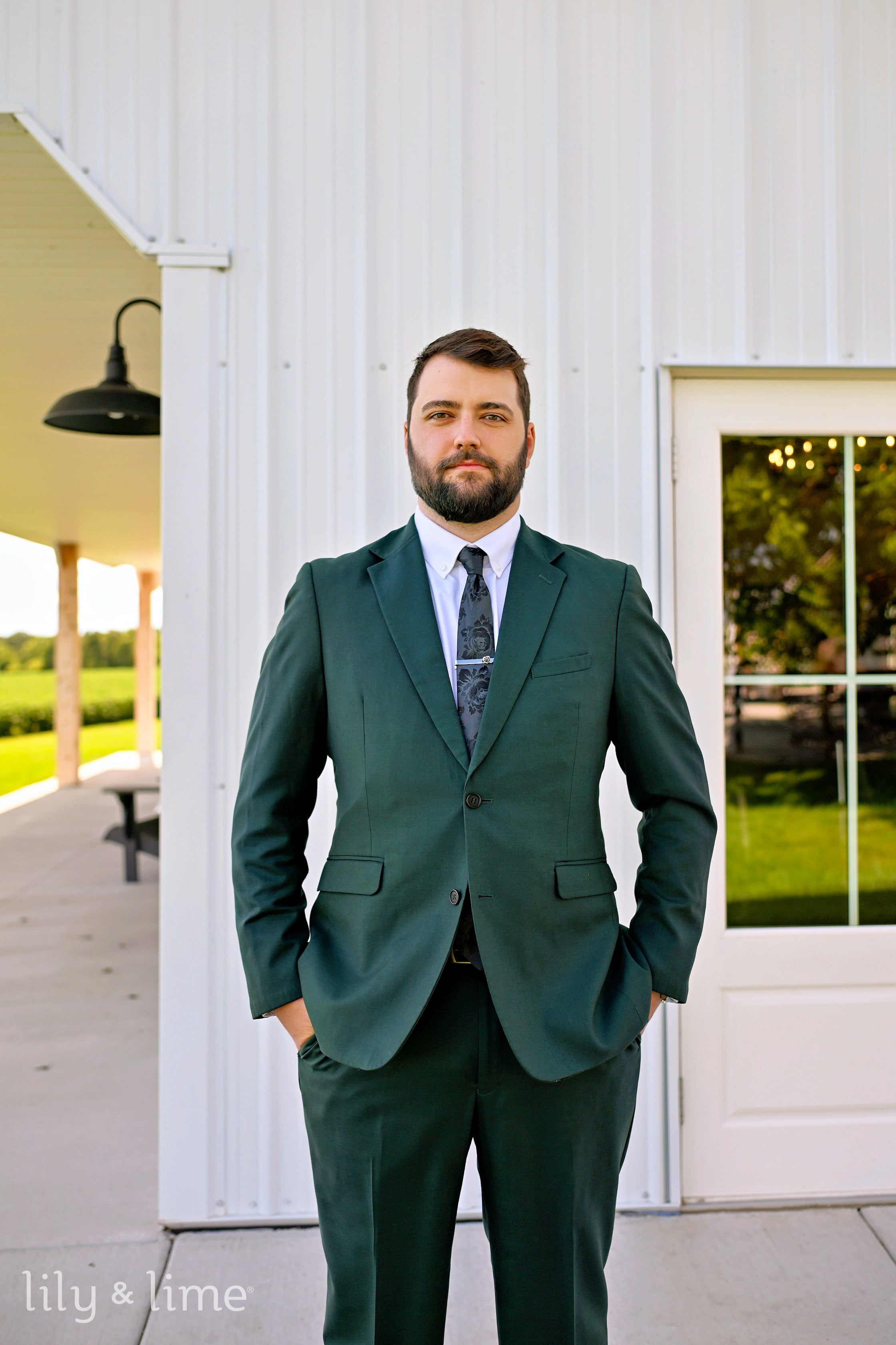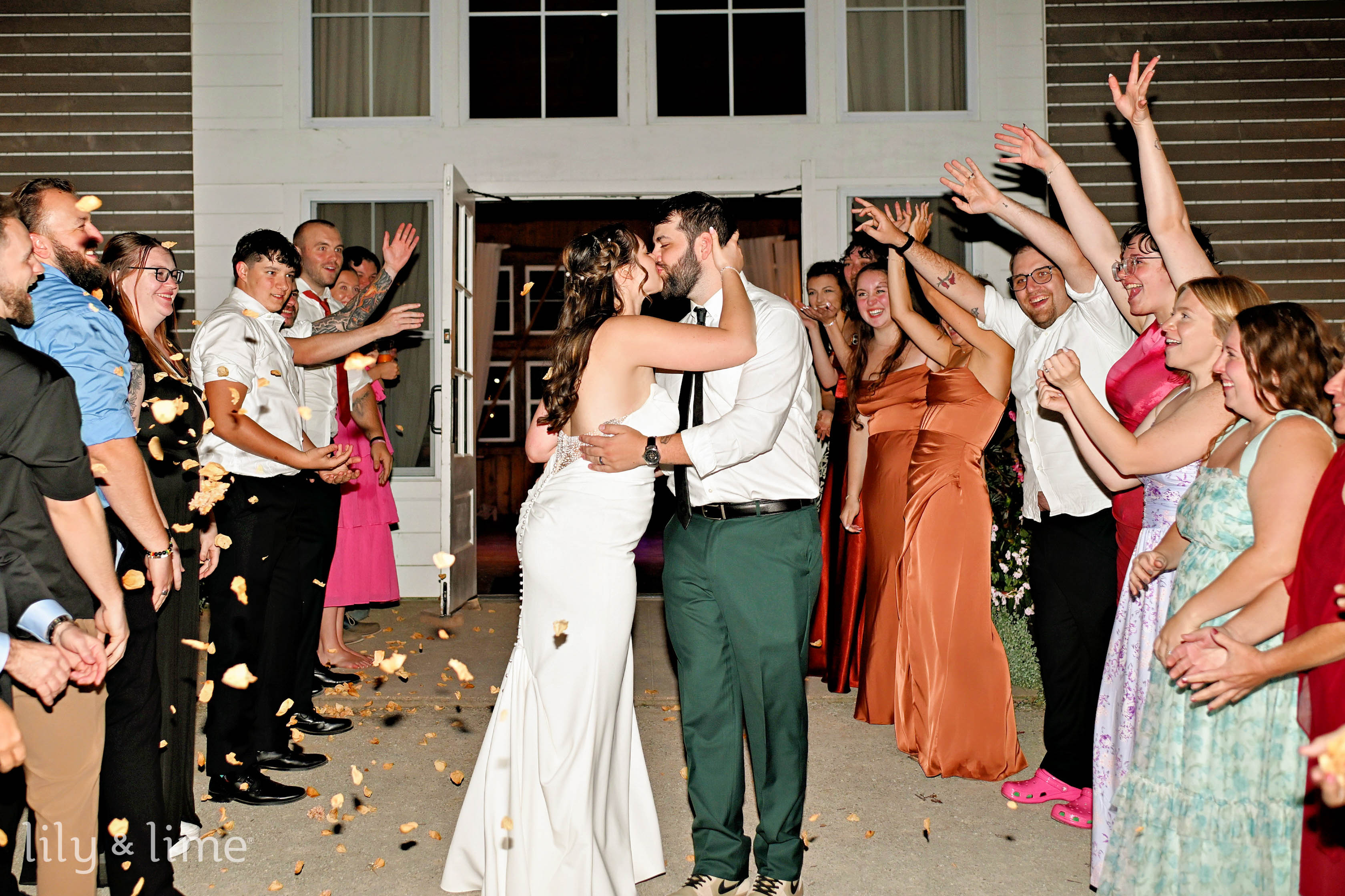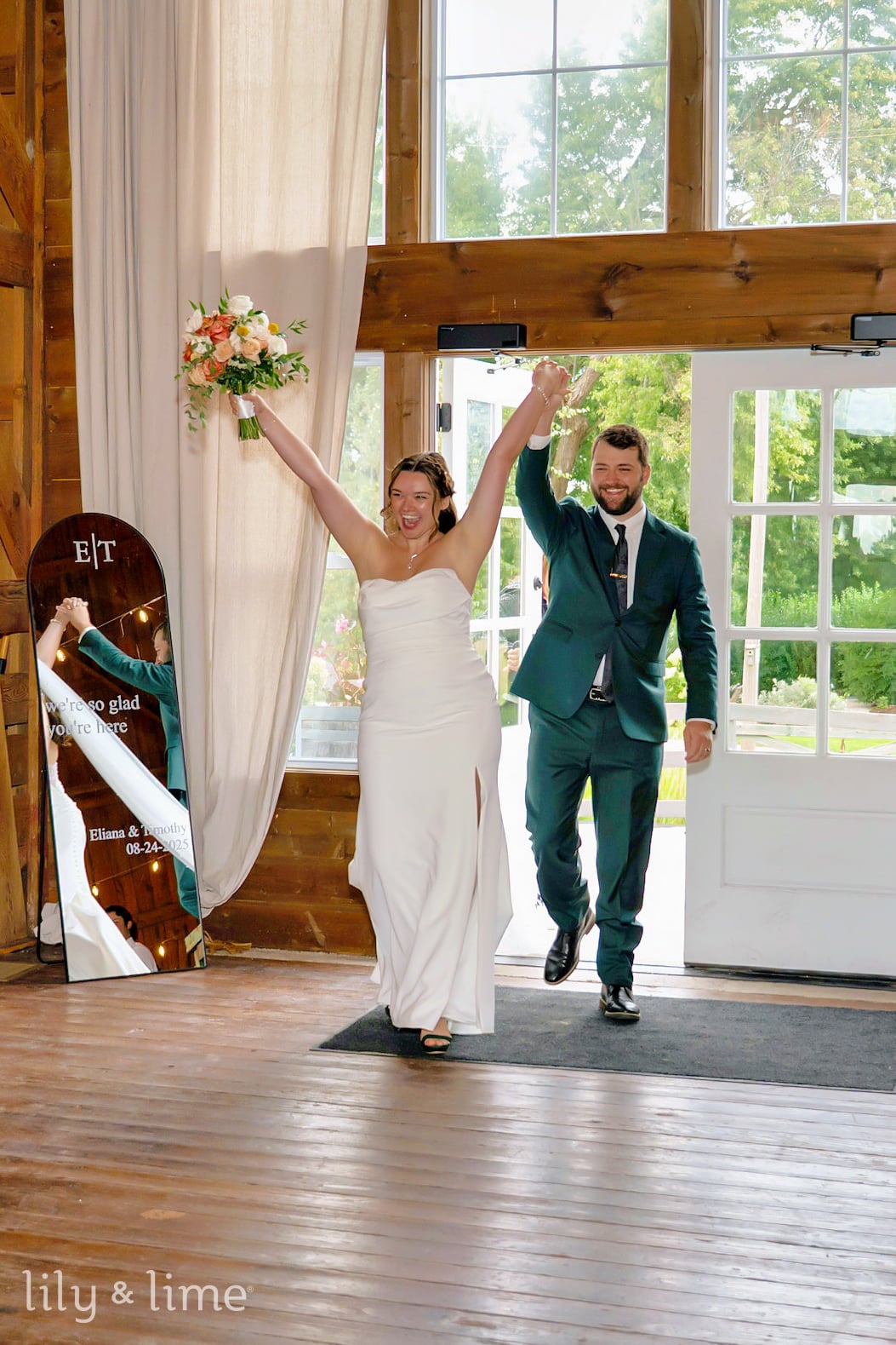 Afterward, guests mingled in the charming cocktail courtyard, illuminated by modern café lights, enjoying drinks from the outdoor bar and a relaxed atmosphere filled with yard games. The reception moved into the sophisticated white wedding barn, where stunning vaulted ceilings and exposed beams created an unforgettable setting for dinner and dancing. The venue also features unique, dedicated spaces like the bright and airy Carriage House for bridal preparations and the Groomsmen Garage, a perfect retreat with a bar and golf simulator.