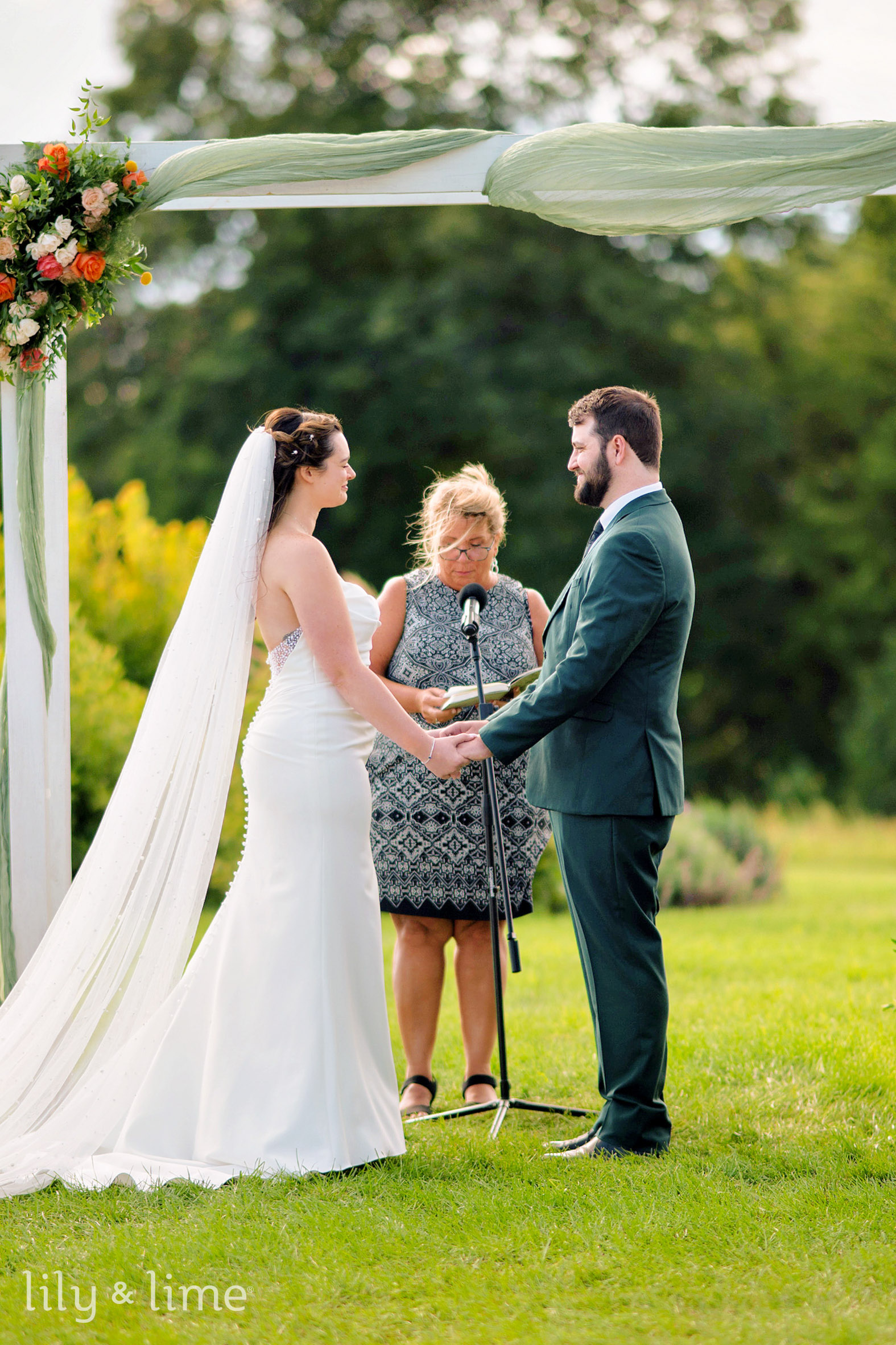 The outdoor ceremony felt like a scene from a dream. Beneath a brilliant blue sky dotted with fluffy clouds, Tim and Eliana exchanged their vows. They stood before a simple, beautiful arch adorned with soft drapery and fresh florals, creating an intimate and emotional atmosphere. The raw emotion of their promises and the joyous smiles they shared were truly unforgettable.