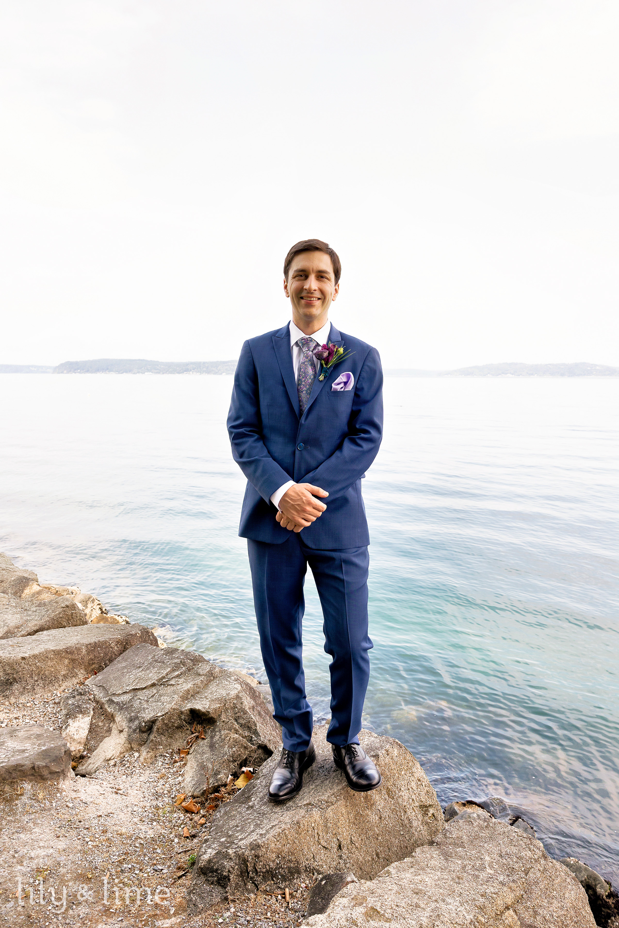 Meanwhile, Zachary and his groomsmen were having their own share of fun in their suite. The groomsmen looked sharp in black suits with blue or purple ties, while Zachary stood out in a dapper two-piece blue suit paired with a crisp white shirt, shiny black shoes, and a printed blue necktie. His boutonniere featured a purple floral detail that tied his look together perfectly, complementing the rich tones of the wedding color palette.