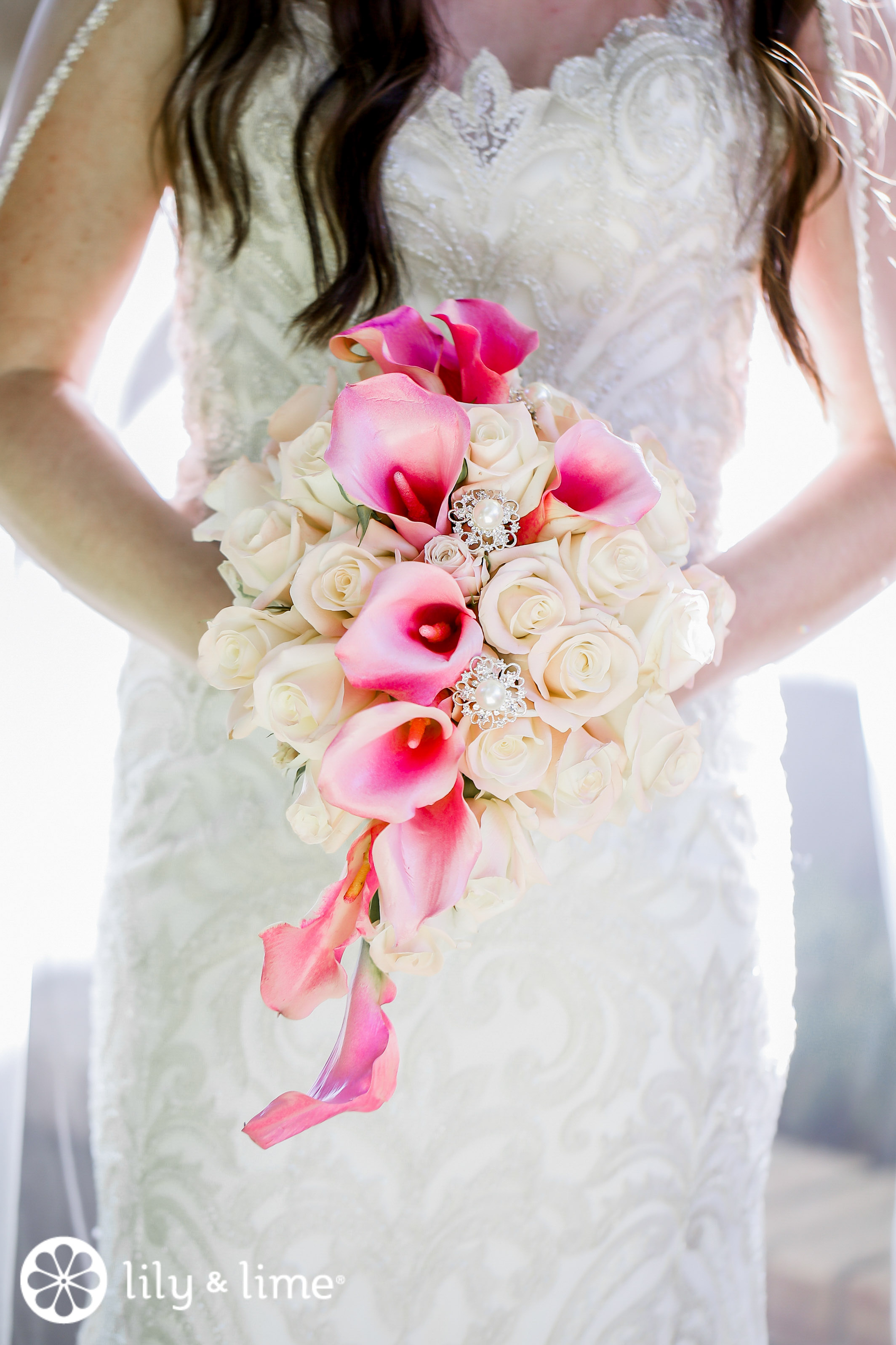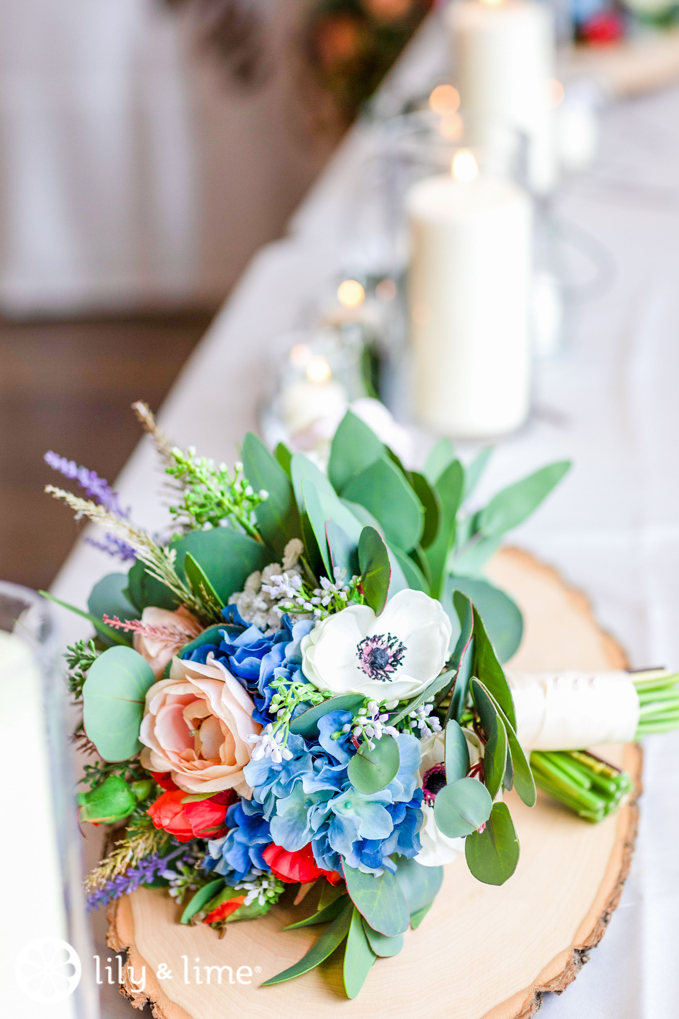 Wedding bouquet arrangements should be easy for you to make because they should reflect your personality and come from the heart. To create your unique mix, choose locally grown flowers, foraged flowers, picked straight from the garden, or fill in with loose stems from a nearby florist or farmers market. Add a final flourish by wrapping the base in ribbon or adding long trails of fabric to give it some flow. A shirt cuff or piece of fabric from your grandmother's wedding dress can also add a touch of sentimentality. Pins, a priceless brooch, or a sentimental object can be used to secure which can go on to become your "something borrowed" idea.