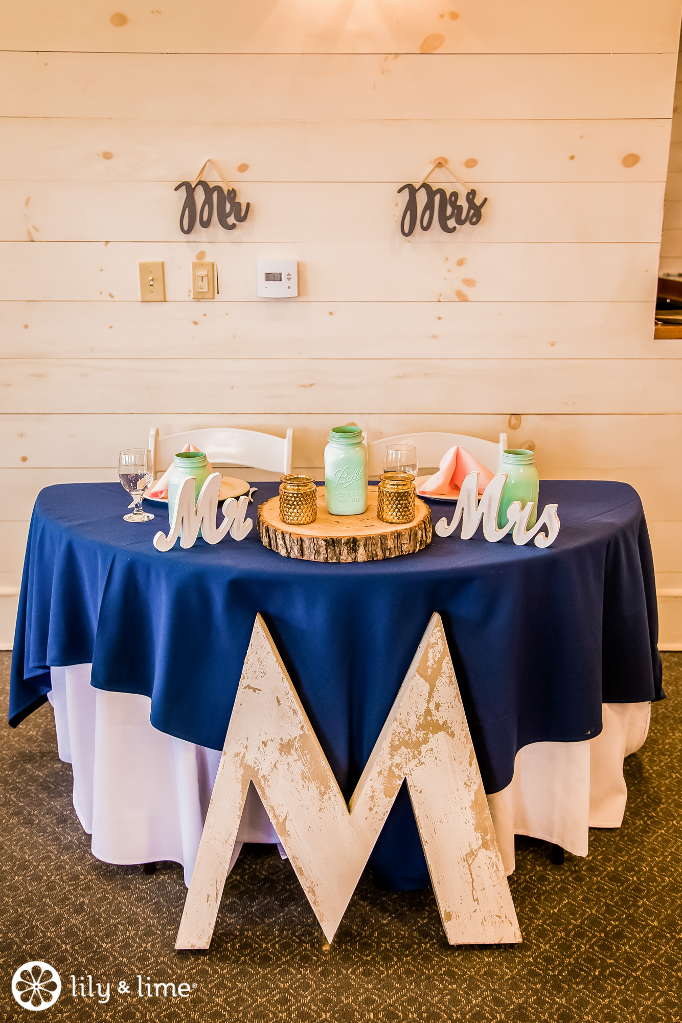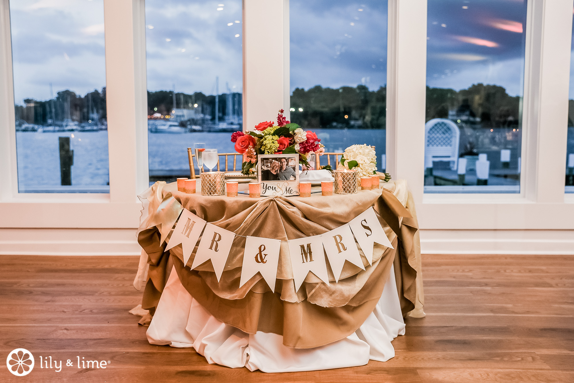 A sweetheart table is a simple way to amp the decor of the reception space without adding too much more to the budget (a rare and appreciated occurrence in wedding planning).