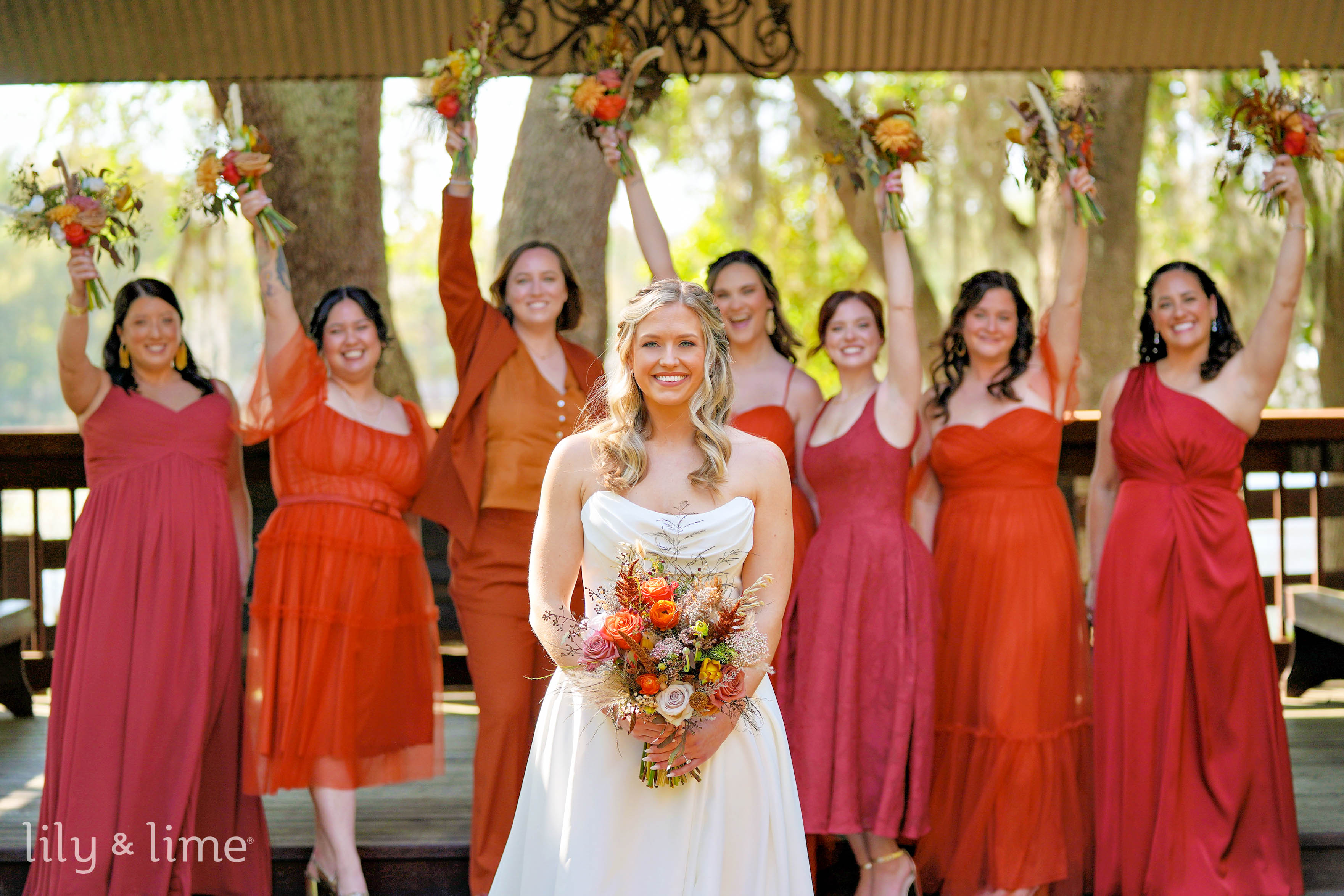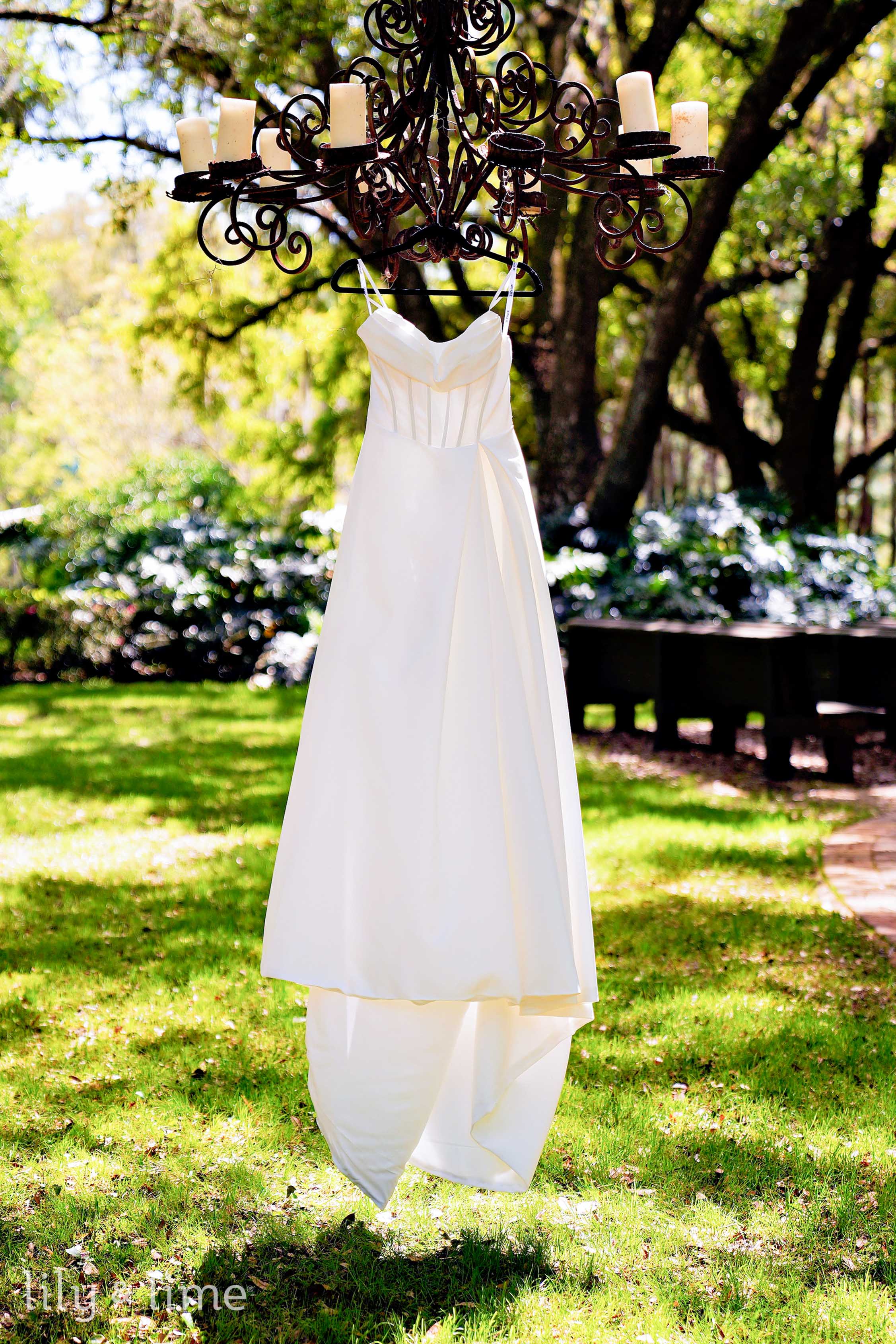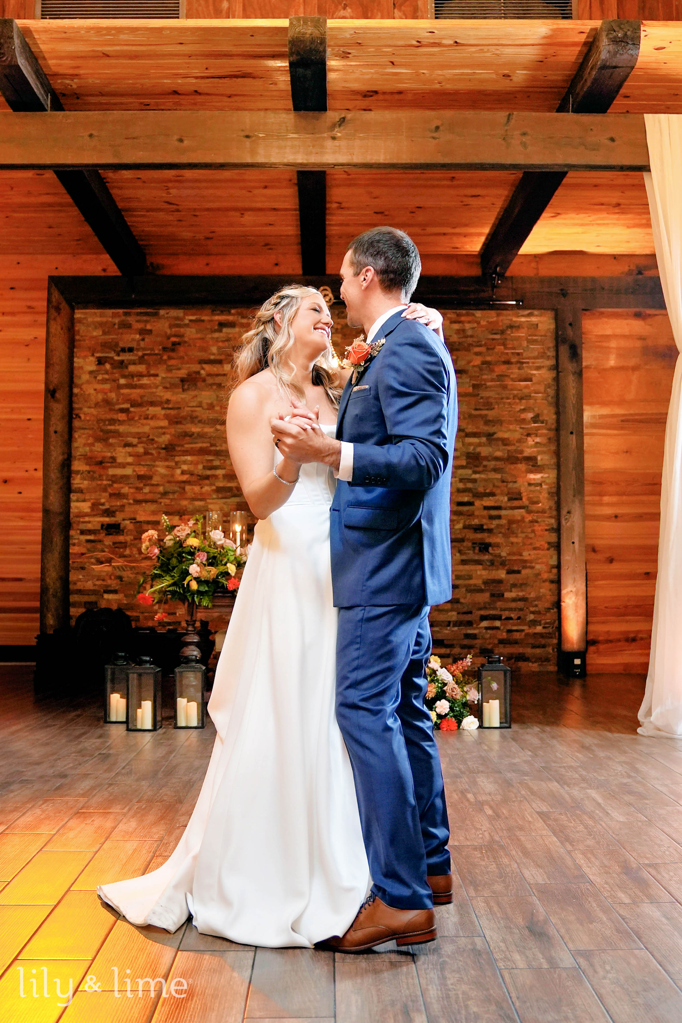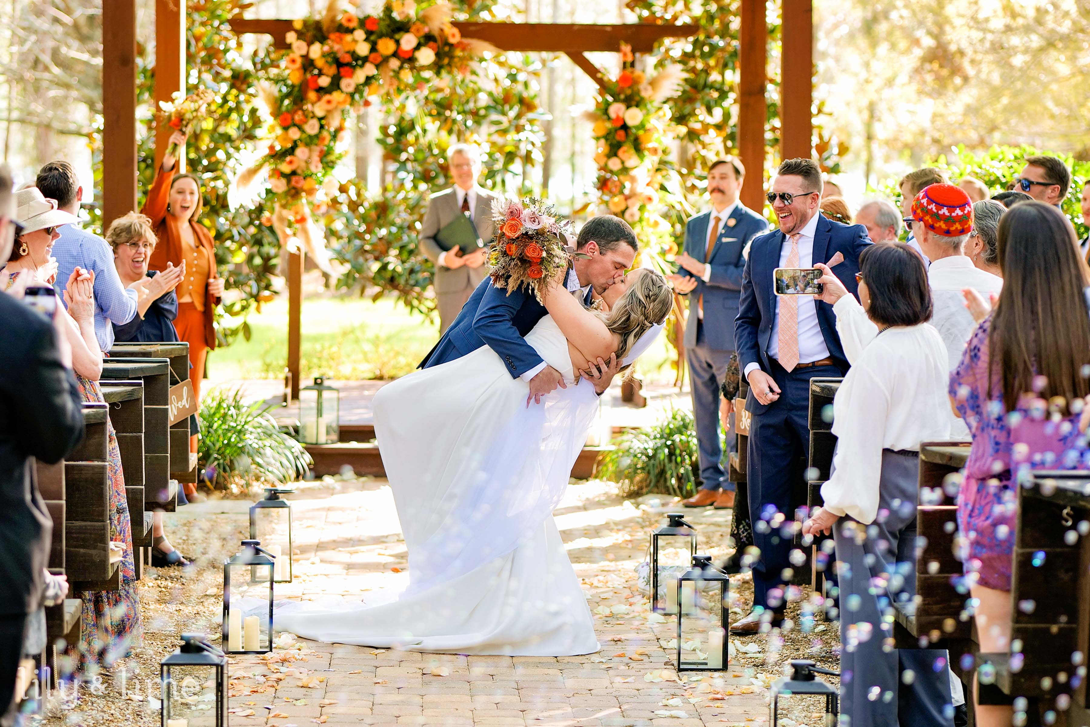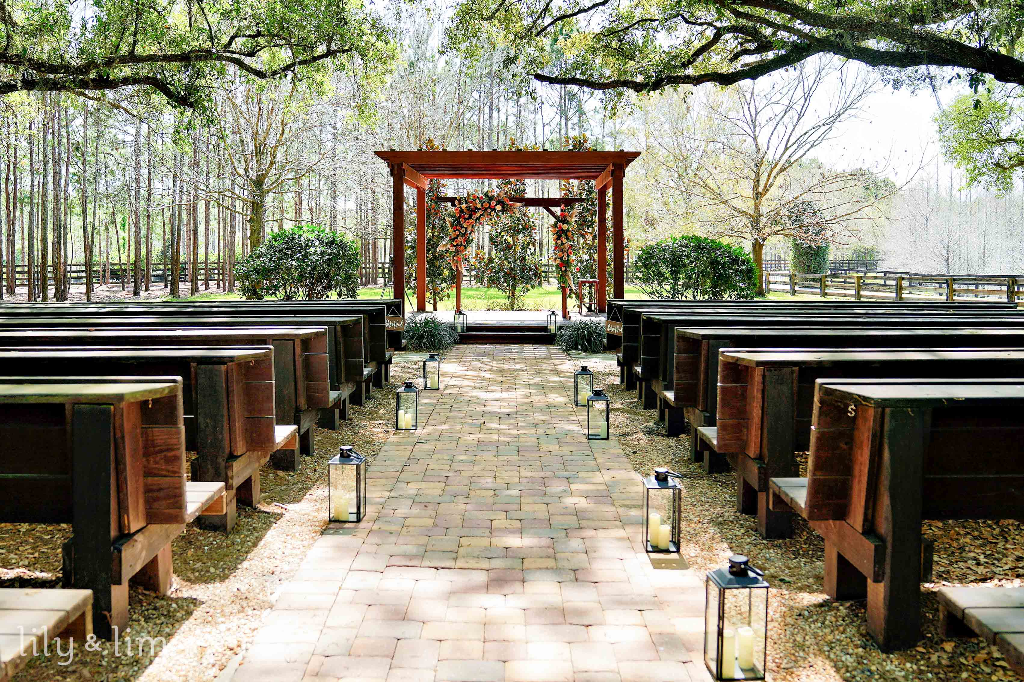 The ceremony took place under a canopy of ancient oak trees draped in Spanish moss, creating a dreamy, ethereal setting. The soft rustling of leaves and the gentle reflection of sunlight on the lake added a magical ambiance to their vows. The reception area, with its open-air pavilion and warm wooden accents, offered a seamless blend of rustic charm and modern sophistication. Twinkling string lights and lush floral arrangements enhanced the space, creating an inviting atmosphere for celebration.