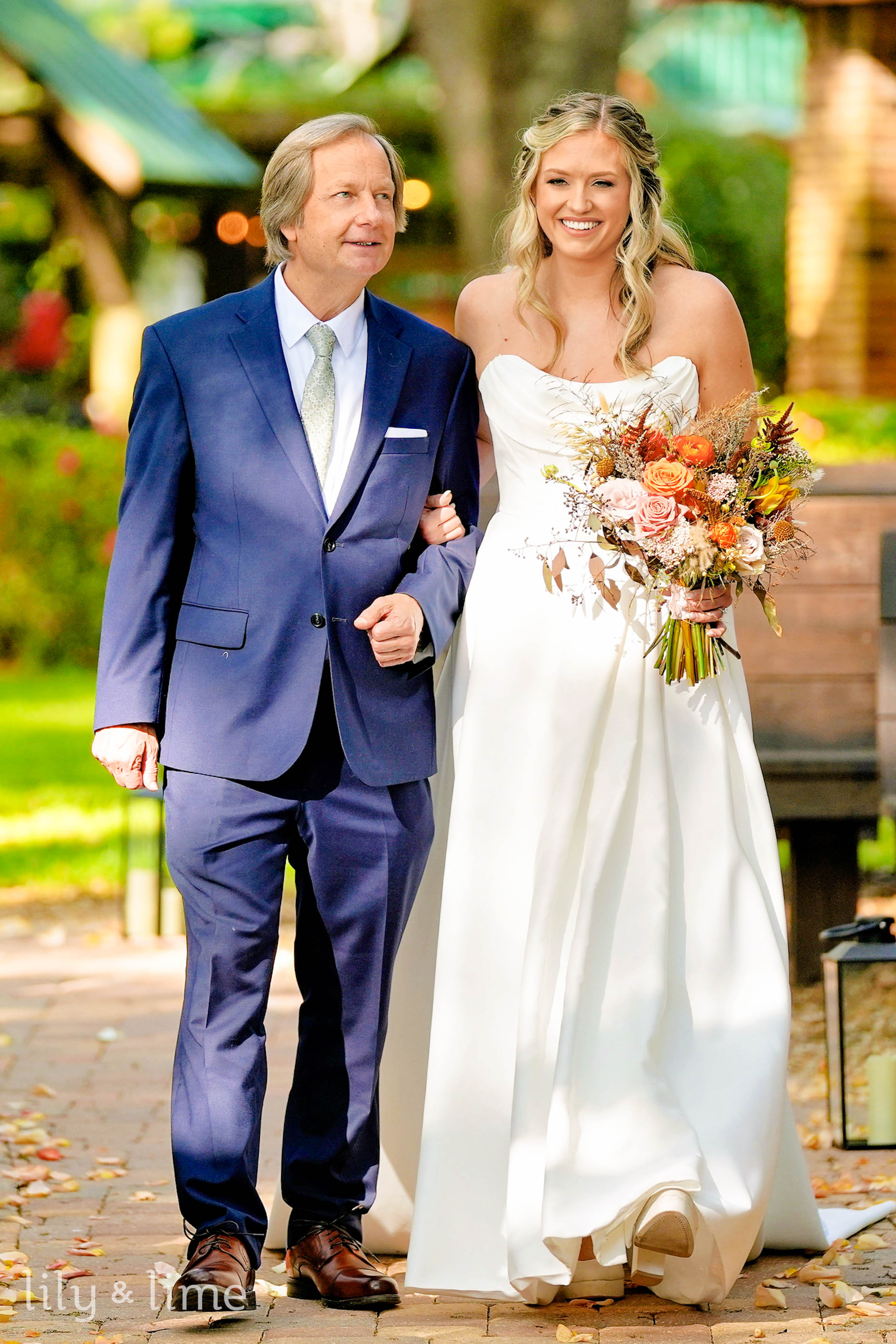 Emily looked breathtaking in her chic strapless wedding dress, featuring a long train, a minimal silhouette, and a buttoned-down back. Her cathedral-length veil, wildflower bouquet, and neutral bridal makeup added a touch of timeless elegance. Daniel was equally dashing in his royal blue two-piece suit, paired with a crisp white shirt, shiny brown shoes, a beige tie, and an orange rose boutonniere. The wedding party complemented the couple beautifully, with bridesmaids in mismatched orange and pink dresses carrying wildflower bouquets, and groomsmen in stylish royal blue suits.