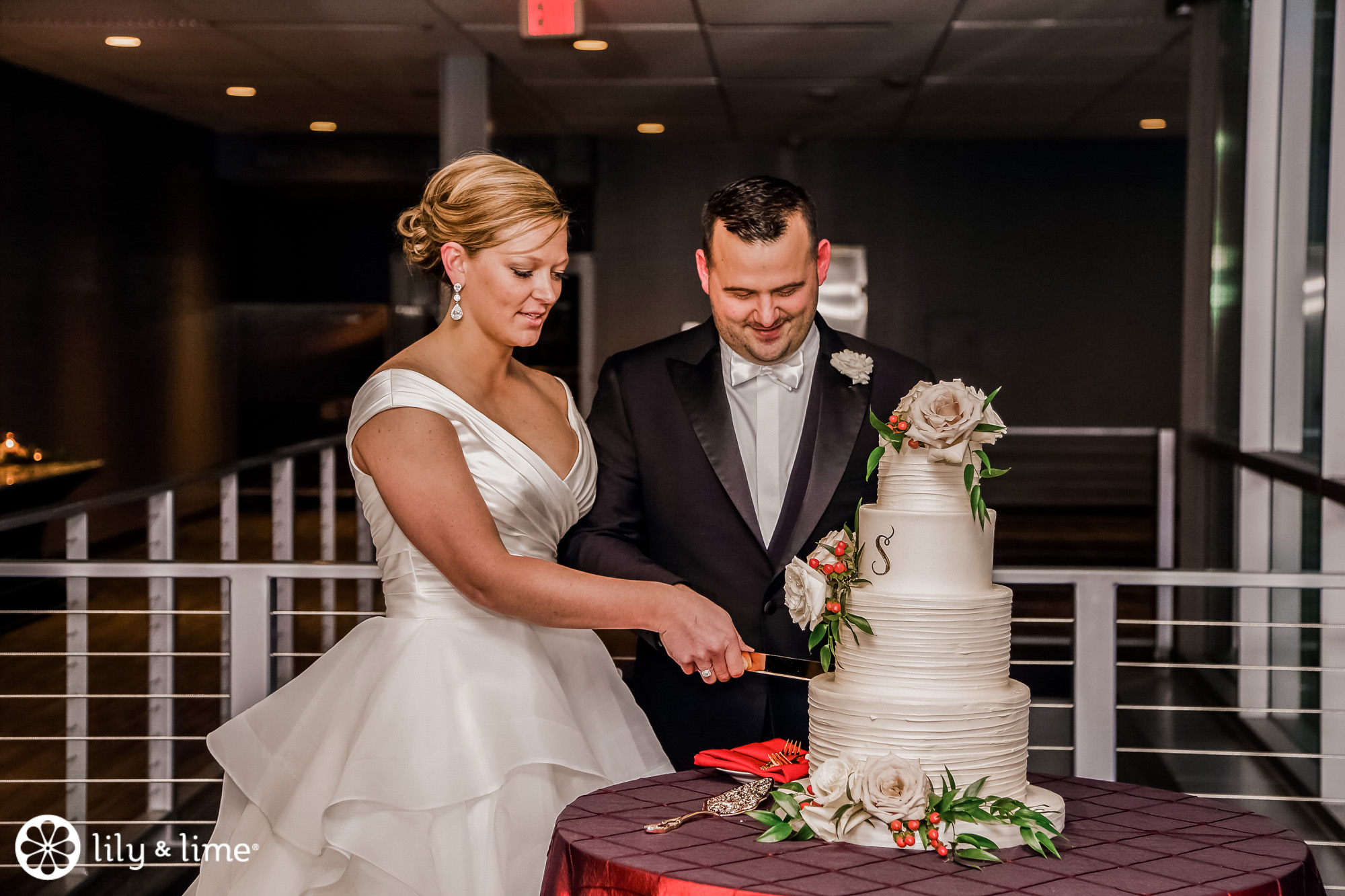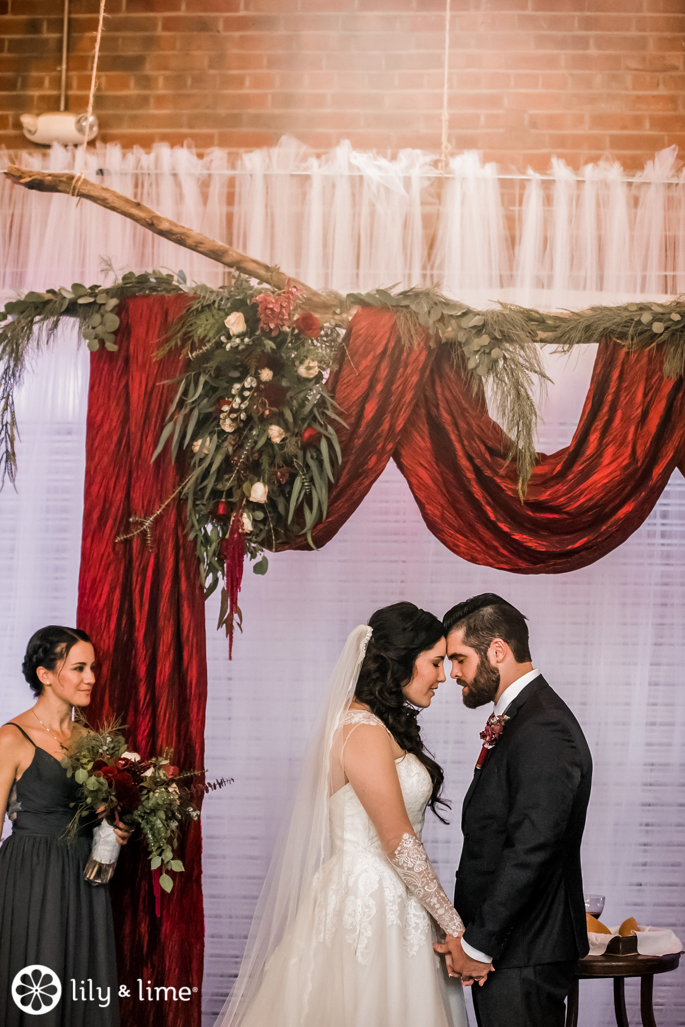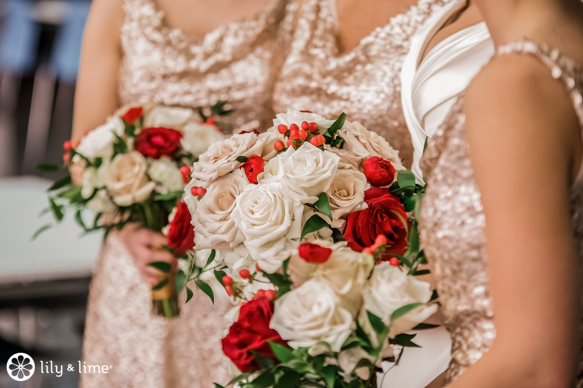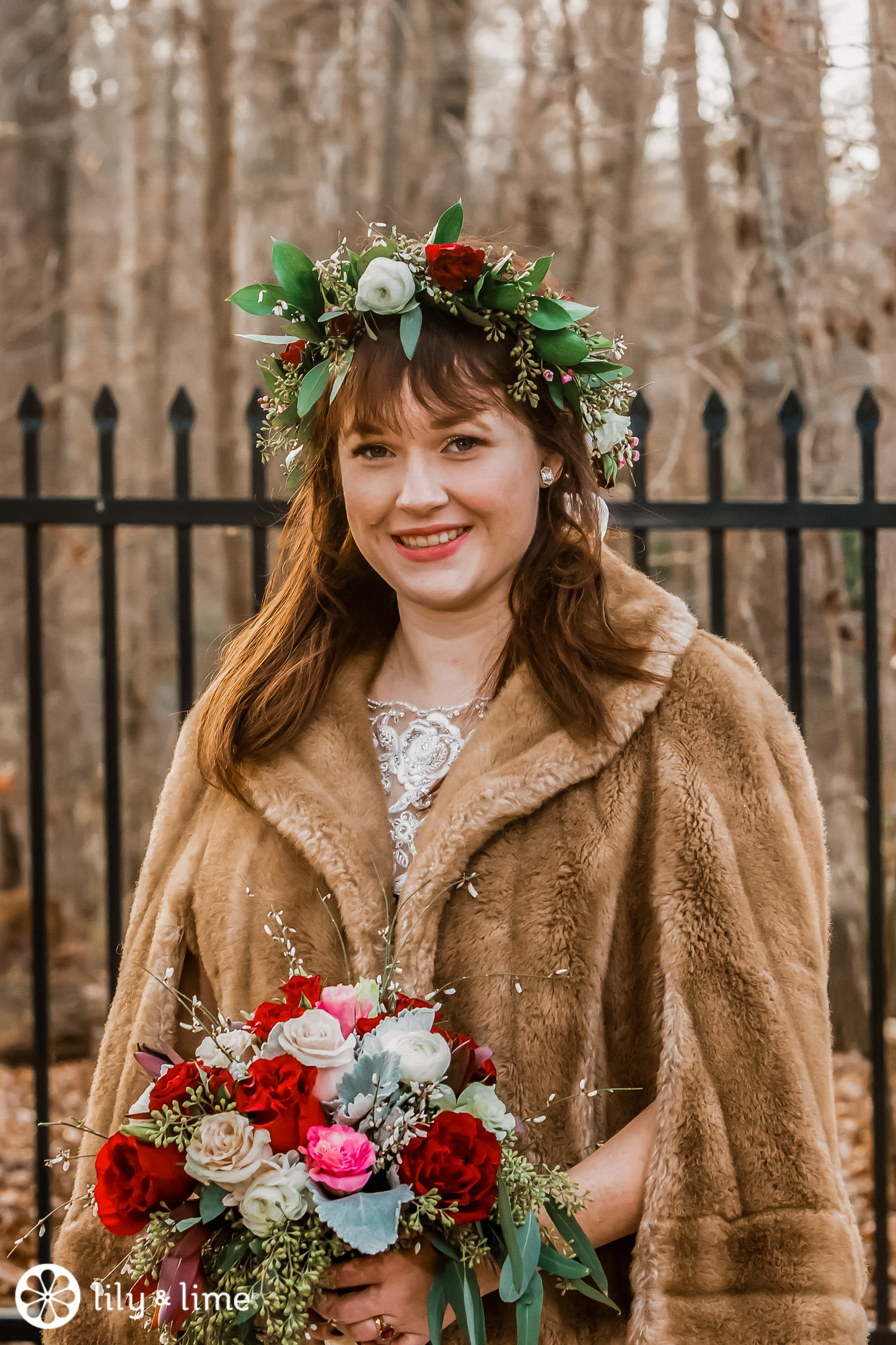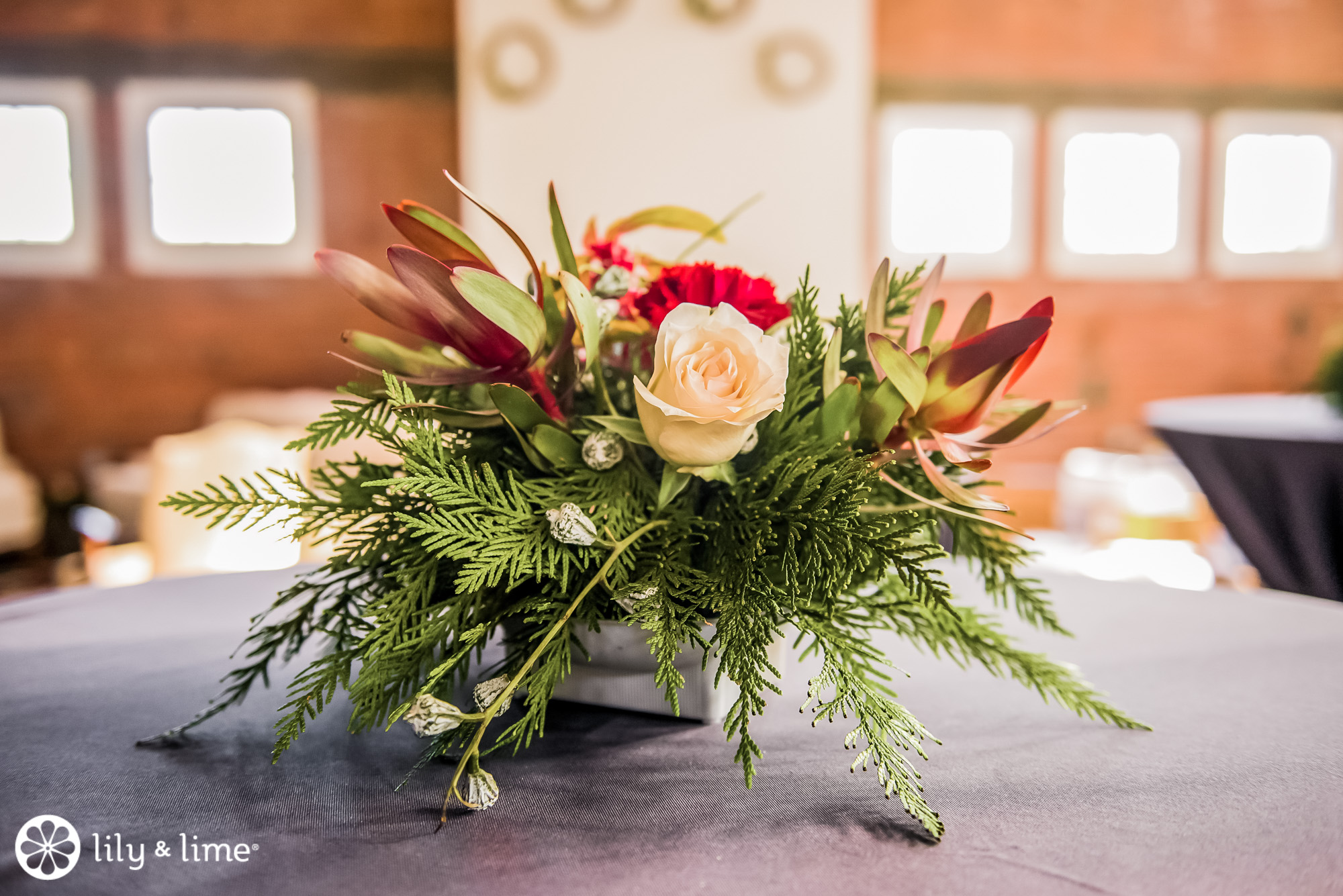 Greenery brings vivaciousness to winter wedding festivities. You can incorporate greenery and winter florals into bouquets, boutonnieres, and weave it into the ceremony decor to celebrations with the lifeforce and conviviality of the Ghost of Christmas Present. All white bouquets with a pop of red berries fit this theme perfectly, too!