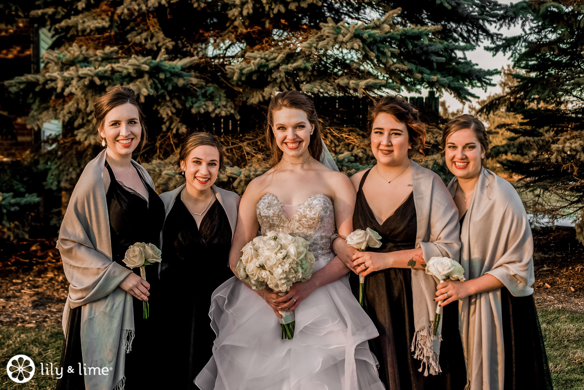 You can choose photo-friendly gifts for your wedding party. Gift plaid scarves to the groomsmen and stylish wraps or shawls to the bridesmaids. It'll keep them warm in their formal wear, and it looks great in photos.