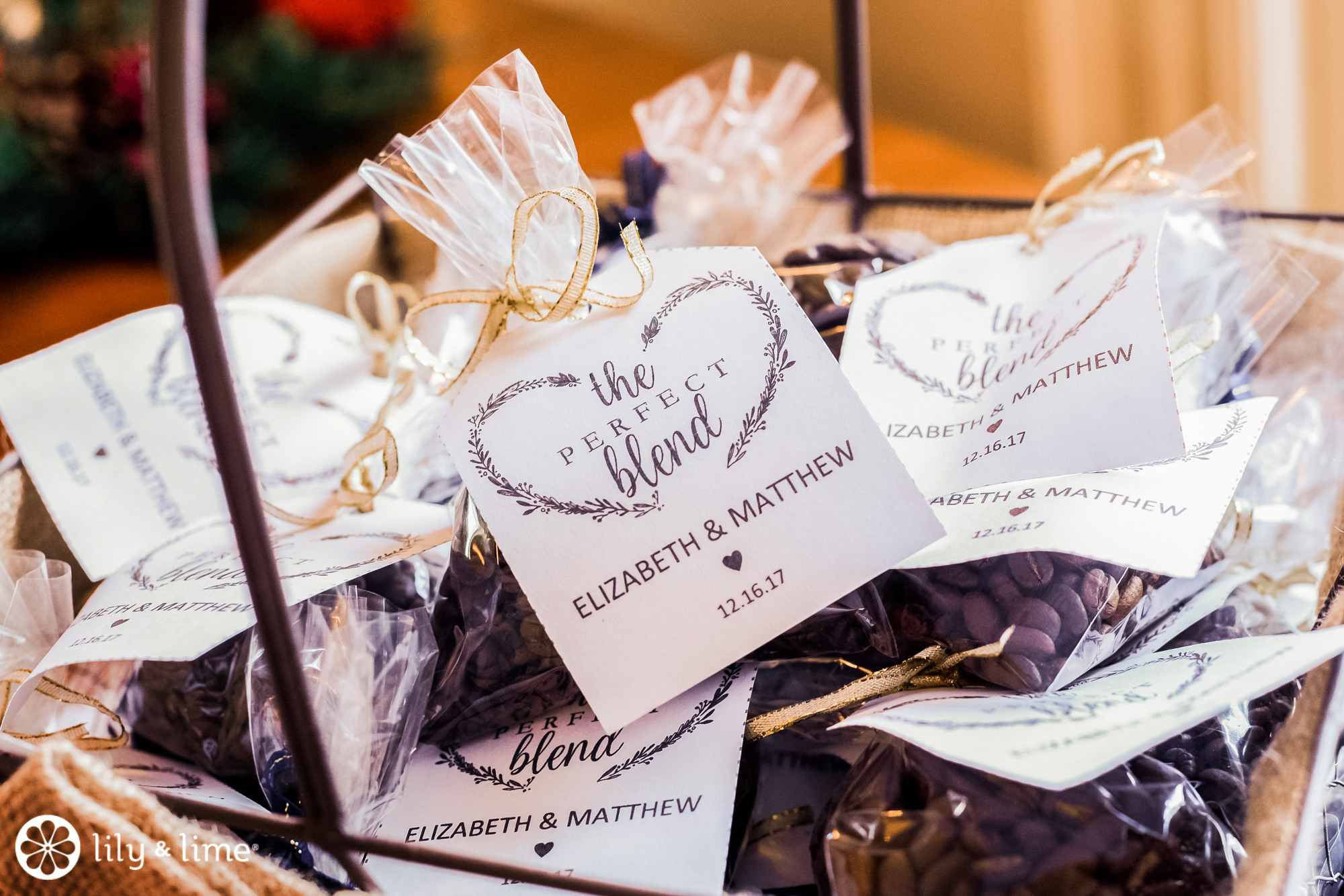Send your guests home with hot drinks. Warm beverage favors like coffee, hot cocoa, tea, or even a hot toddy kit are sure to be a big hit!