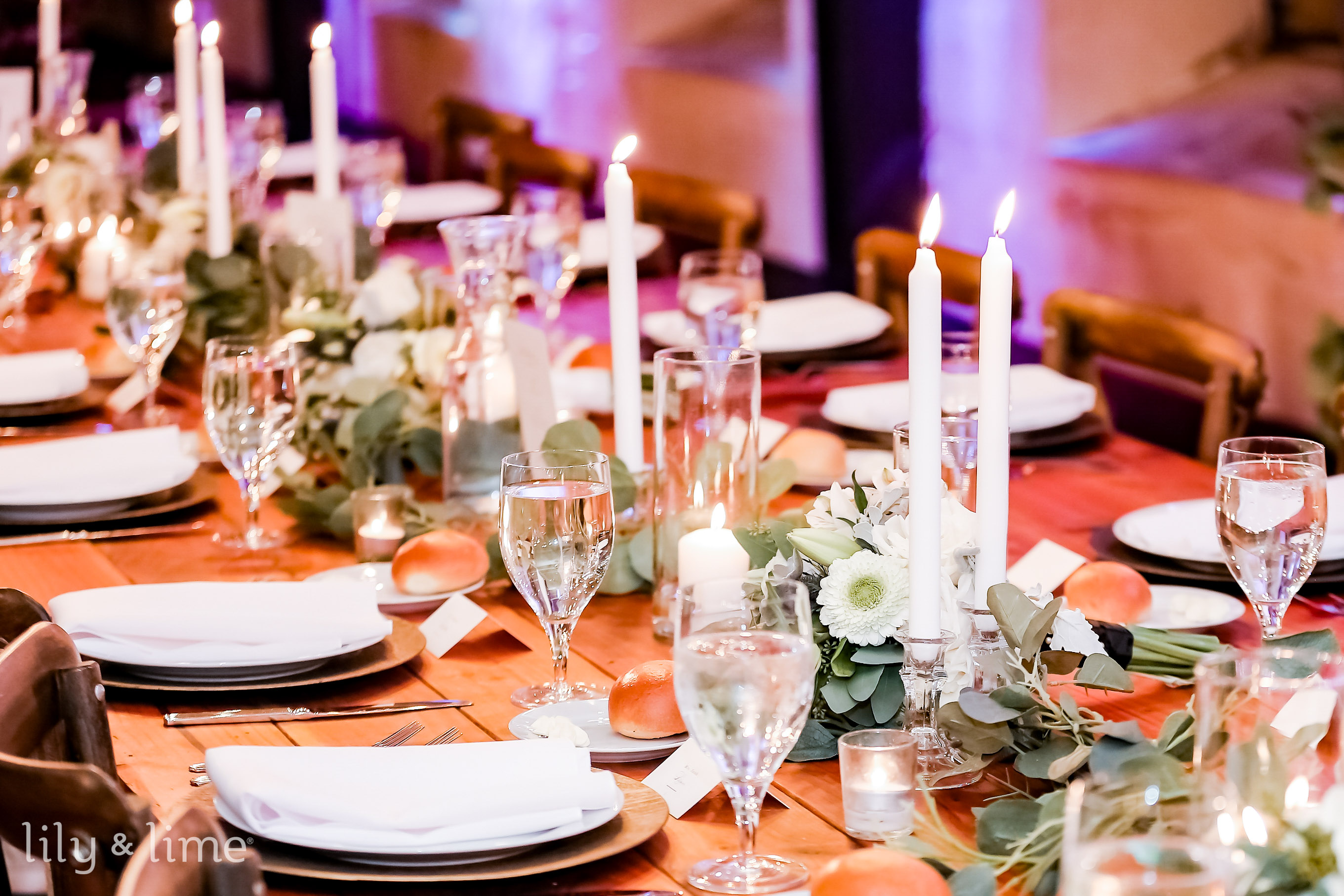 Candlelit Elegance: Nothing sets a romantic winter mood quite like candles. Create a candlelit winter wedding tablescape with varying heights of candles, such as pillar candles, tea lights, and taper candles. The warm glow of the candles will fill the room with a cozy ambiance. A pristine white tablecloth serves as a canvas for our winter fantasy, adorned with delicate faux snow that glistens beneath the soft, flickering glow of countless candles. Nestled among the candlelight, crimson berries and rustic pine cones add a natural touch of warmth, creating a perfect balance between the icy serenity of winter and the coziness of love. This tablescape is a symphony of winter's finest elements, inviting couples to embrace the dreamiest of winter weddings, where love and nature harmonize in a breathtaking display of romance.